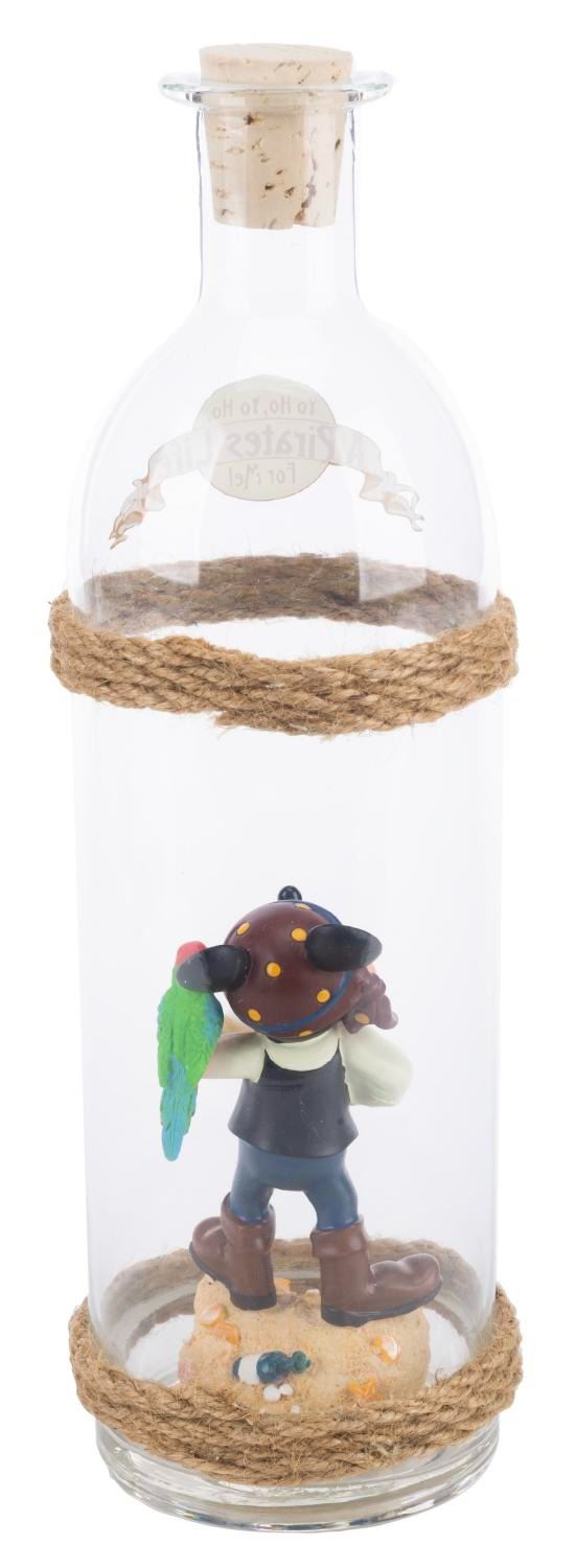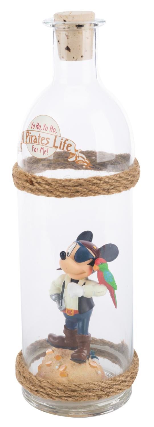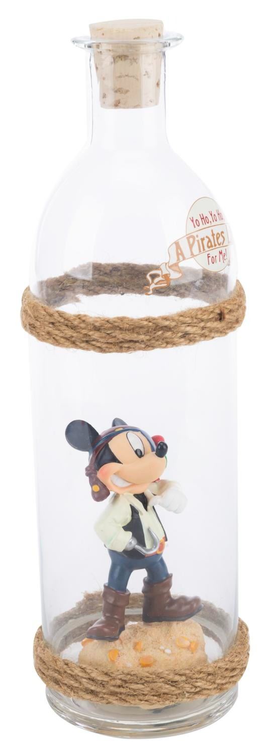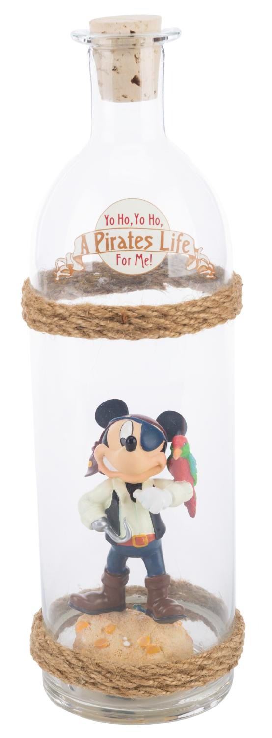 (Disney, 1990s-2000s) A Pirates of the Caribbean-branded bottle featuring Pirate Mickey and a parrot inside. Measuring 3.25” in diameter and 11.25” tall, the bottle is in fine condition with the original Park price tag on the bottom.