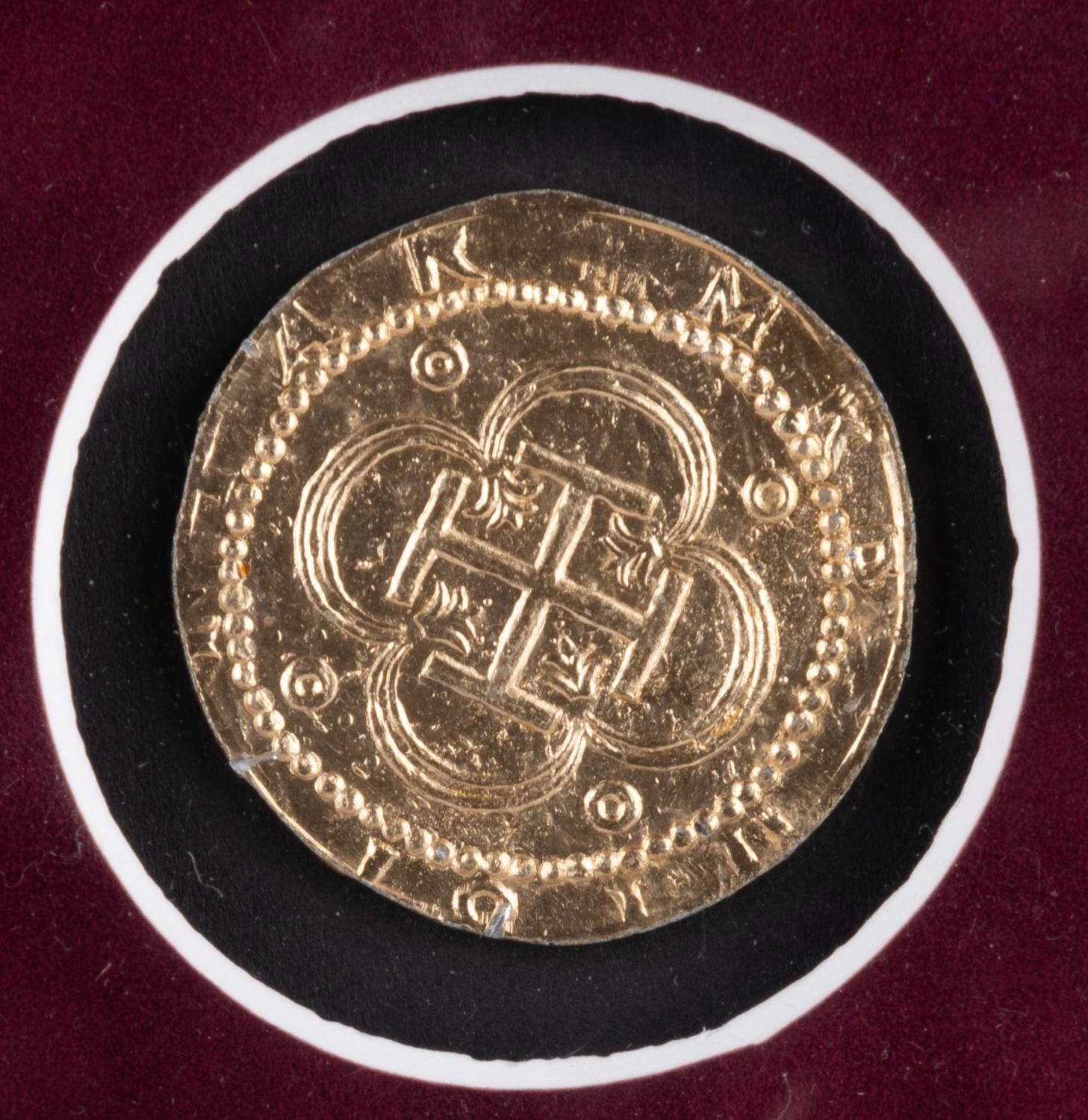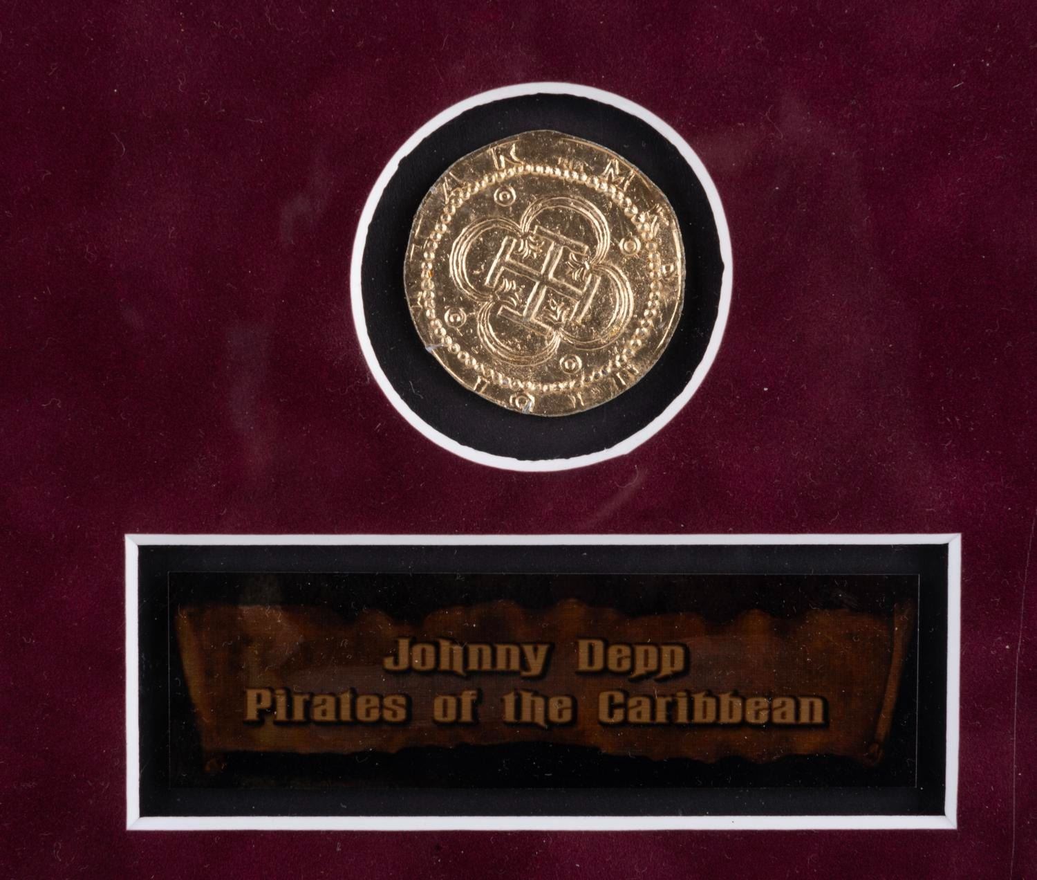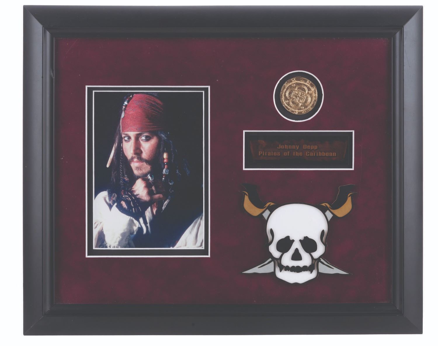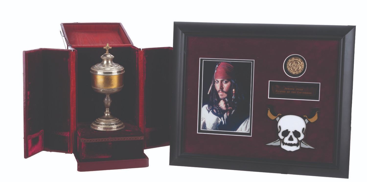 (Disney, 2003) An Isla de Muerta treasure prop chalice with a leather case, and a doubloon presented in a custom display from "Pirates of the Caribbean: The Curse of the Black Pearl.” The brass chalice measures 3.25” in diameter and 8” tall in a 6.5” x 6.5” x 12” leather case with a velvet lining, and both display in good condition with tarnish to the chalice and scuffs and tears to the case. Measuring 1.5” in diameter in a 13.75” x 16.5” matted frame, the doubloon is in fine condition with a light scuff to the frame.