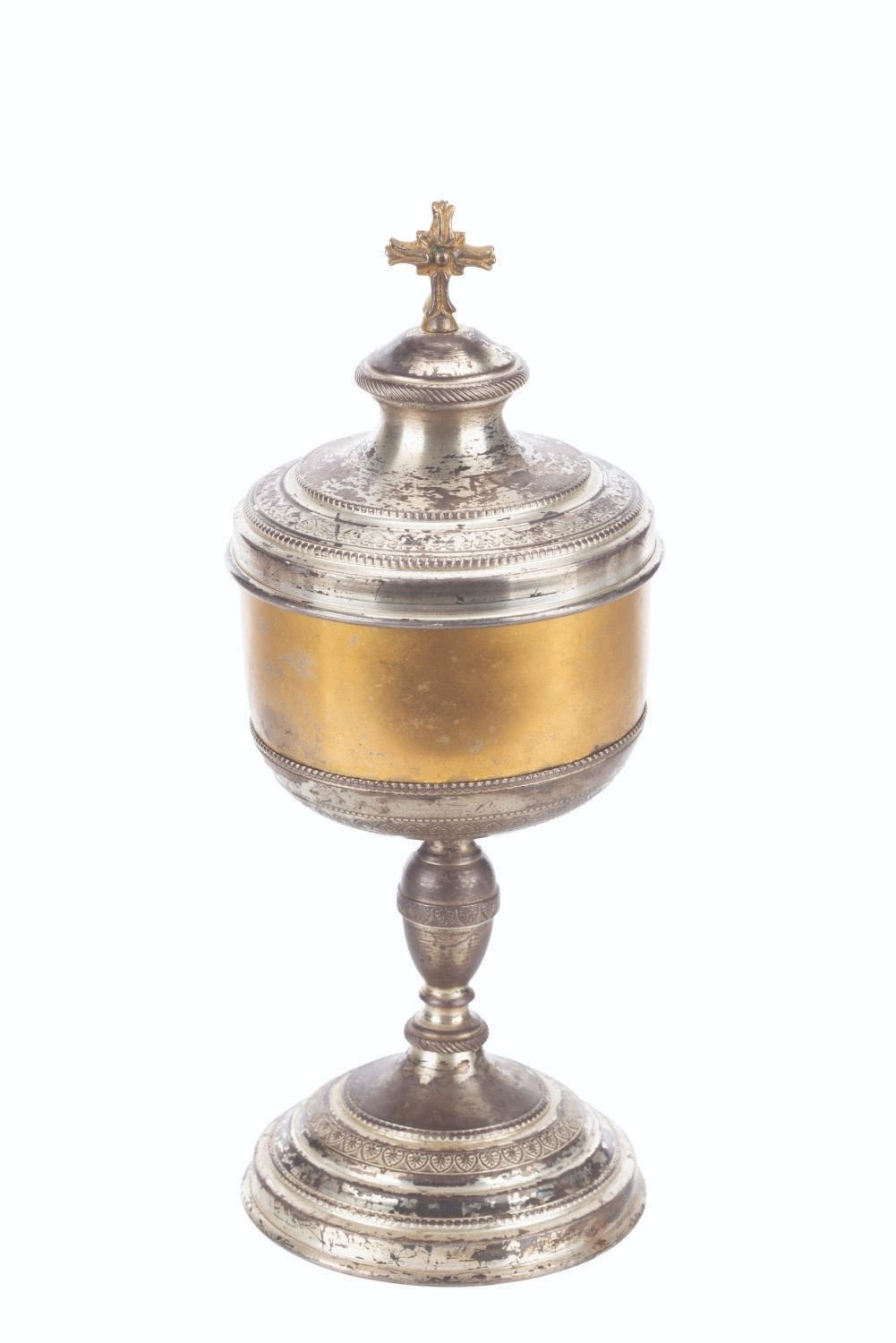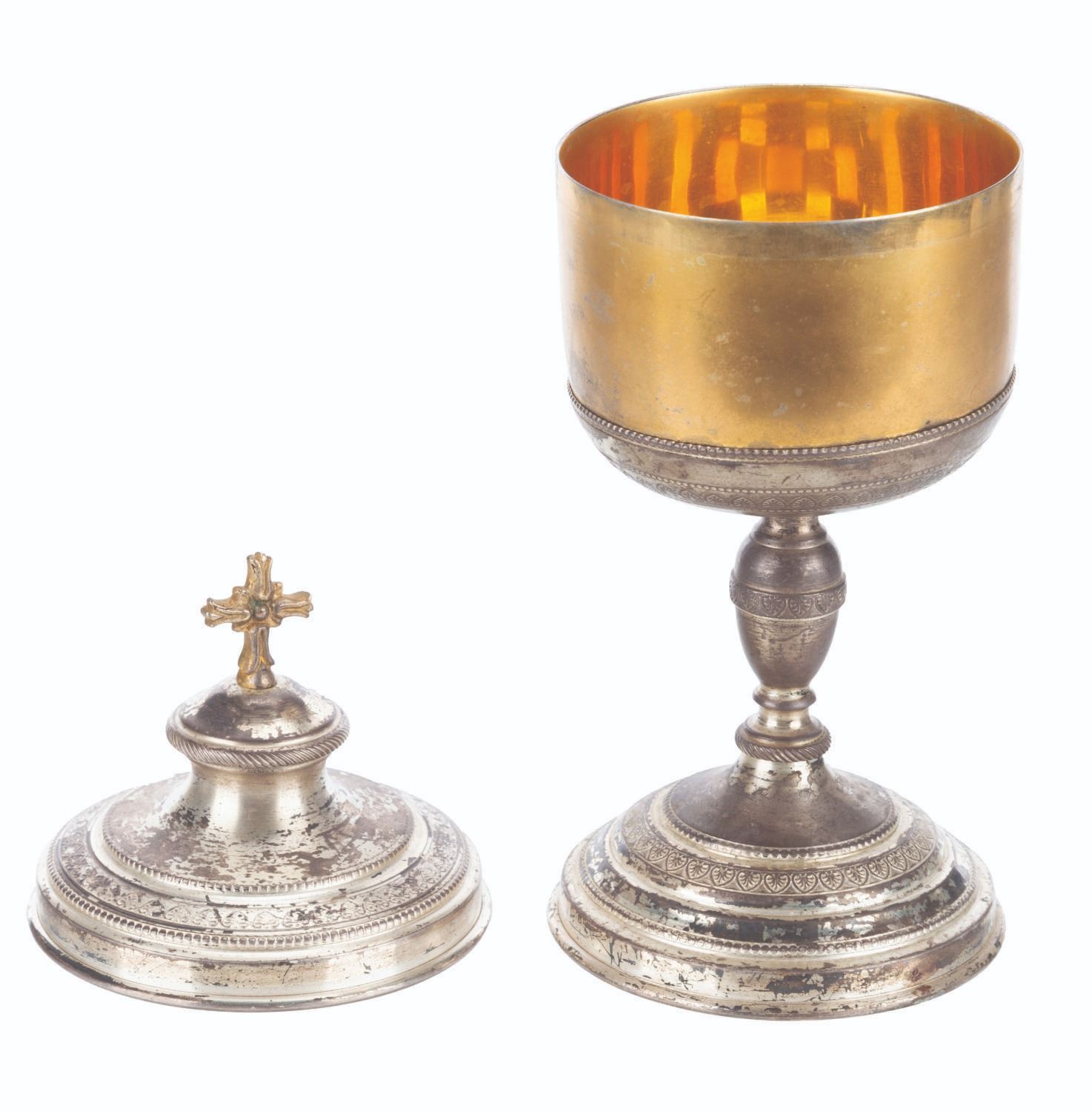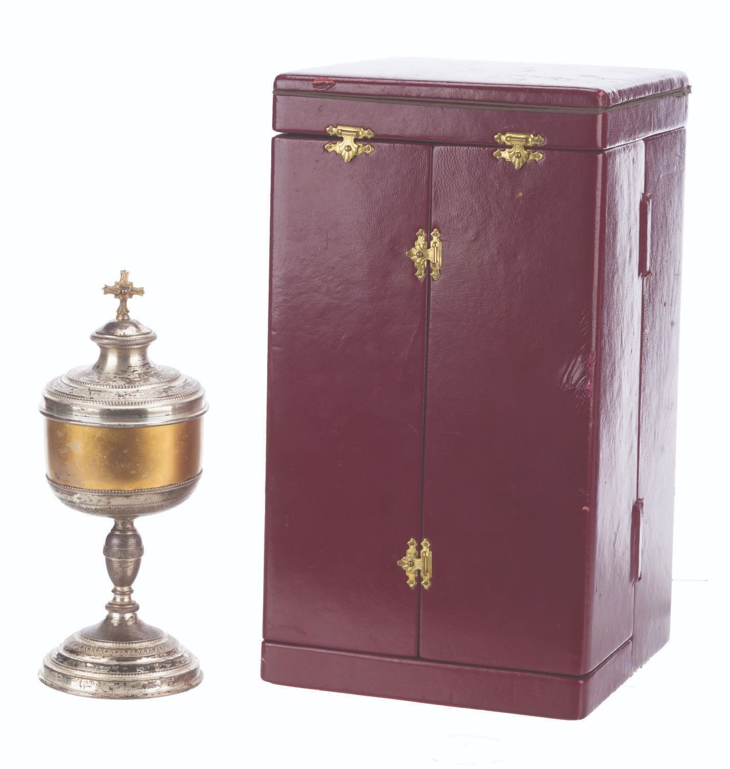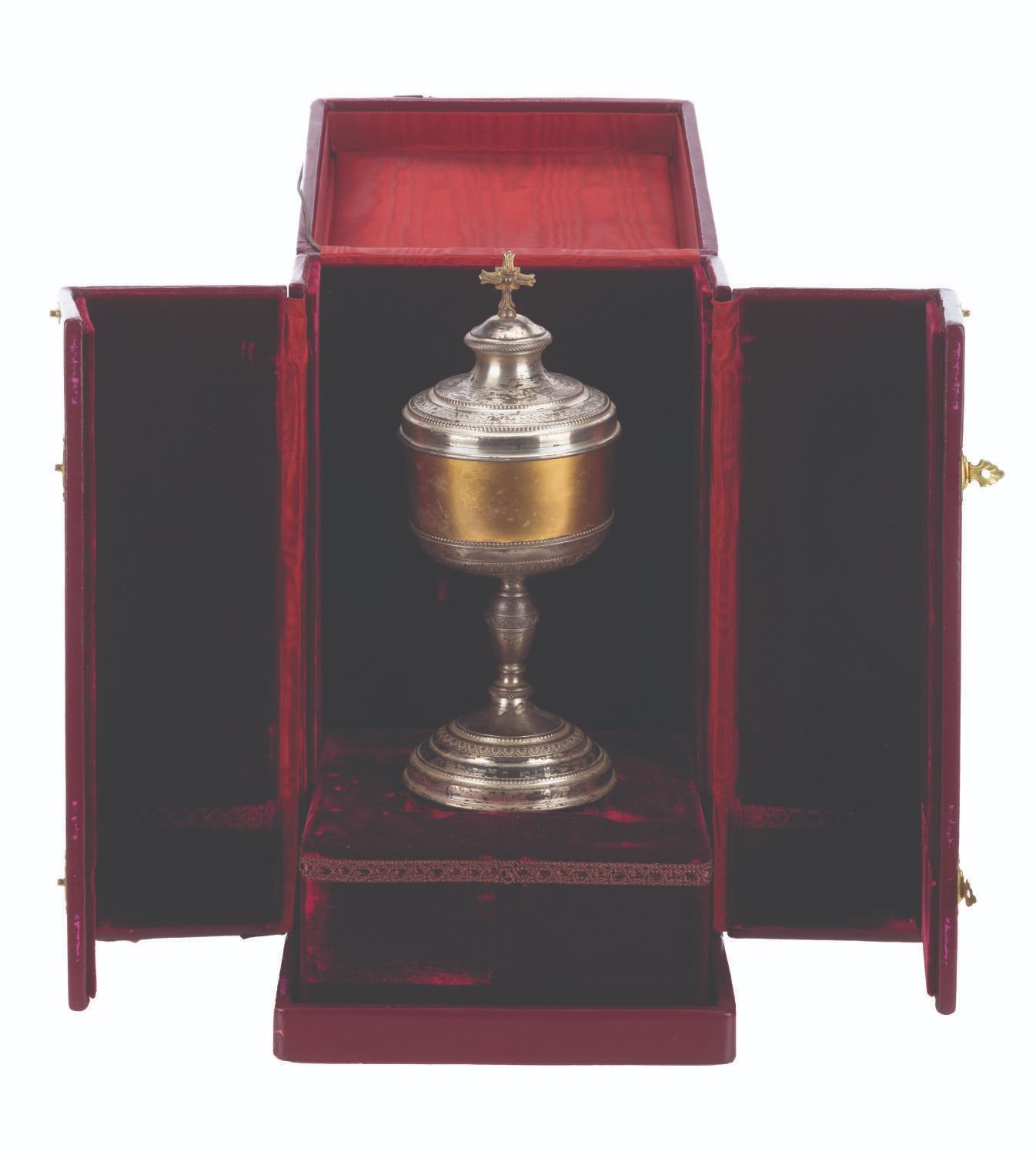 (Disney, 2003) An Isla de Muerta treasure prop chalice with a leather case, and a doubloon presented in a custom display from "Pirates of the Caribbean: The Curse of the Black Pearl.” The brass chalice measures 3.25” in diameter and 8” tall in a 6.5” x 6.5” x 12” leather case with a velvet lining, and both display in good condition with tarnish to the chalice and scuffs and tears to the case. Measuring 1.5” in diameter in a 13.75” x 16.5” matted frame, the doubloon is in fine condition with a light scuff to the frame.