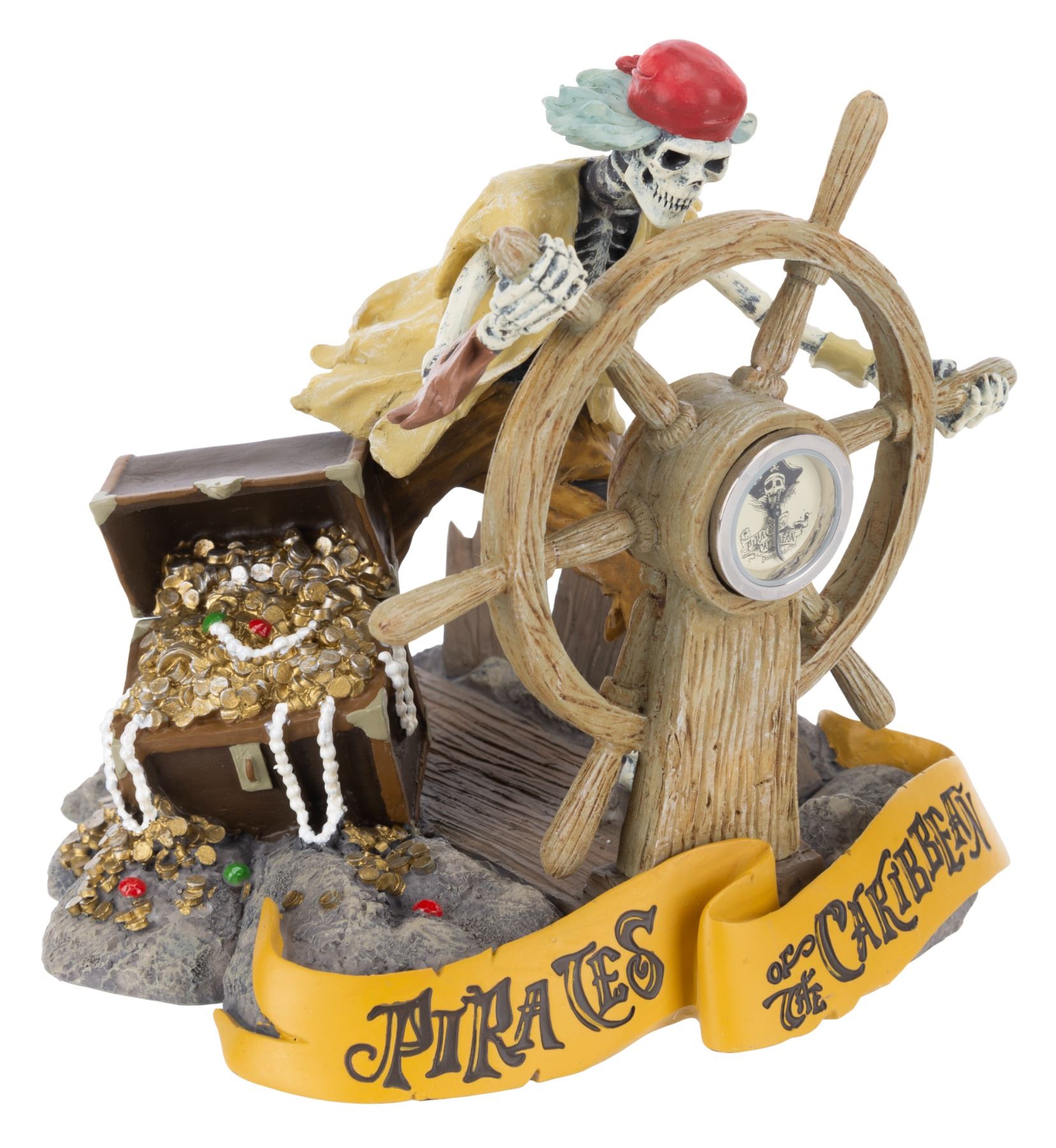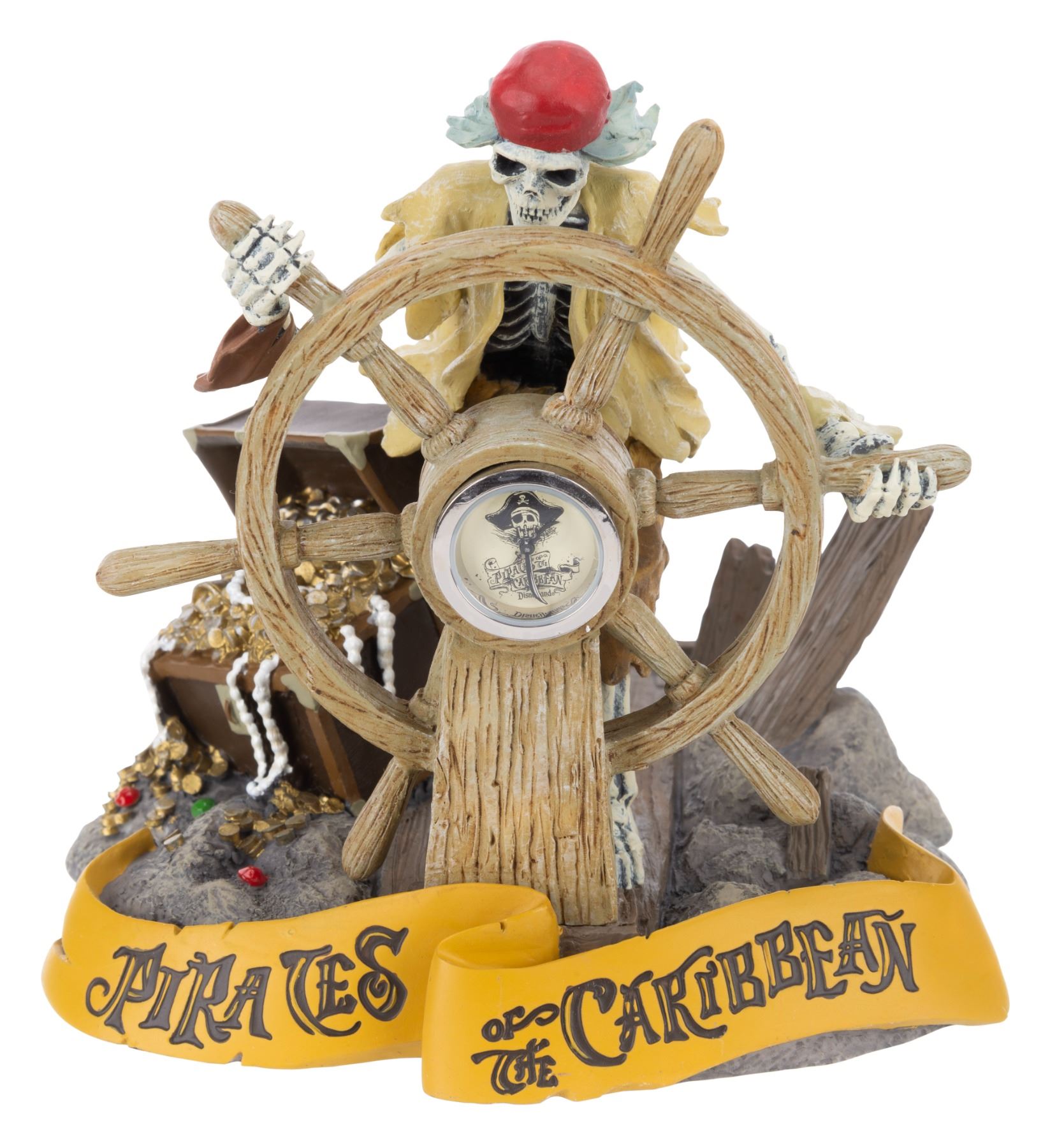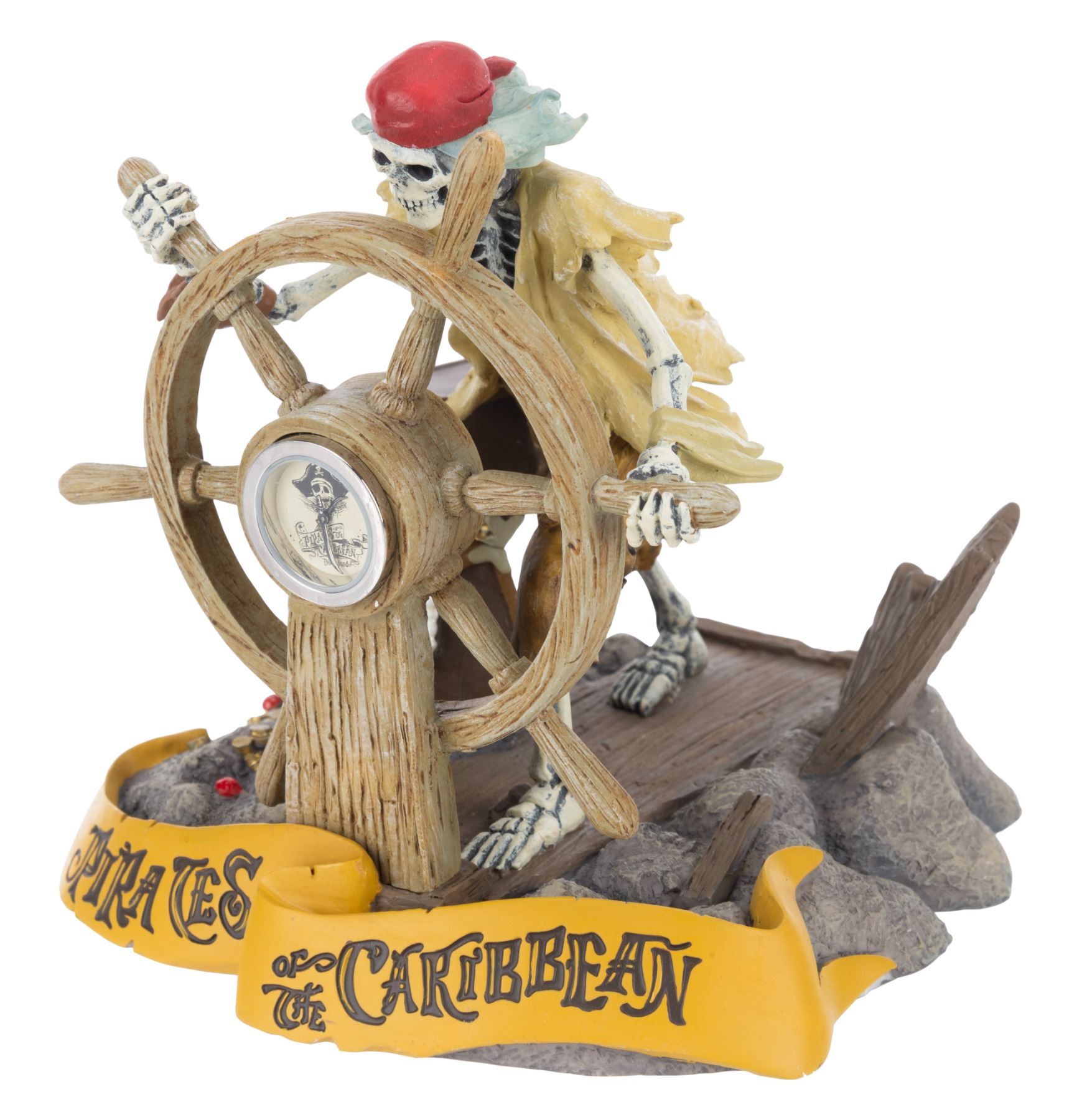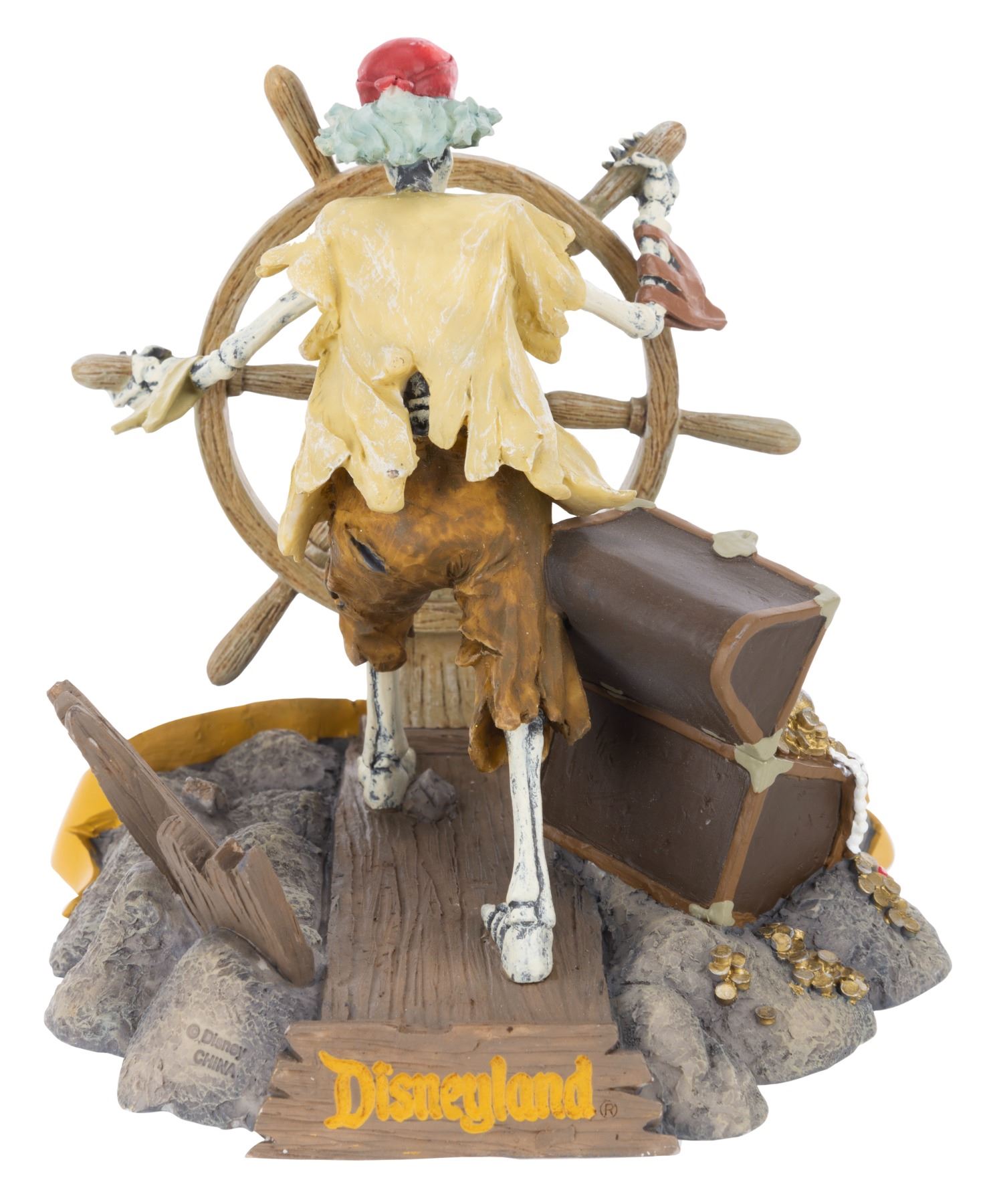 (Disneyland, 2003) A Pirates of the Caribbean skeletal helmsman figure with a built-in clock, limited to an edition of 500 pieces. Measuring 5.75" x 6" x 5.5" tall, the piece is in fine condition, requiring a battery and possibly service to function.