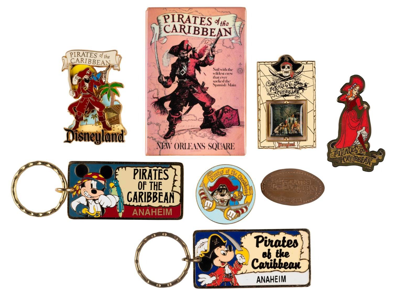 (Disneyland, 1986-2000s) A collection of eight Pirates of the Caribbean souvenirs including an attraction poster magnet, a stretched penny, two personalized keychains with “Anaheim” in the name place, and four pins. The pins include a rare 1986 Goofy as a pirate pin, and a very rare 2003 Pirates event gift pin featuring Marc Davis’ design for the redhead. The souvenirs are in very good condition.