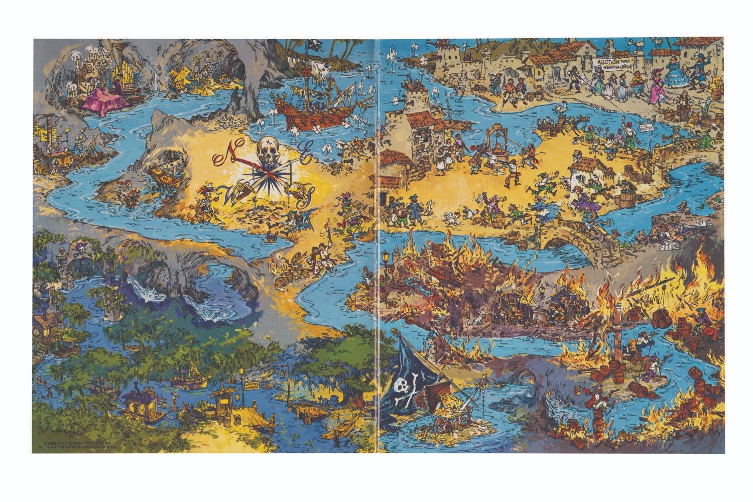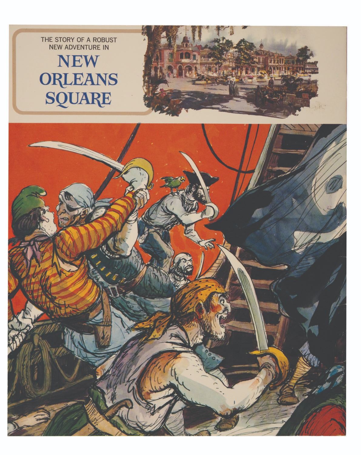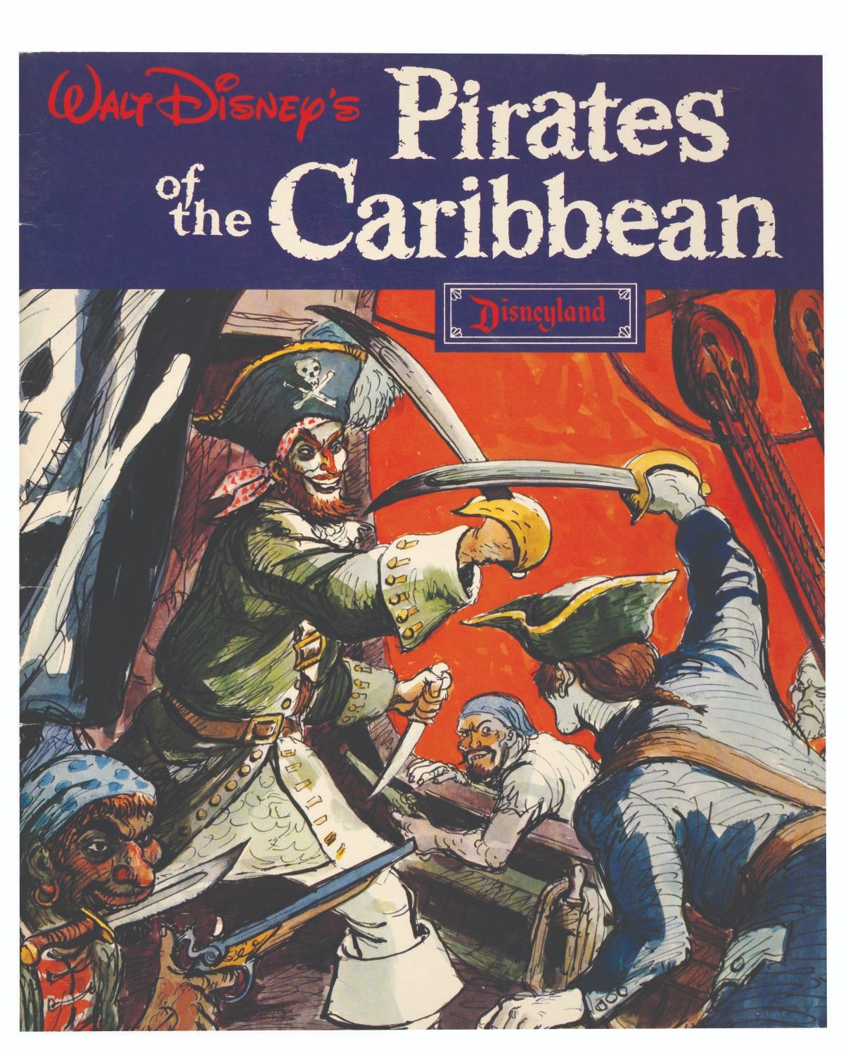 (Disneyland, 1968) A souvenir guidebook for Disneyland's Pirates of the Caribbean attraction containing legends of historic pirates, images chronicling the Imagineering of the adventure, and much more. This guidebook measures 10.75"x9" and is in very good condition, exhibiting wear and creases to its cover.