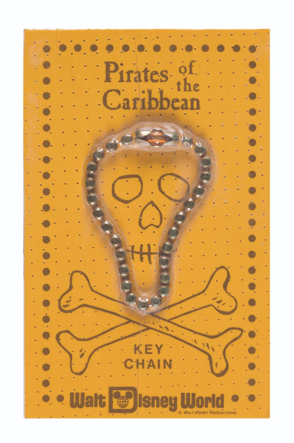 (Walt Disney World, 1973) A Pirates of the Caribbean keychain from Walt Disney World. The ball keychain on gold carding is among the earliest of the related attraction souvenirs offered and was designed to be paired with a customizable souvenir doubloon. Measuring 4” x 2.5”, the piece is in unopened, unused fine condition.