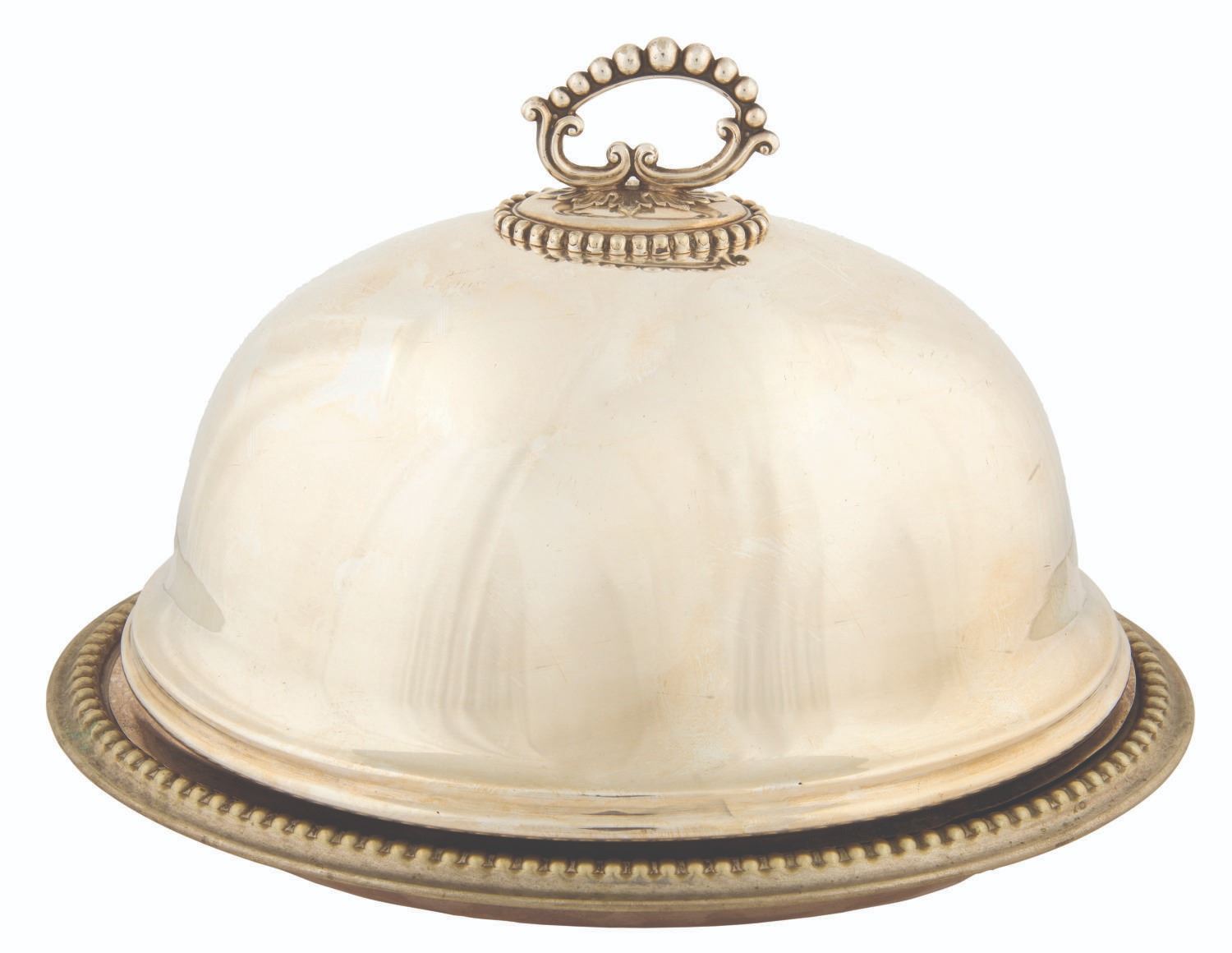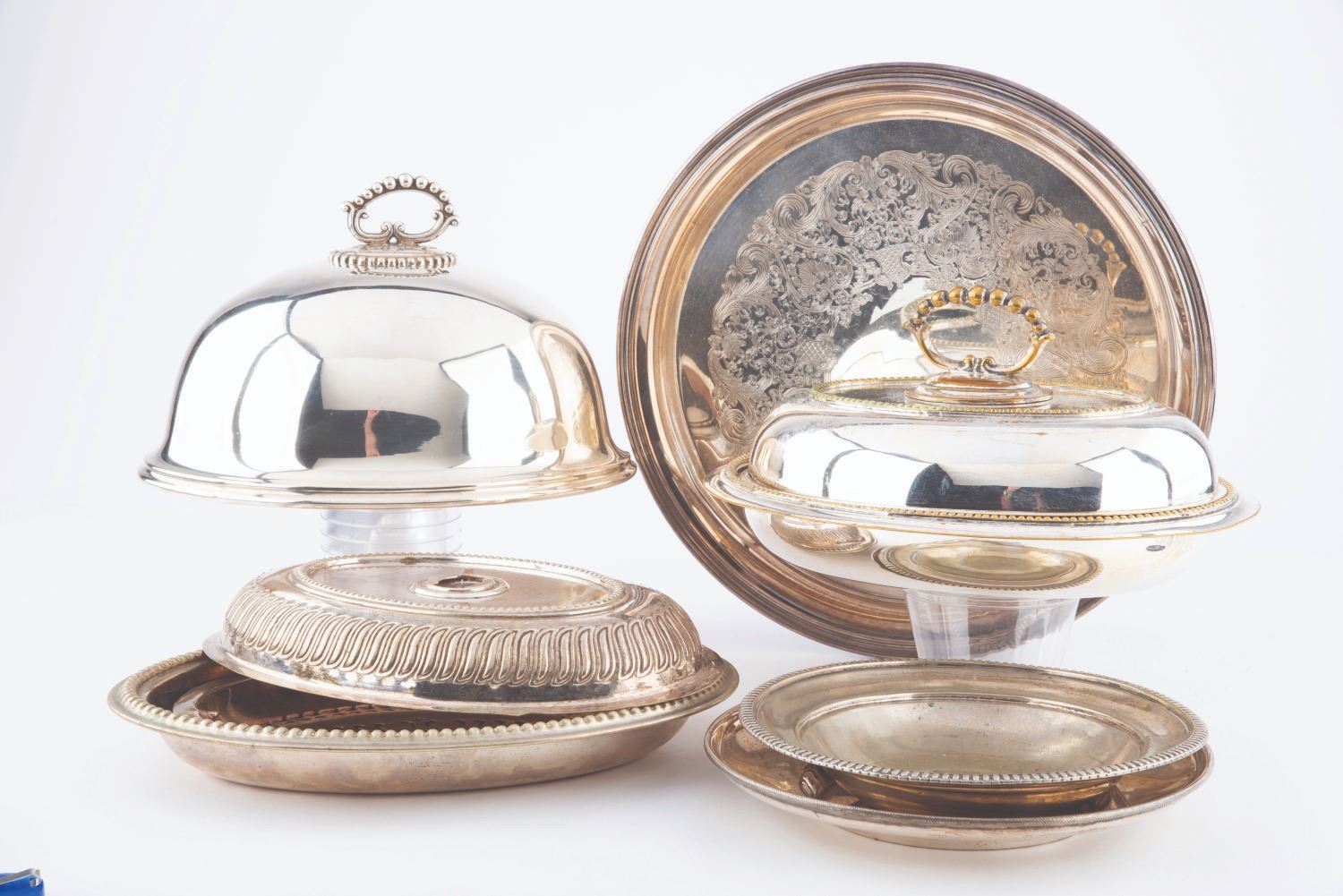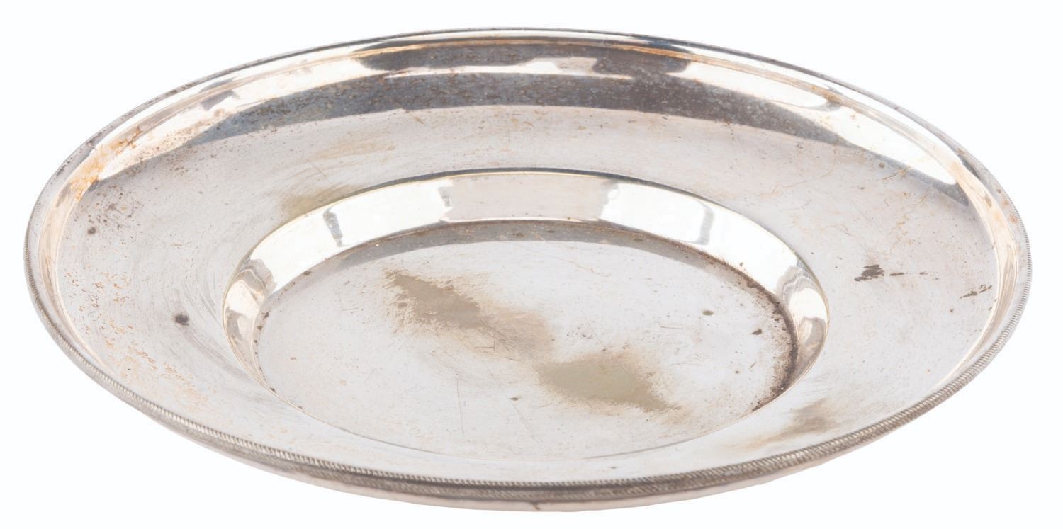 (Disney, 2003) A collection of eight Isla de Muerta treasure props from "Pirates of the Caribbean: The Curse of the Black Pearl.” Included are two plates, one bowl, two serving trays with lids, and three lidless serving trays. Ranging in size from 8” in diameter to 12.25”, the nickel silver treasure props are in fair to good condition with oxidation from age, scratches, scuffs, and wear from production use.
