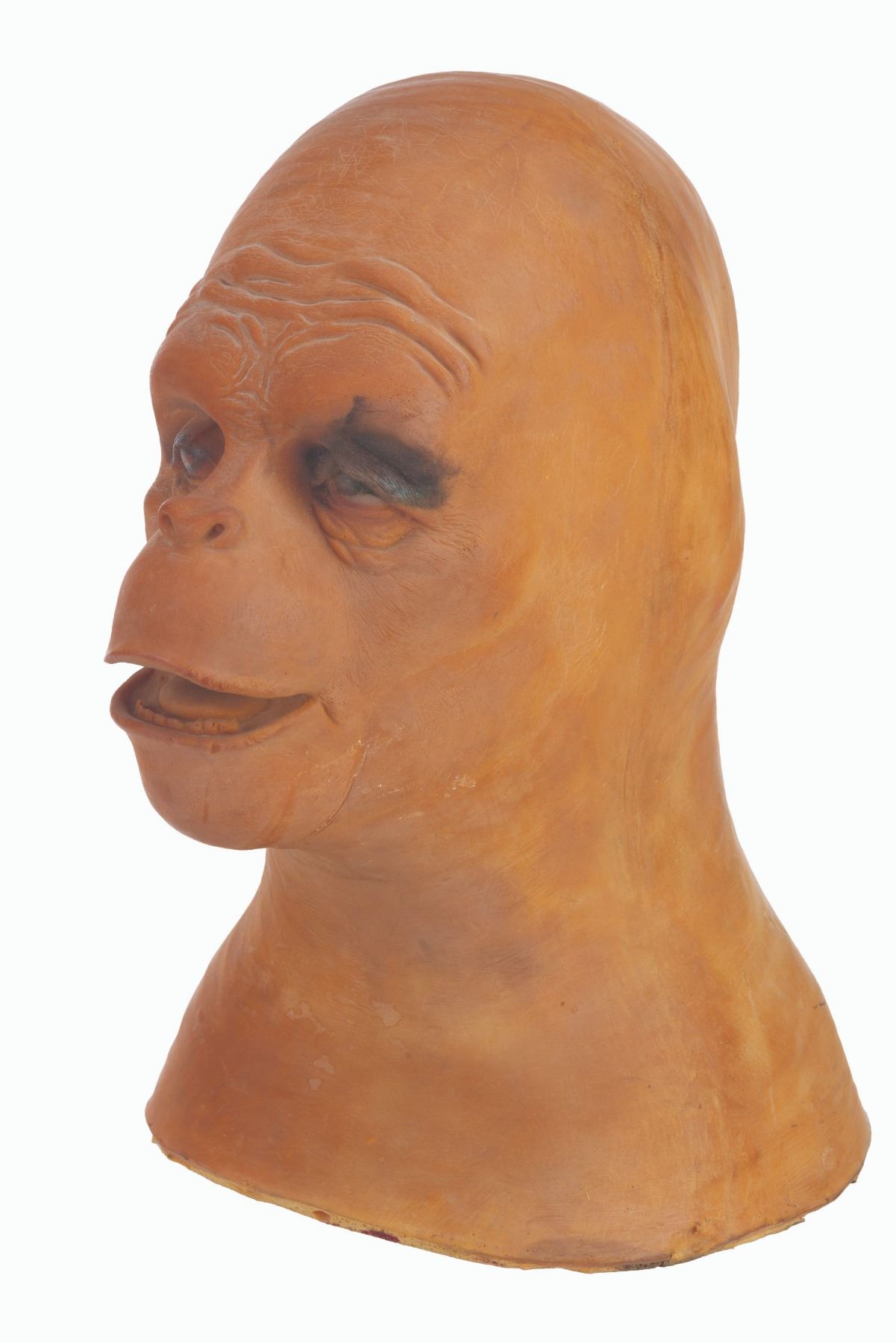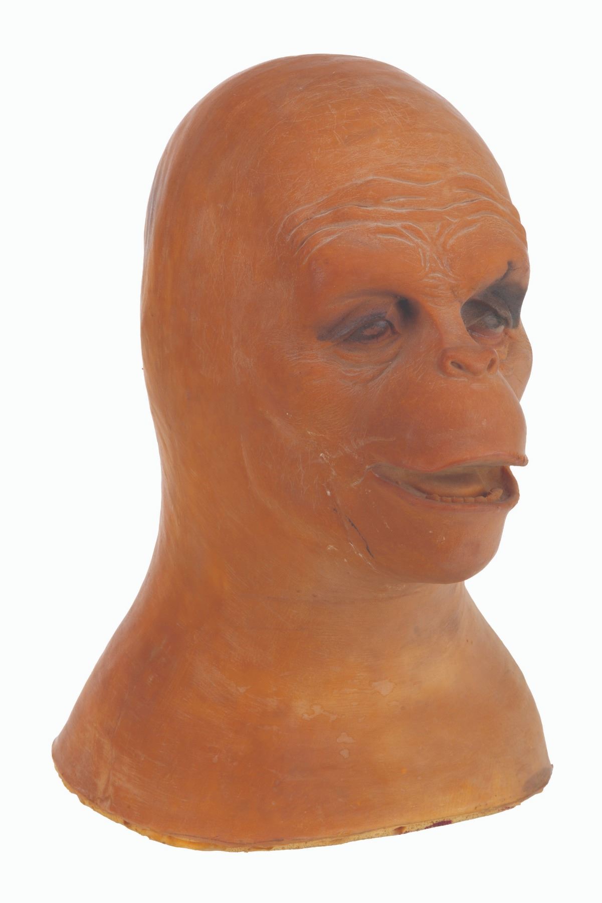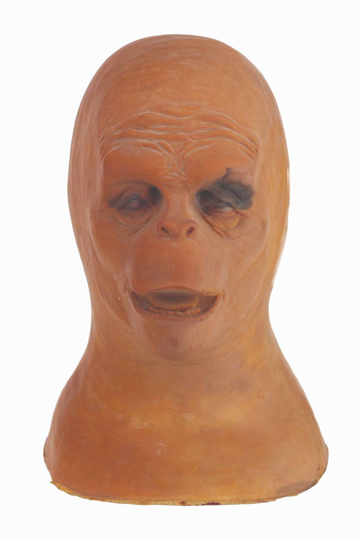 (20th Century Fox, 1967) A master model for a test Orangutan makeup design by the legendary John Chambers for the original "Planet of the Apes" film. Chambers cast this prototype attempt at the orangutans in foam. This design was ultimately abandoned, representing an evolutionary step in Chamber’s Oscar award-winning makeup that has seldom been seen. Measuring 9.5” x 12” x 14.75” tall, the model is in very good production-used condition, with slight wear particularly around the bottom edge, with a 1” chip at one edge.