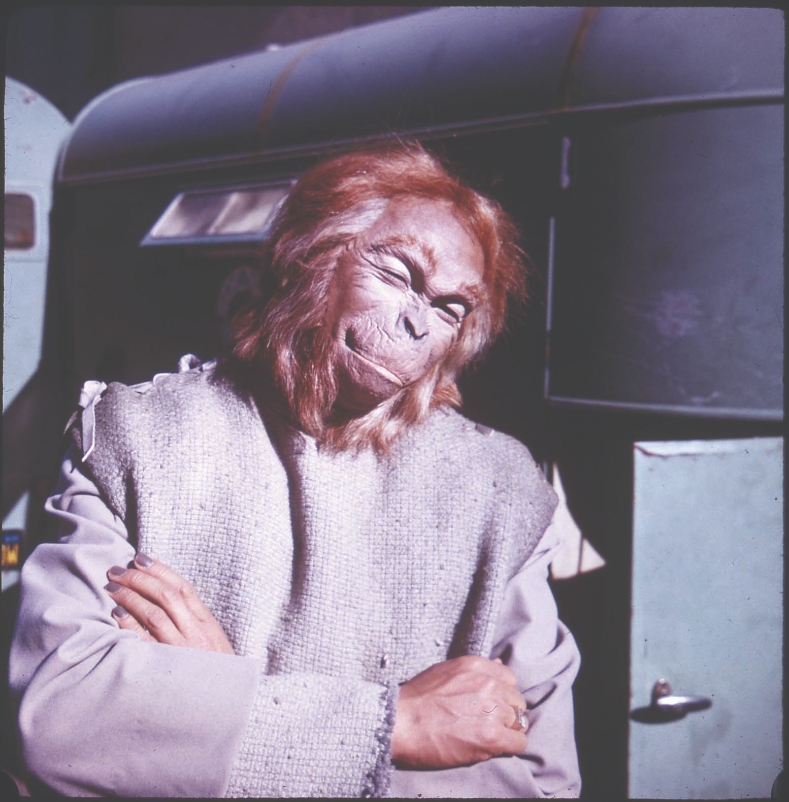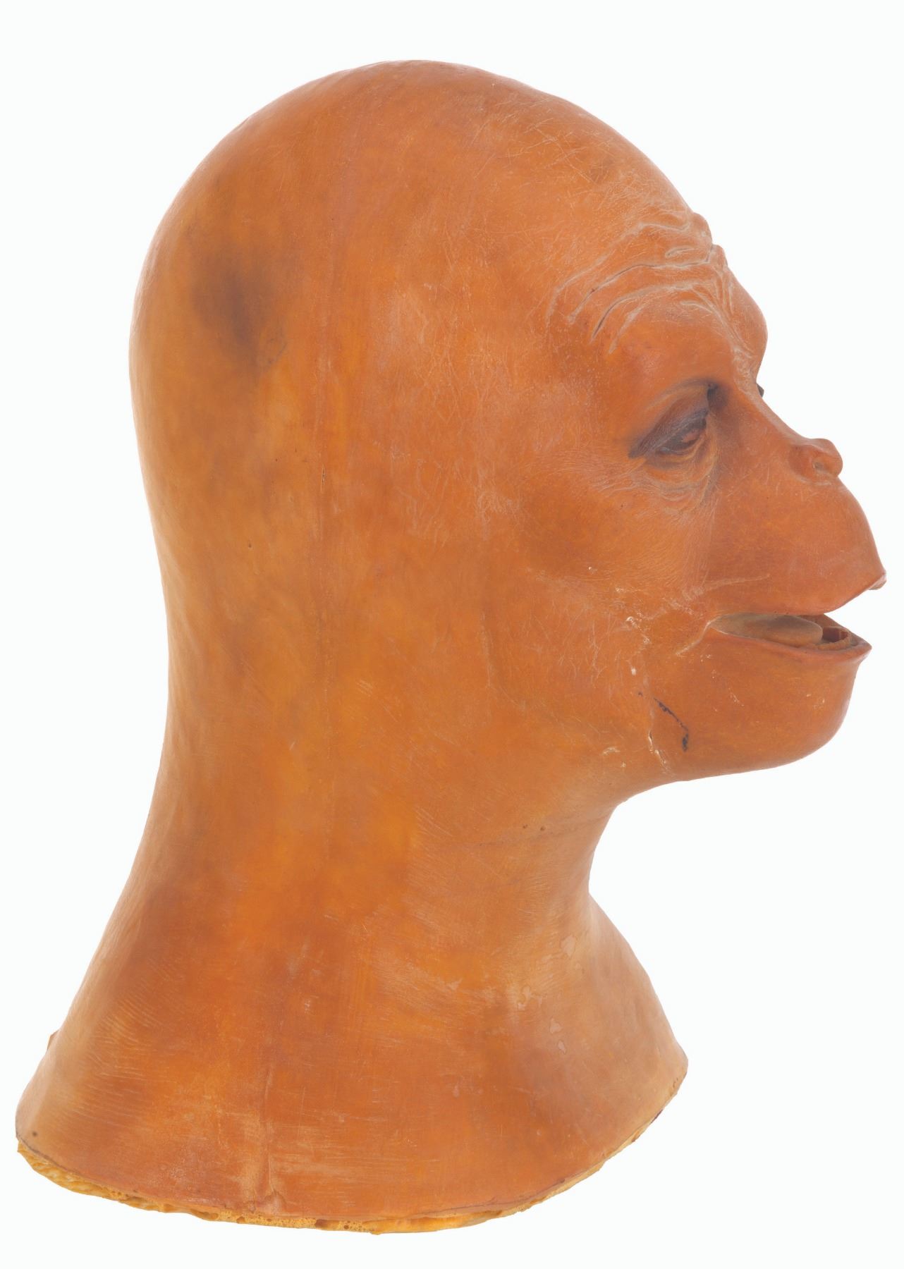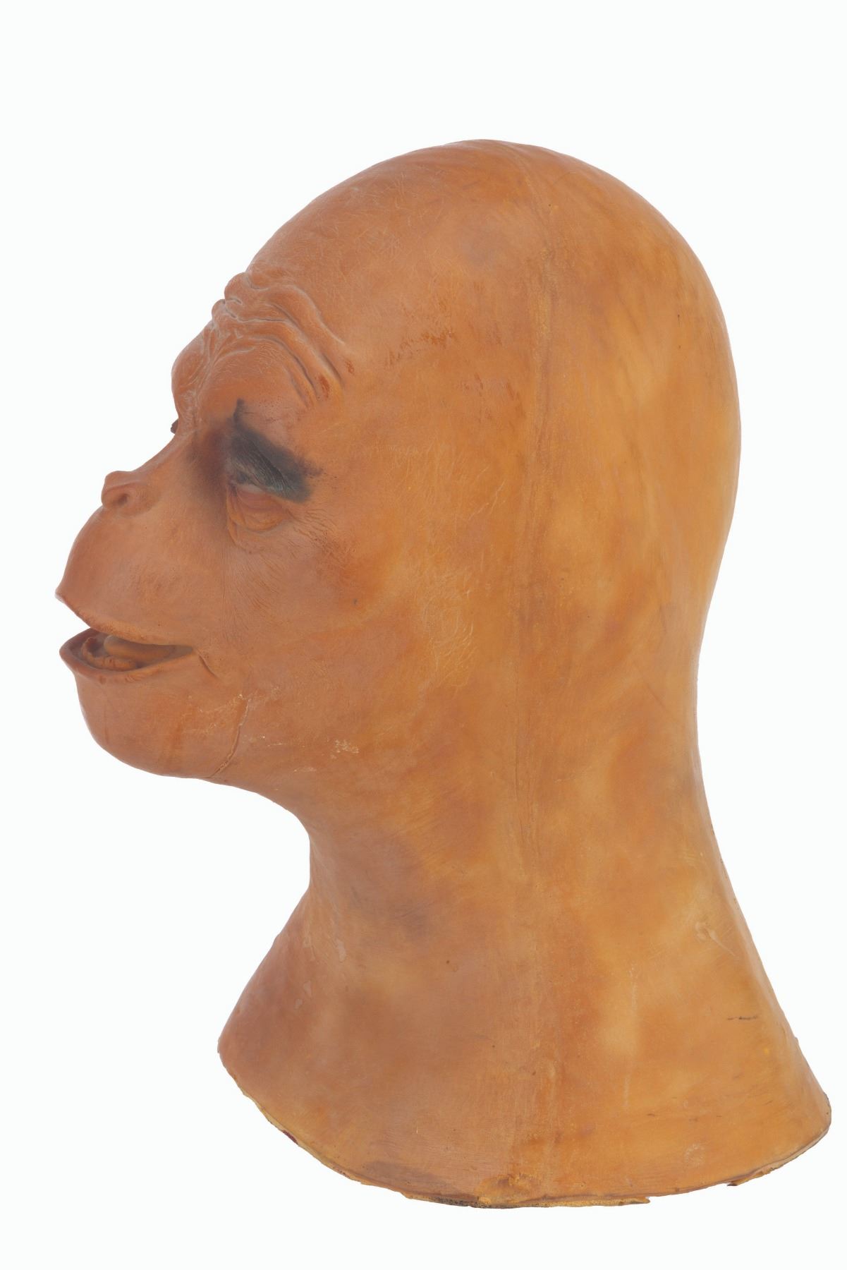 (20th Century Fox, 1967) A master model for a test Orangutan makeup design by the legendary John Chambers for the original "Planet of the Apes" film. Chambers cast this prototype attempt at the orangutans in foam. This design was ultimately abandoned, representing an evolutionary step in Chamber’s Oscar award-winning makeup that has seldom been seen. Measuring 9.5” x 12” x 14.75” tall, the model is in very good production-used condition, with slight wear particularly around the bottom edge, with a 1” chip at one edge.