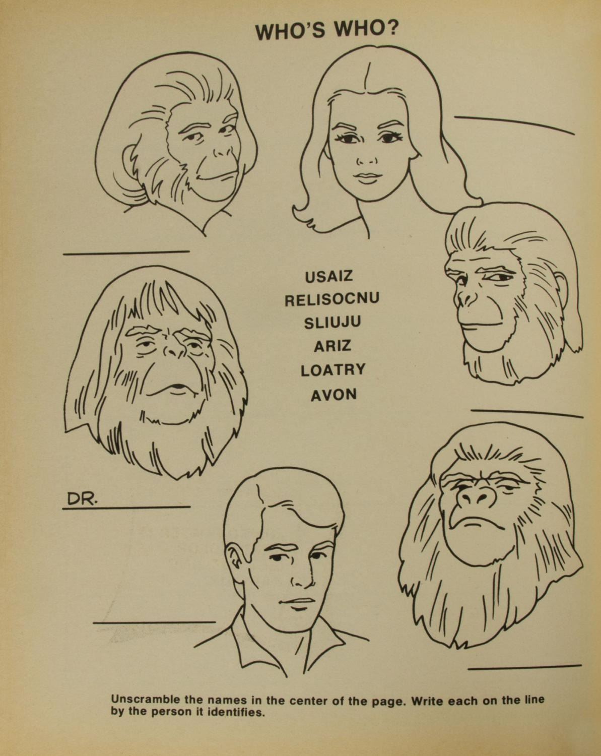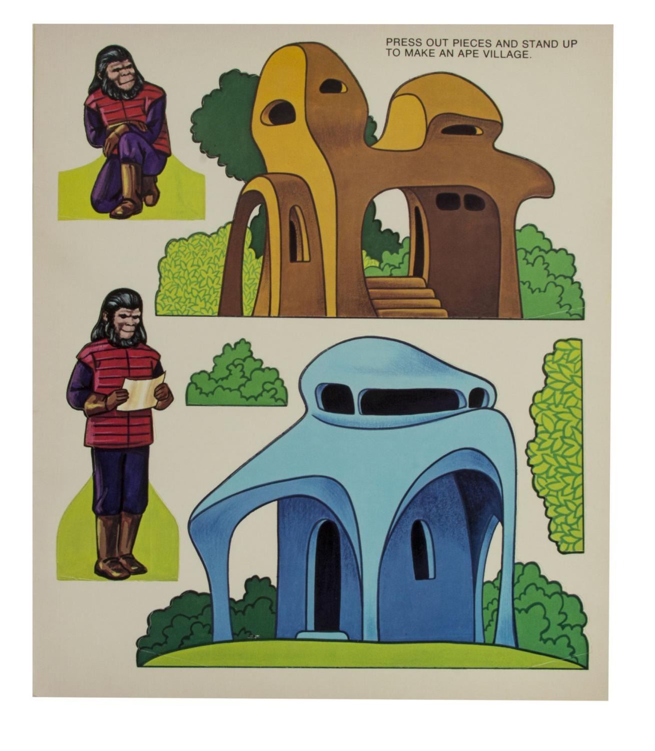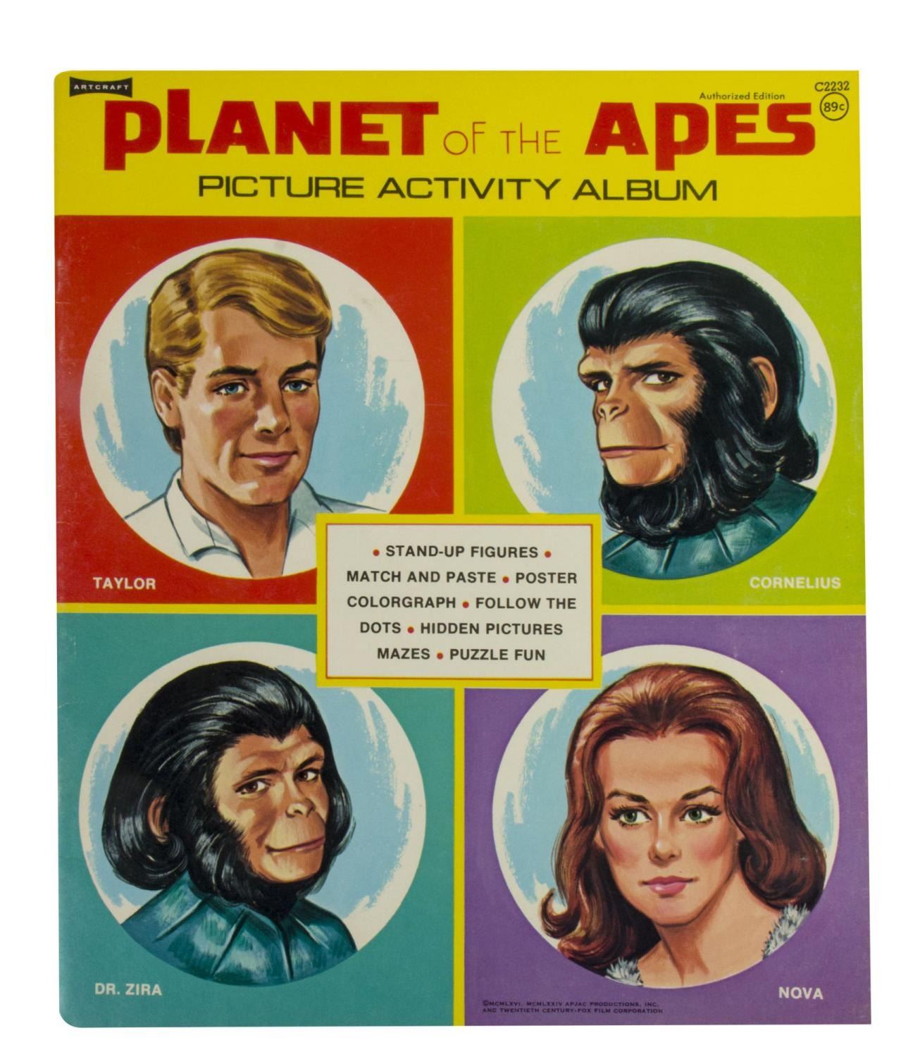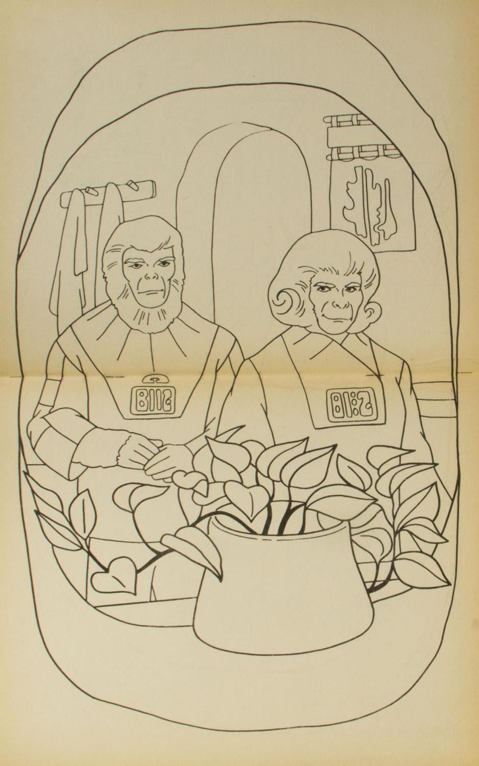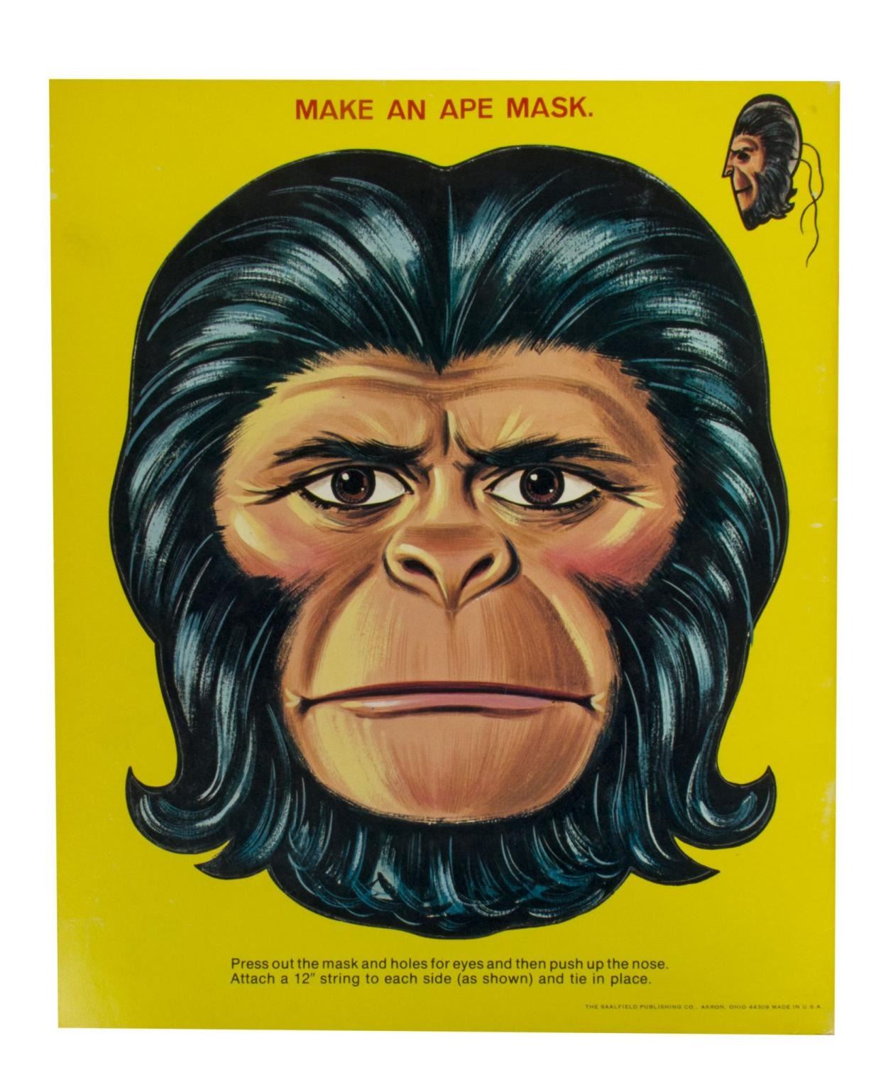 (Artcraft, 1974) An unused "Planet of the Apes" activity book with pages to color, and sections to punch-out. In addition to the great imagery of the characters from the film throughout, the activity book also has a back page that can be punched out to build an ape mask. Measuring 10.5" x 12.5", the book is in very good condition with light creases and wear, notably along the spine.