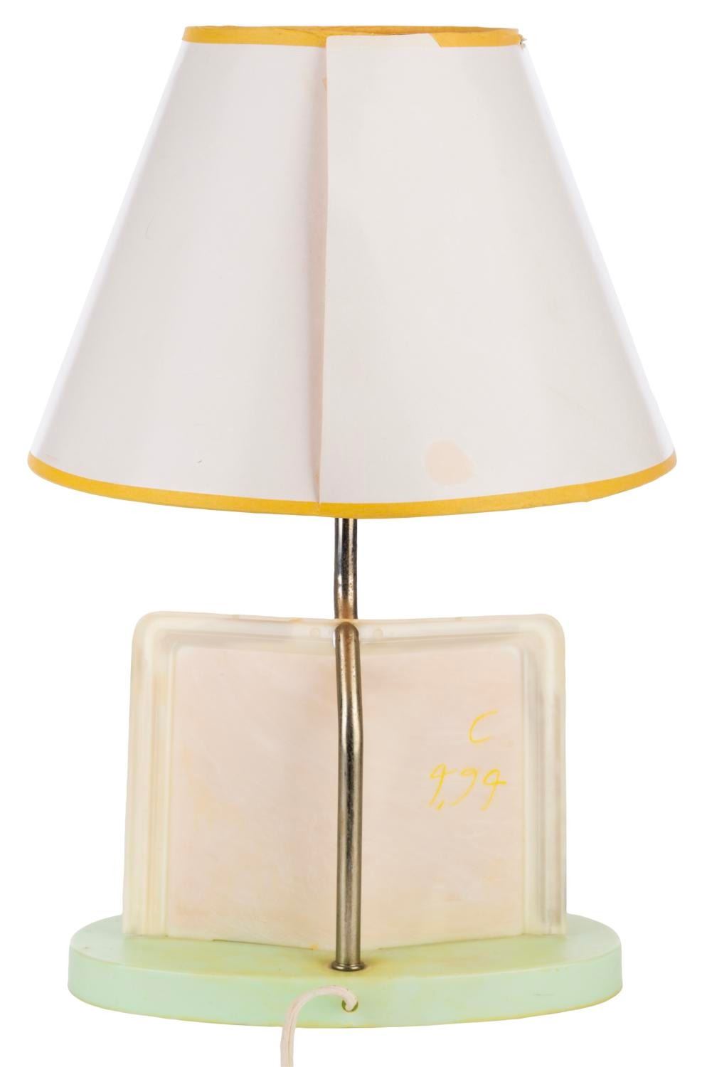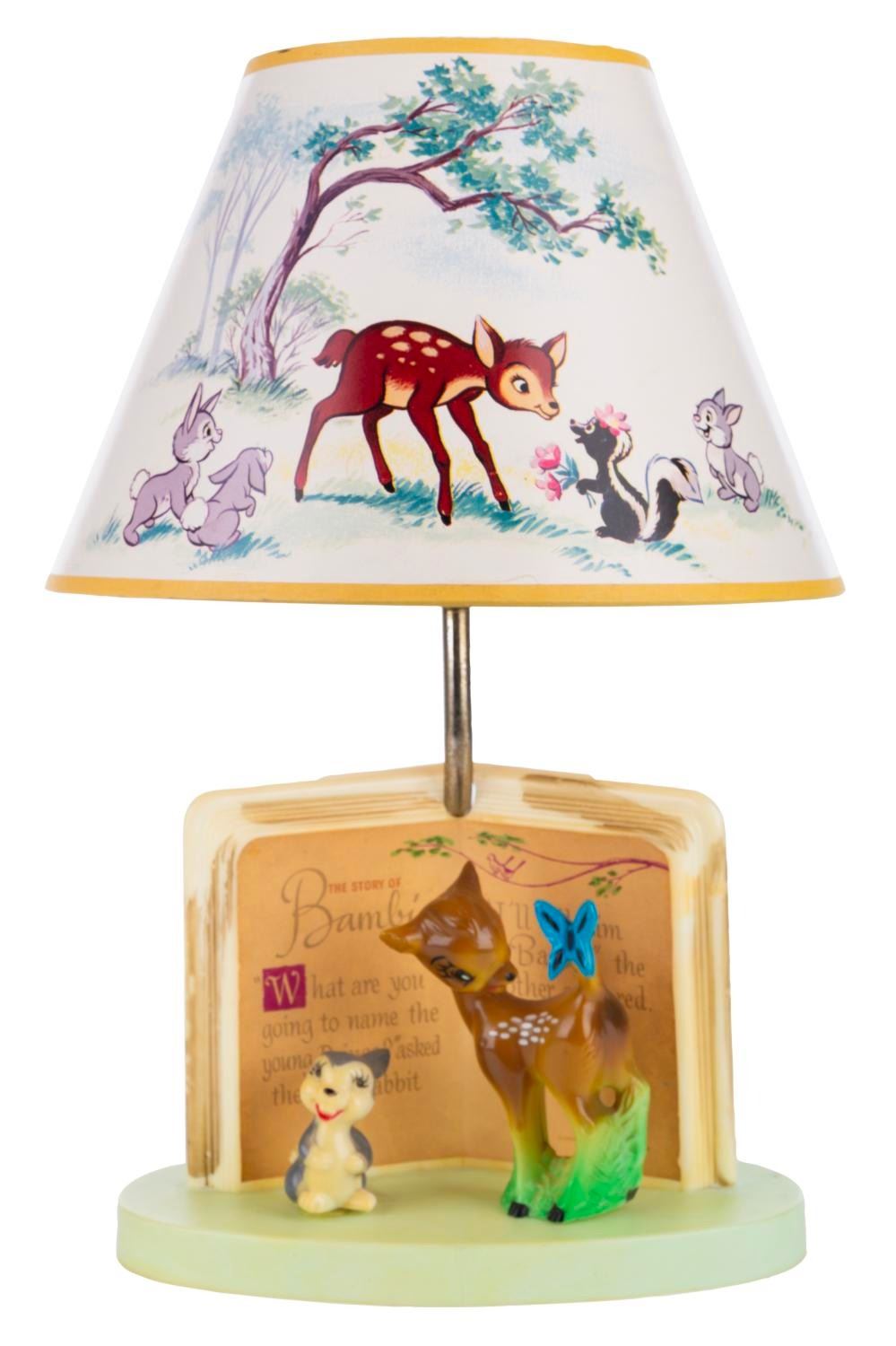 (Dolly Toy Company, 1972) A plastic children's lamp featuring charming figural renderings of Bambi and Thumper. Measuring 10” in diameter x 15.5” high, the lamp is in very good working condition, with wear to the gold paint edges of the figural book backdrop.