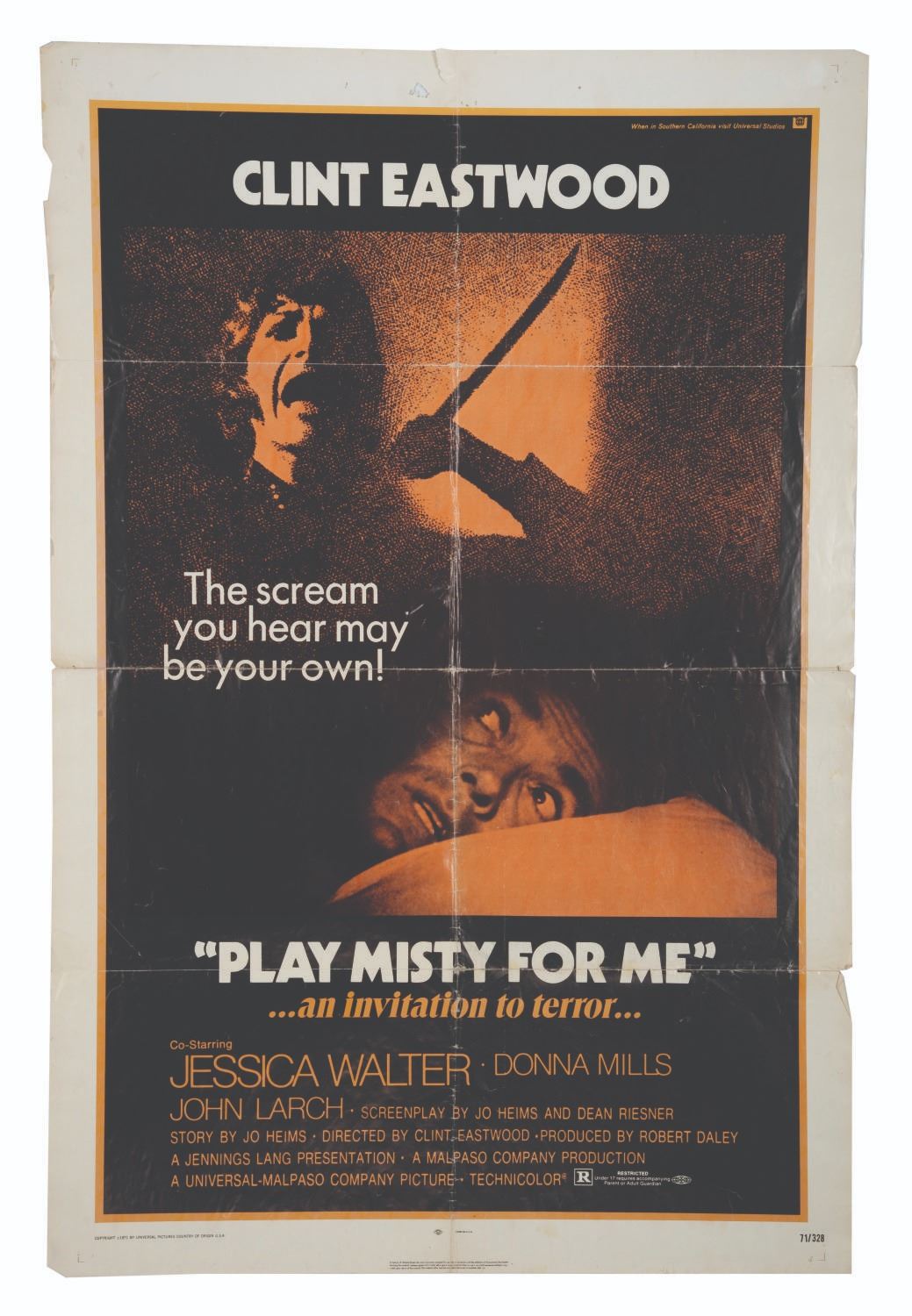 (Universal, 1971) A One-Sheet poster for Play Misty For Me, directed by Clint Eastwood. Measuring 27"x41", the poster is in fair condition, with wear overall including splitting to original fold lines, slight chipping to edges, pinholes at corners, slight warping at the bottom, and holes in the top center border.