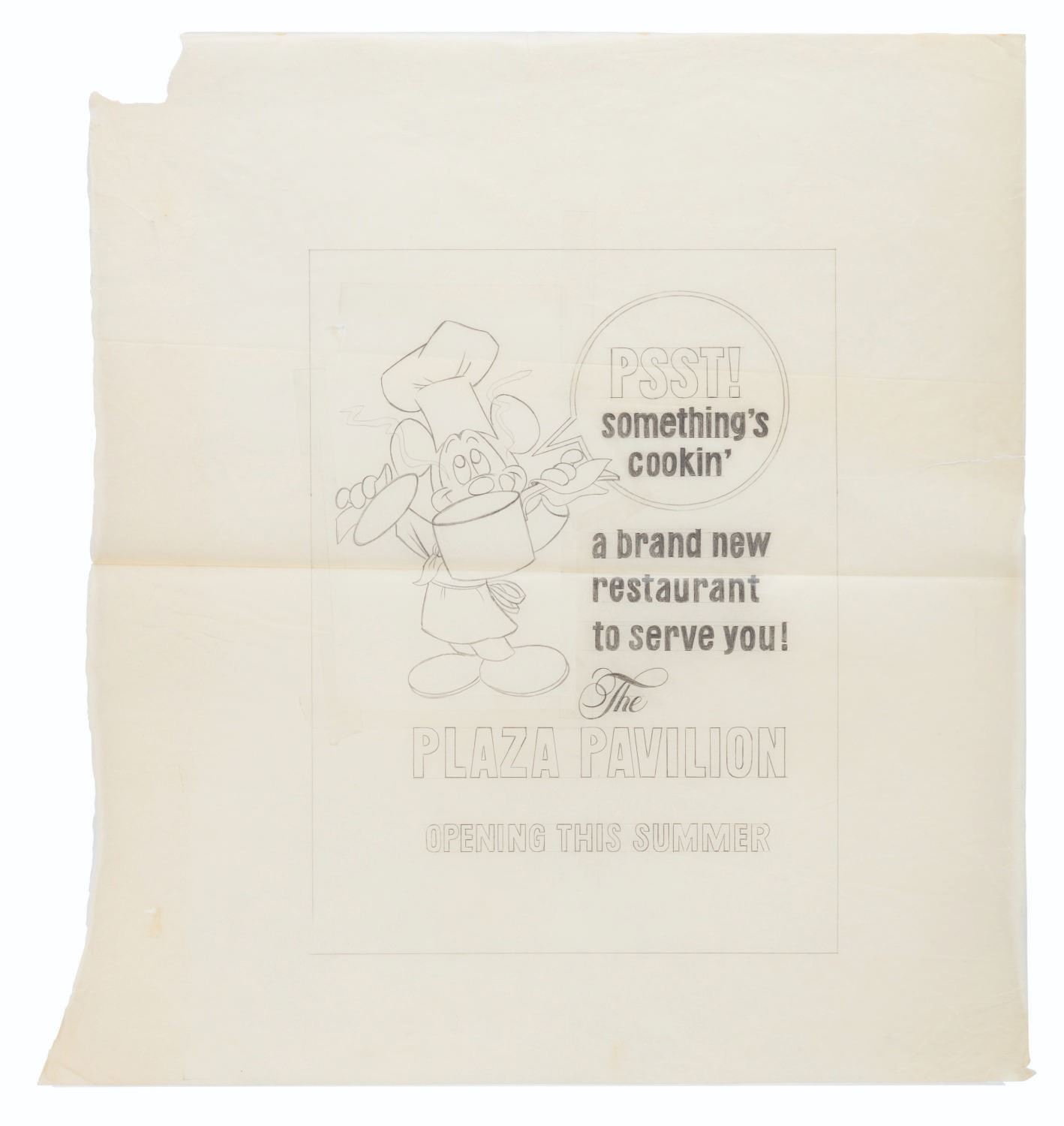 (Walt Disney World, 1973) An original drawing used for a construction sign during the development of Tomorrowland's Plaza Pavilion restaurant. Promoted as "Opening this Summer" and featuring Mickey Mouse as a chef, the drawing is on multiple sheets of vellum, which have been adhered with tape. Measuring 12" x 16" on a 21.25" x 24" vellum sheet, the graphite drawing is in good condition with two horizontal folds, a 4.5" tear to the right margin, small tears around the edges, and creases throughout.
