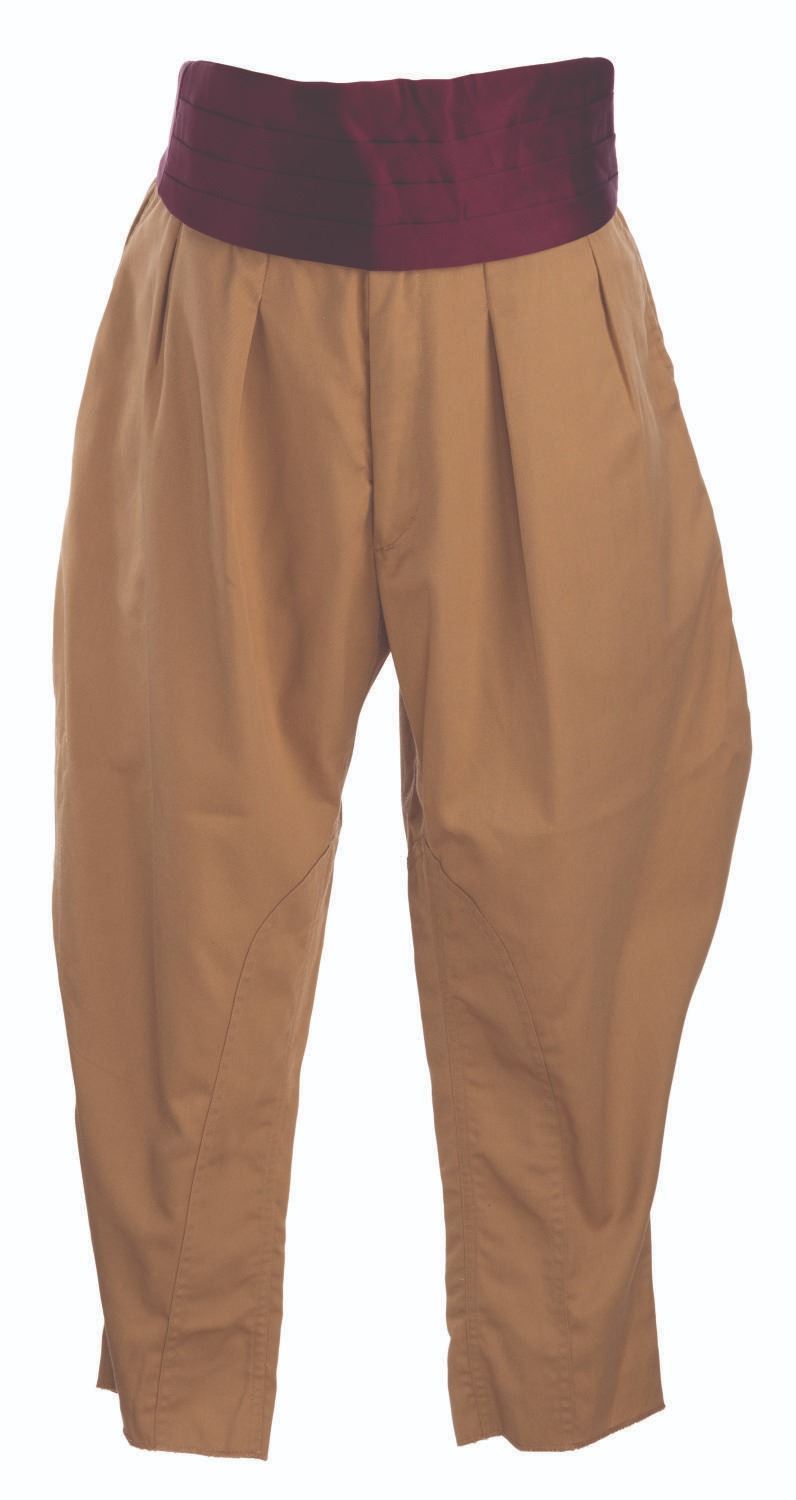 (Walt Disney World, 1989-2009) A collection of Adventurer's Club costume pieces worn by the colorful Cast of the themed nightclub's many adventurers. Included are a pair of jodhpur-style khaki pants, a burgundy cumberbund, and black leather boot extensions. The pants are marked as size 32, the cumberbund is a boy's large, and the boot extensions are unmarked but appear large. The costume elements are in very good, Park-used condition with minimal soiling and edge wear.
