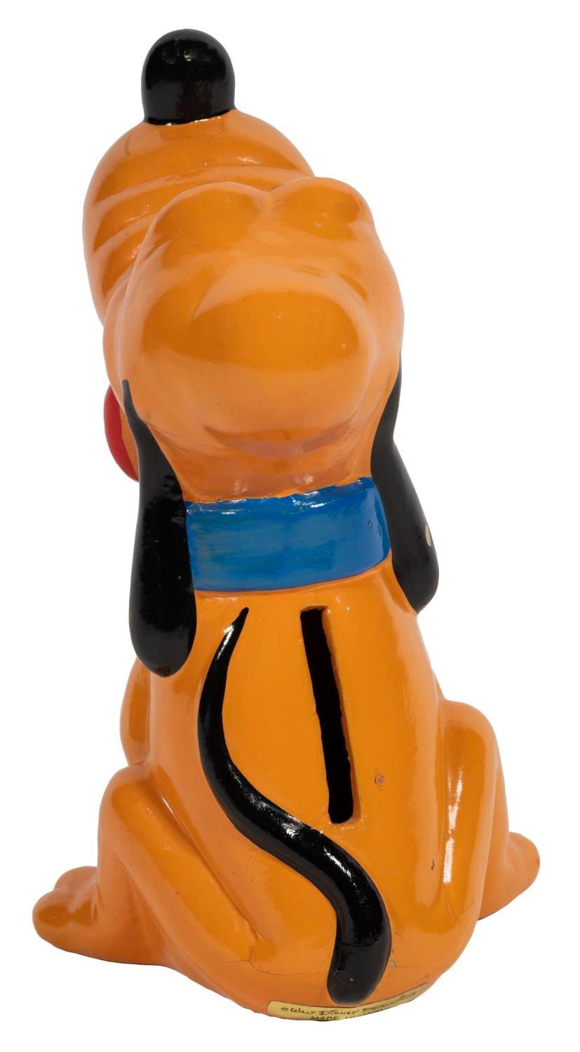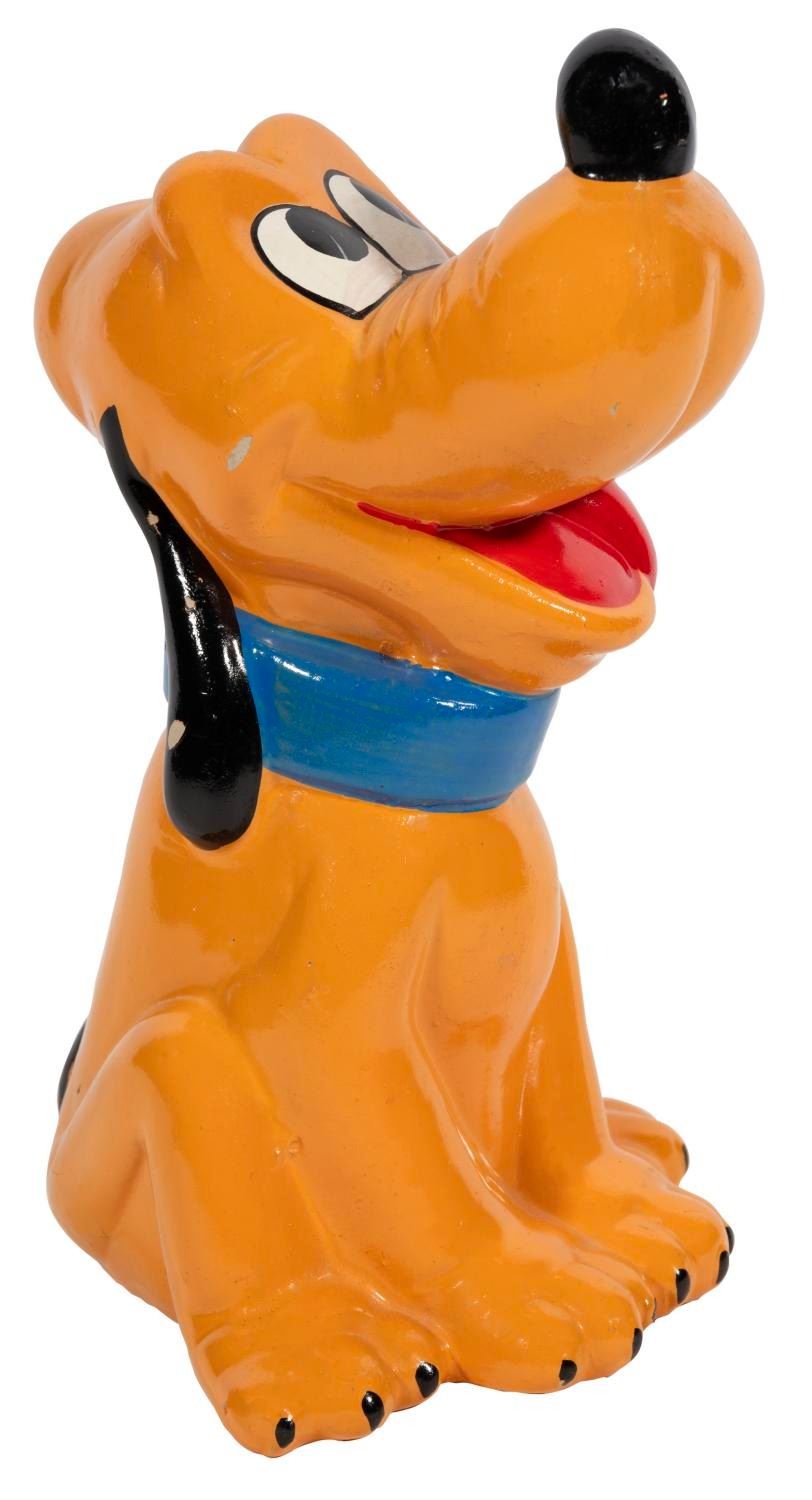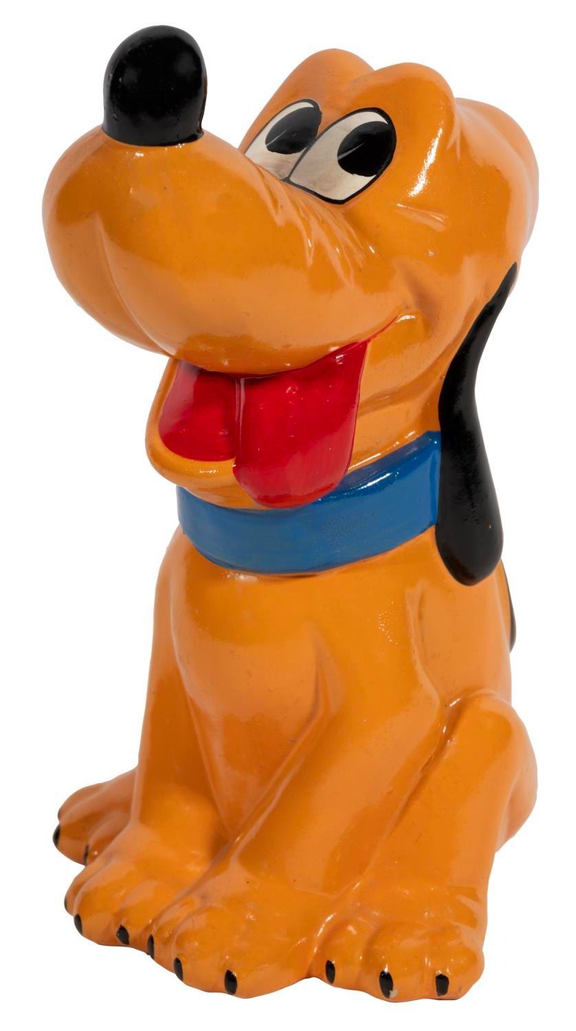 (Disney, 1970s) A ceramic coin bank of Walt Disney's Pluto. Measuring 6.5" tall and 3.5" wide, the bank displays in good condition with chipping and wear throughout, a crack along its rear and tail, and retains the Walt Disney Productions manufacturer sticker.
