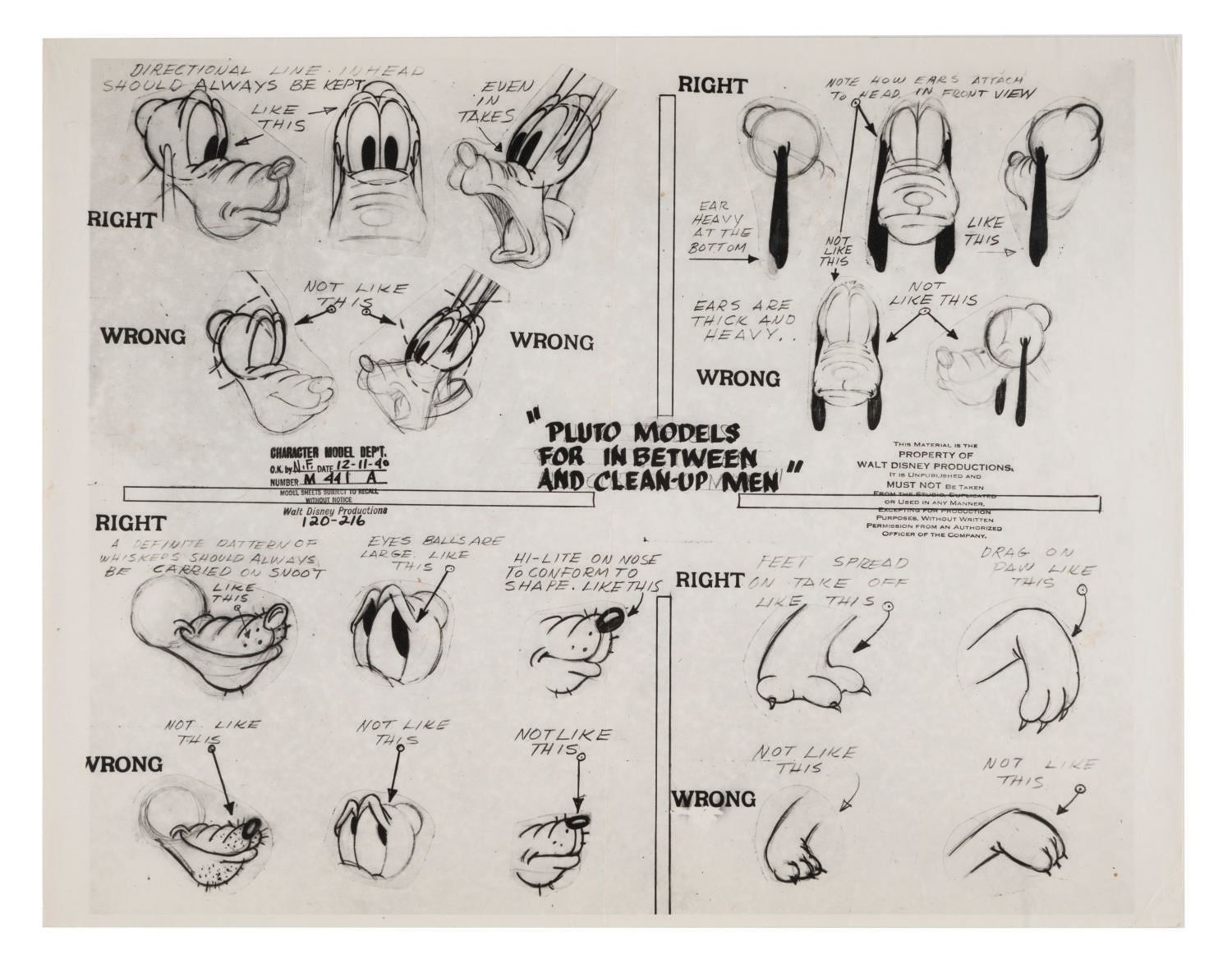 (Disney, 1940) A photostat model sheet of expressions for Walt Disney's Pluto. The reference tool depicts examples of right and wrong ways to draw Pluto and was used by assistant animators during the production of short films. Measuring 11"x14", the sheet is in very good condition, despite a vertical crease.
