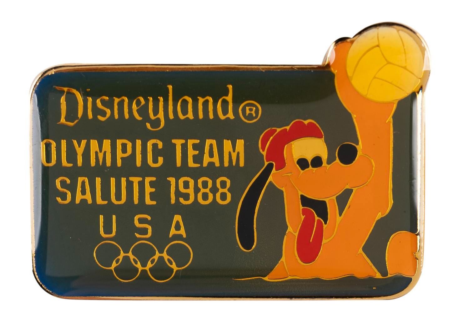 (Disneyland, 1988) A Disneyland Olympic Team Salute 1988 pin featuring Pluto playing water polo. Measuring 1.25" wide, the pin is in very good condition with color shift from age.