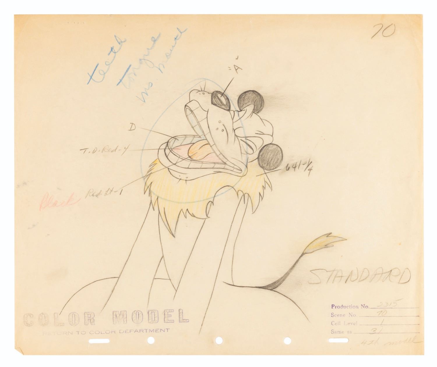 (Disney, 1945) An original color model drawing for Pluto from the Disney short "The Eyes Have It." Accomplished in graphite and colored pencil, with an image size of 7" x 8.5" on 10" x 12" animation paper, the piece displays in very good condition with very light edge wear, a tiny tear in the far left registration hole, staple marks in the top left corner, creasing, and discoloration from age.