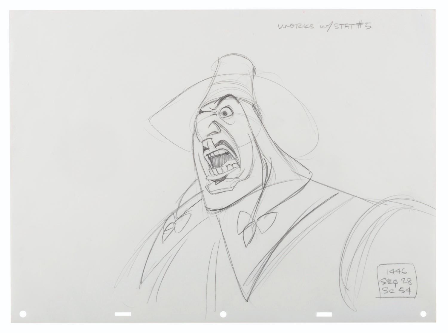 (Disney, 1995) An original production drawing of Governor Ratcliffe from"Pocahontas." With an image size of 10.25" x 12.75" on 12.5" x 17" animation paper, the graphite drawing is in very good condition with light creases, a pinhole at the top right corner from production use, and minor edge discoloration, which does not affect the image.