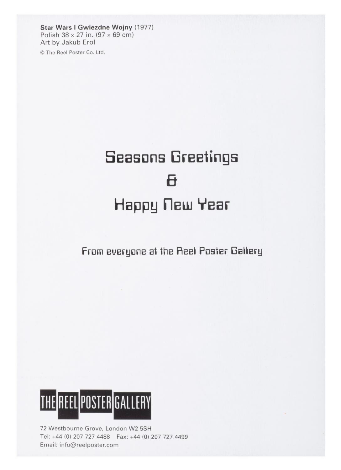 (Reel Poster Gallery, 1990s-2000s) A postcard of a “Star Wars” C-3PO poster from the film’s 1979 original theatrical release in Poland, designed by Jakub Erol. The postcard was sent as a holiday card to clients of The Reel Poster Gallery in London. Measuring 5.75” x 8.25”, the postcard is in very good condition with light creasing.
