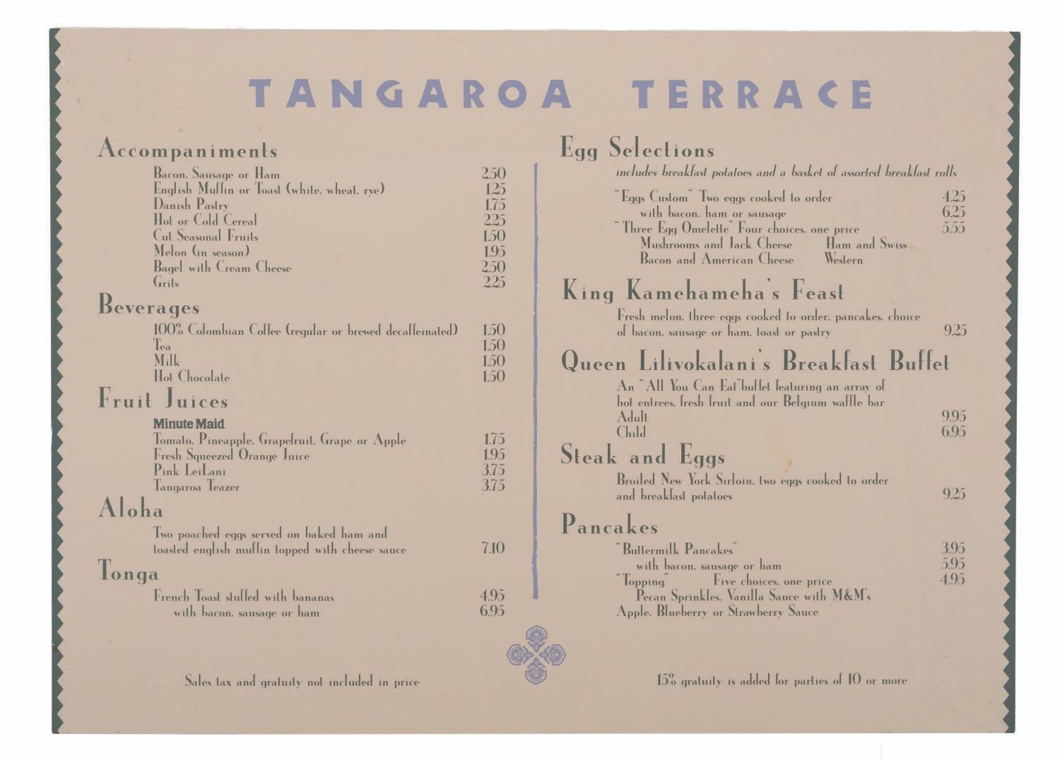 (Disney's Polynesian Resort, 1980s-1990s) A large breakfast menu board from the Tangaroa Terrace at Disney's Polynesian Resort. Measuring 21.5" x 29.5", the heavy board sign is in good condition with scuffs, stains, scratches, and wear from Resort use.
