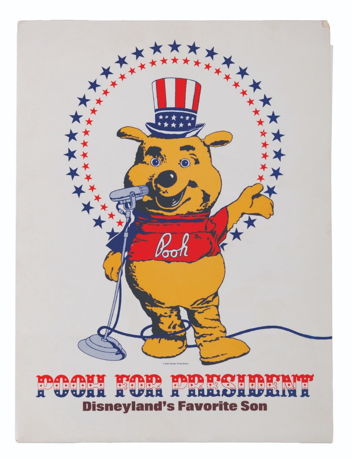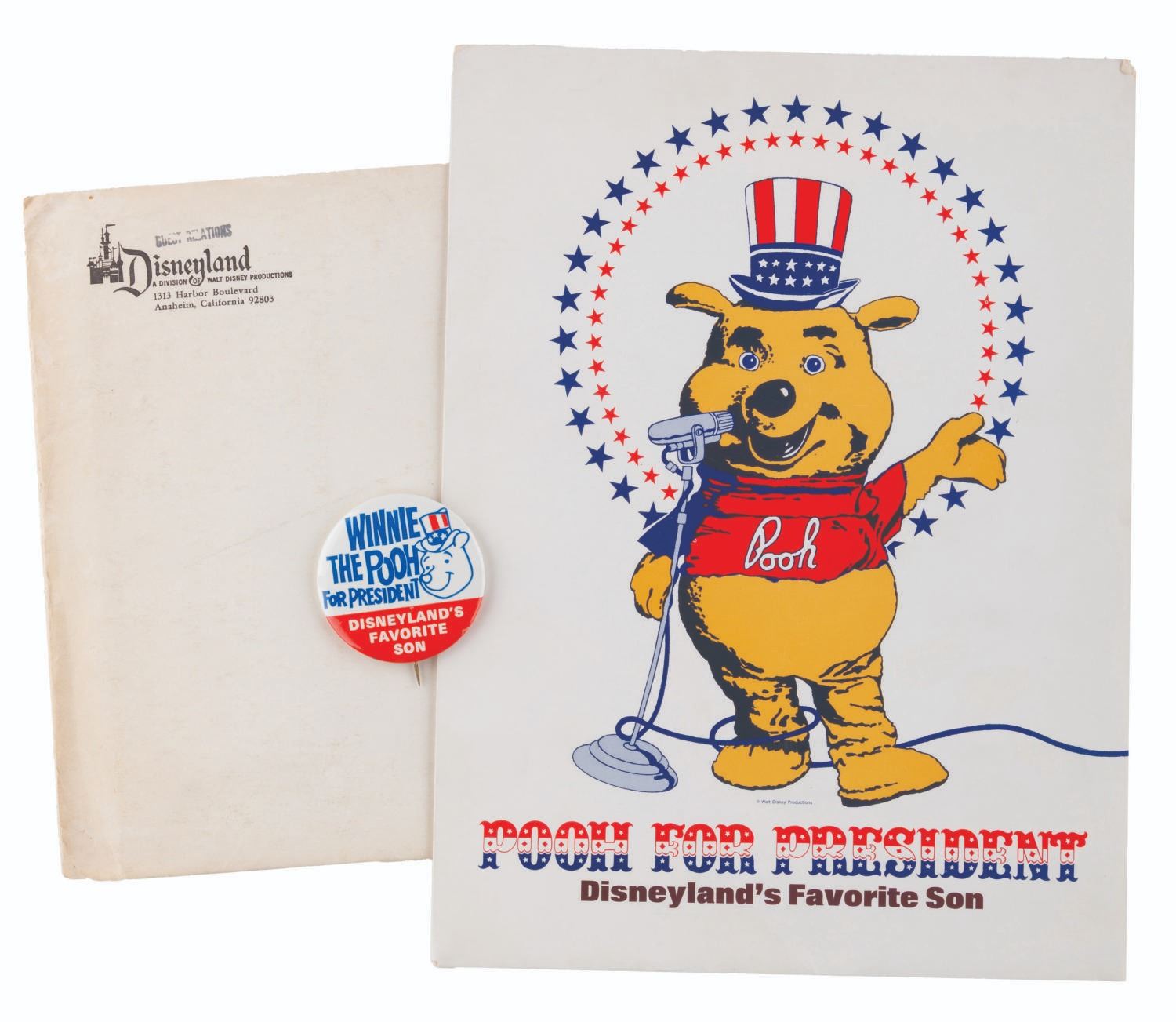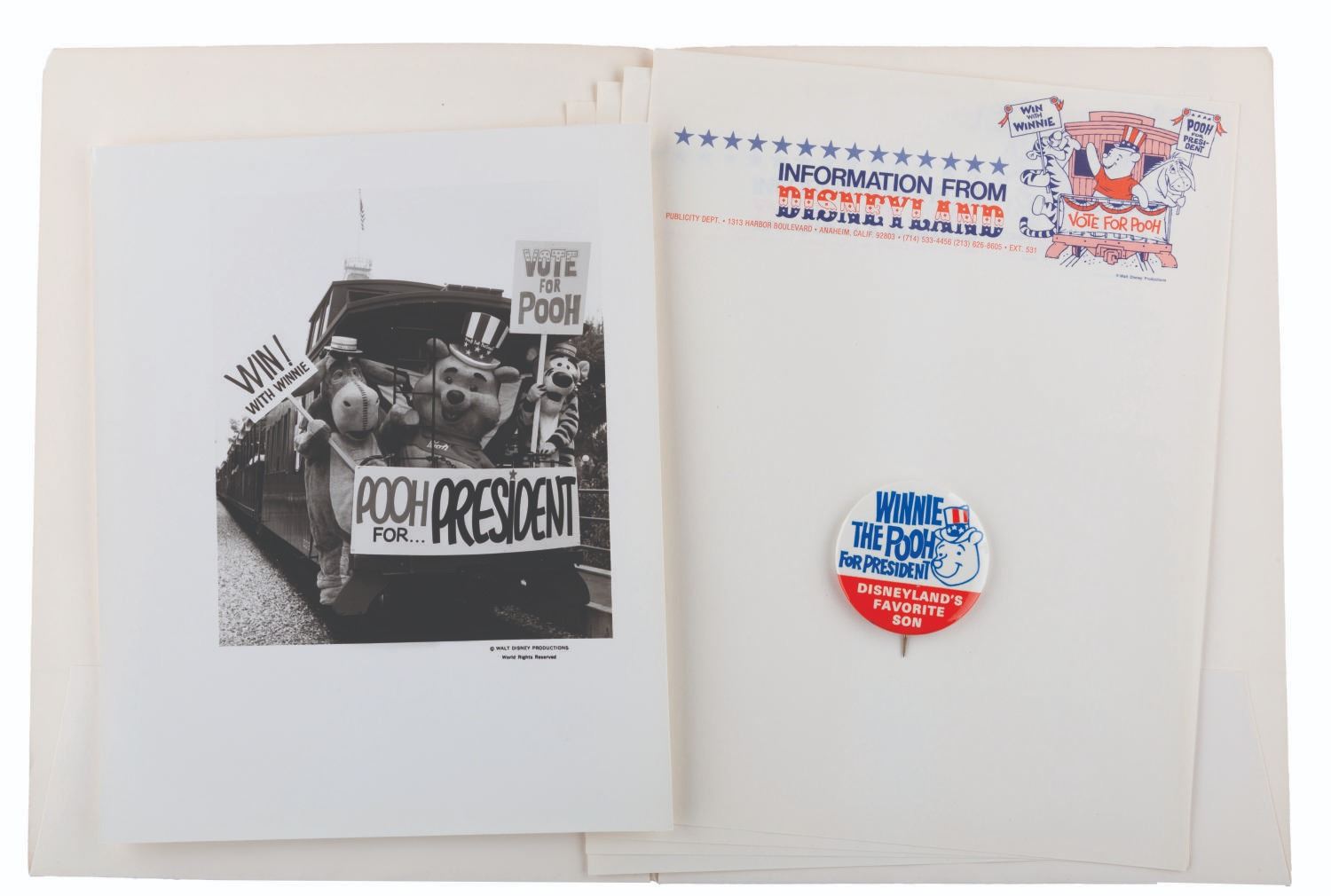 (Disneyland, 1970s) A Pooh for President packet from the Disneyland Guest Relations Department, for the promotions run in 1972 and/or 1976. Included are a 2" button, folder, 8" x 10" photo, and four sheets of Information From Disneyland letterhead featuring Vote For Pooh artwork. The packet is in very good condition, with very light wear from age.