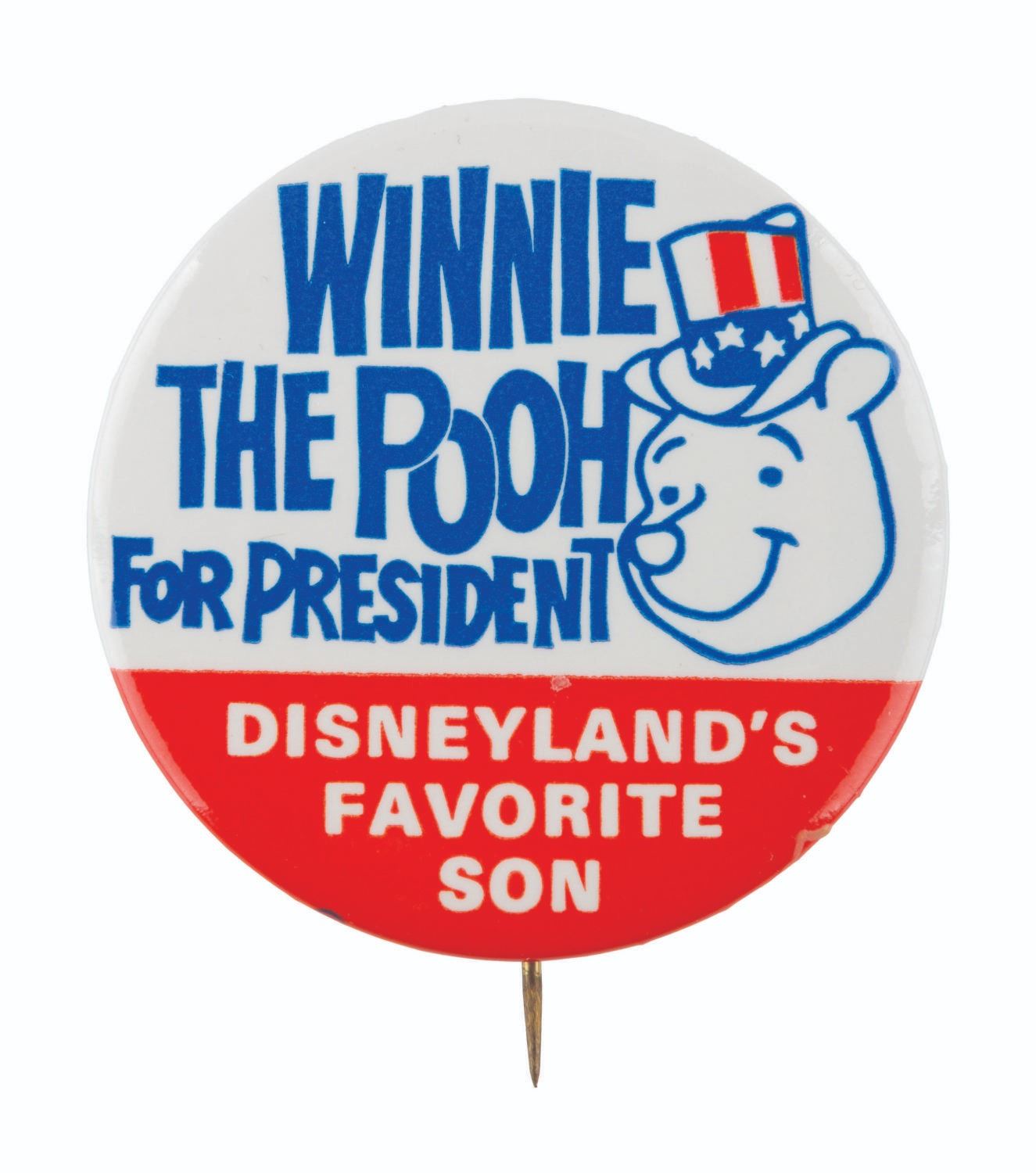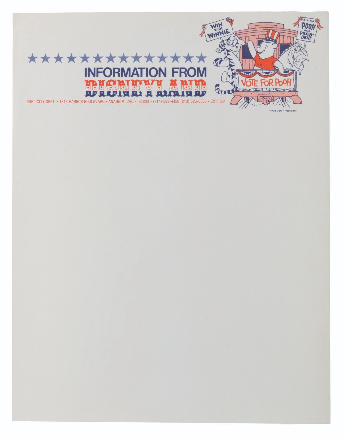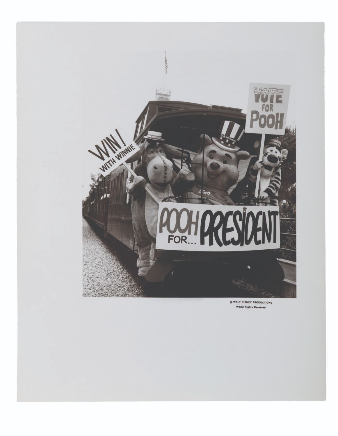 (Disneyland, 1970s) A Pooh for President packet from the Disneyland Guest Relations Department, for the promotions run in 1972 and/or 1976. Included are a 2" button, folder, 8" x 10" photo, and four sheets of Information From Disneyland letterhead featuring Vote For Pooh artwork. The packet is in very good condition, with very light wear from age.