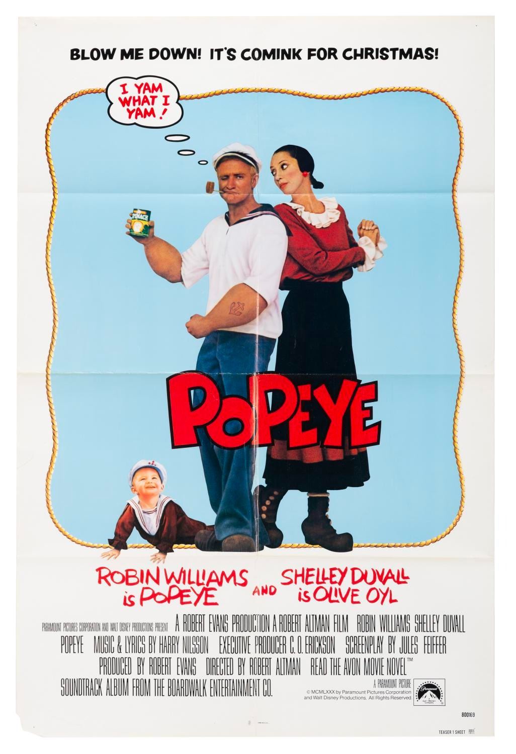 (Paramount, 1980) An original theatrical release one-sheet for "Popeye" starring Robin Williams and Shelley Duvall. Measuring 27" x 41", the poster is in good condition with creasing throughout, edge wear, a two-inch tear to the left edge, and light discoloration from age.
