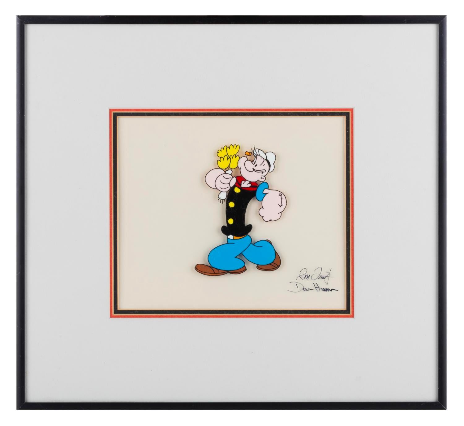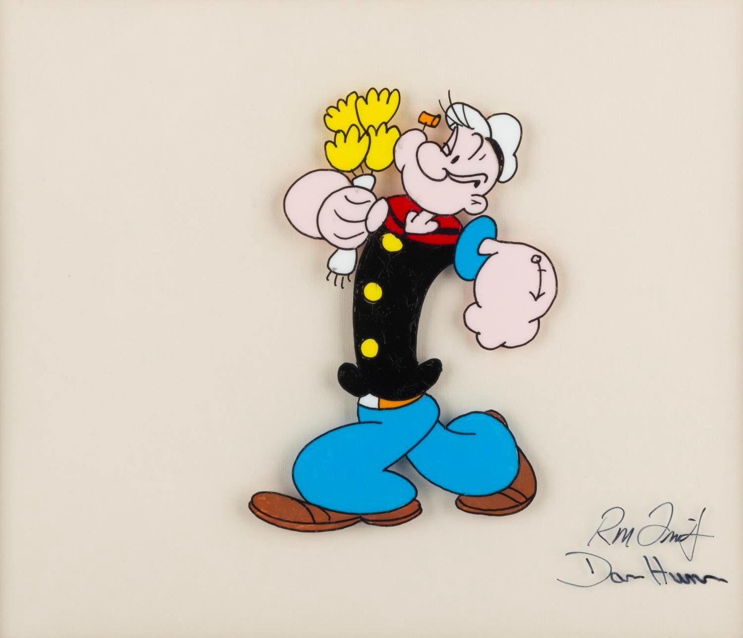 (King Features, 1983) A production cel of Popeye from an unknown European theatrical film, signed in ink by animators Dan Hunn and Ron Fritz. With a character image size measuring 4” x 3” on a 6” x 7” visible cel in a 12.25” x 13.25” frame and matte, the cel is in very good condition with light warping from age and a light smudges.