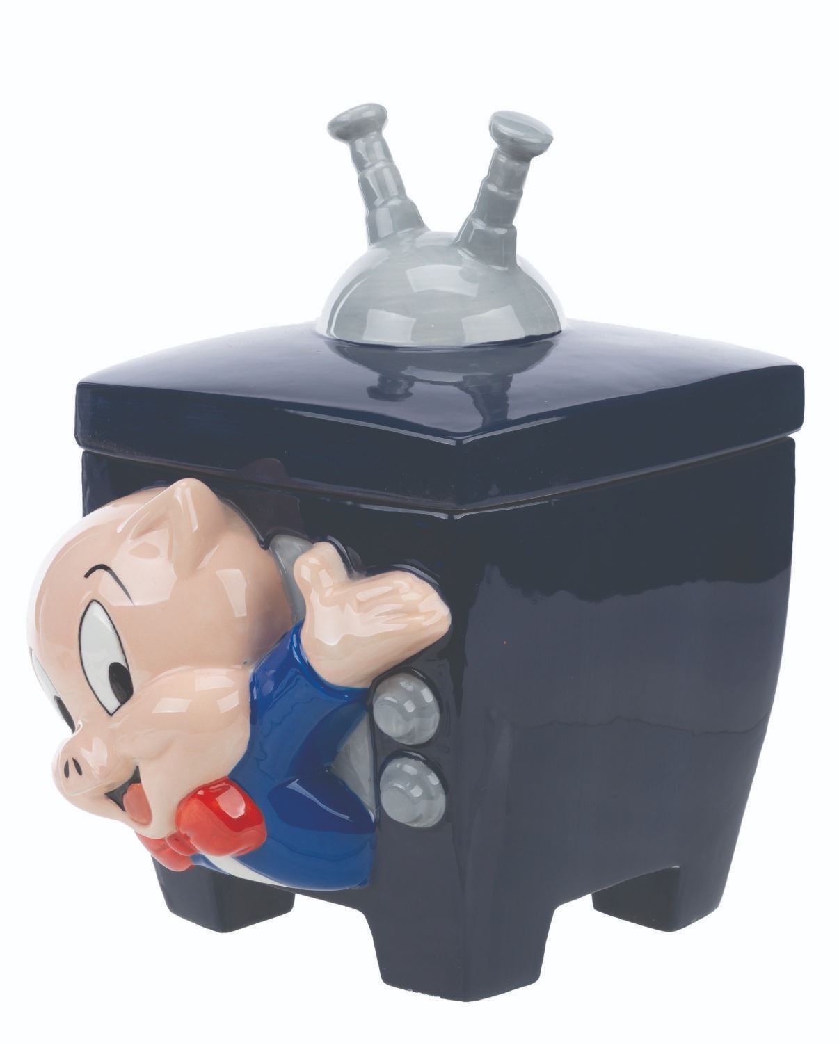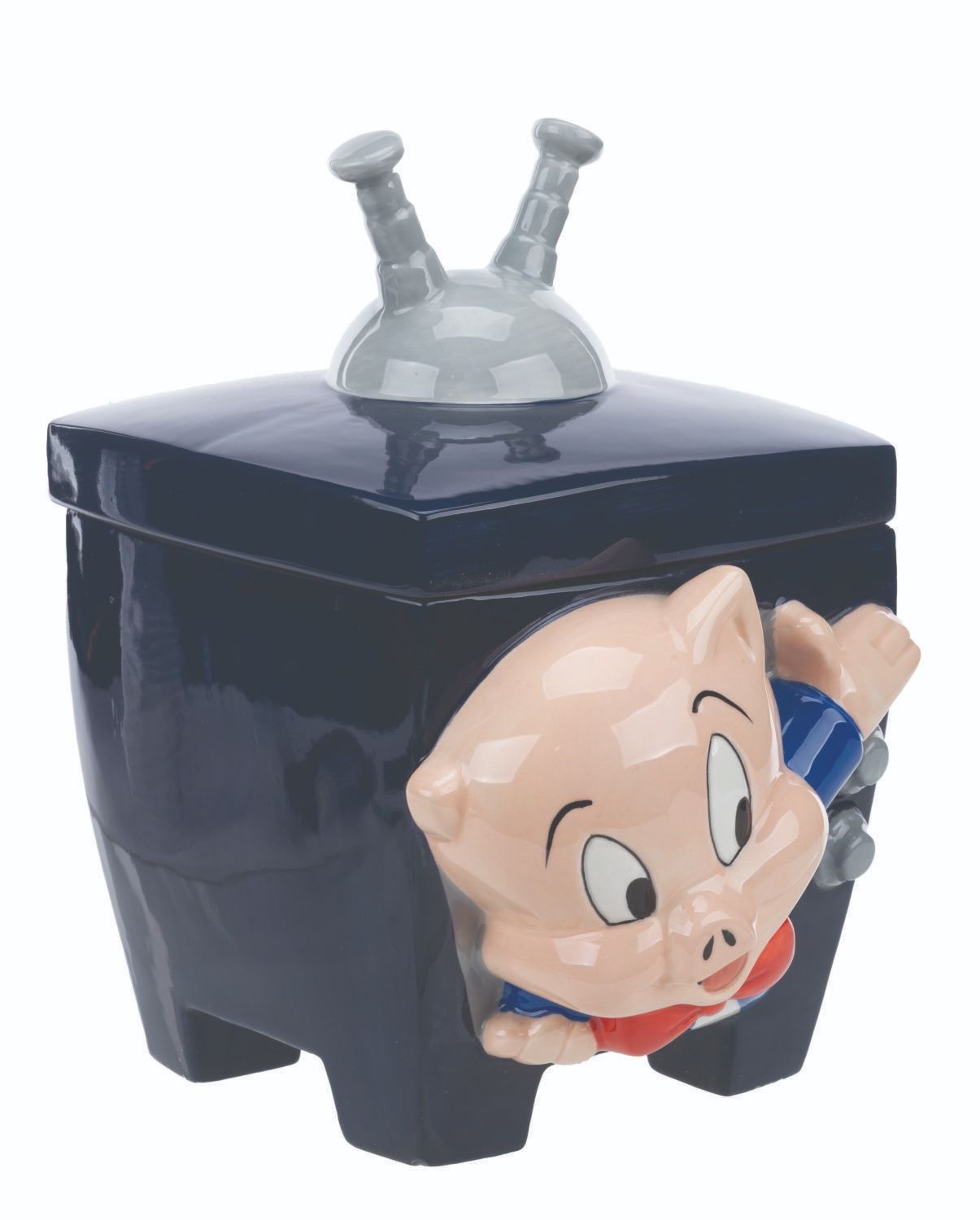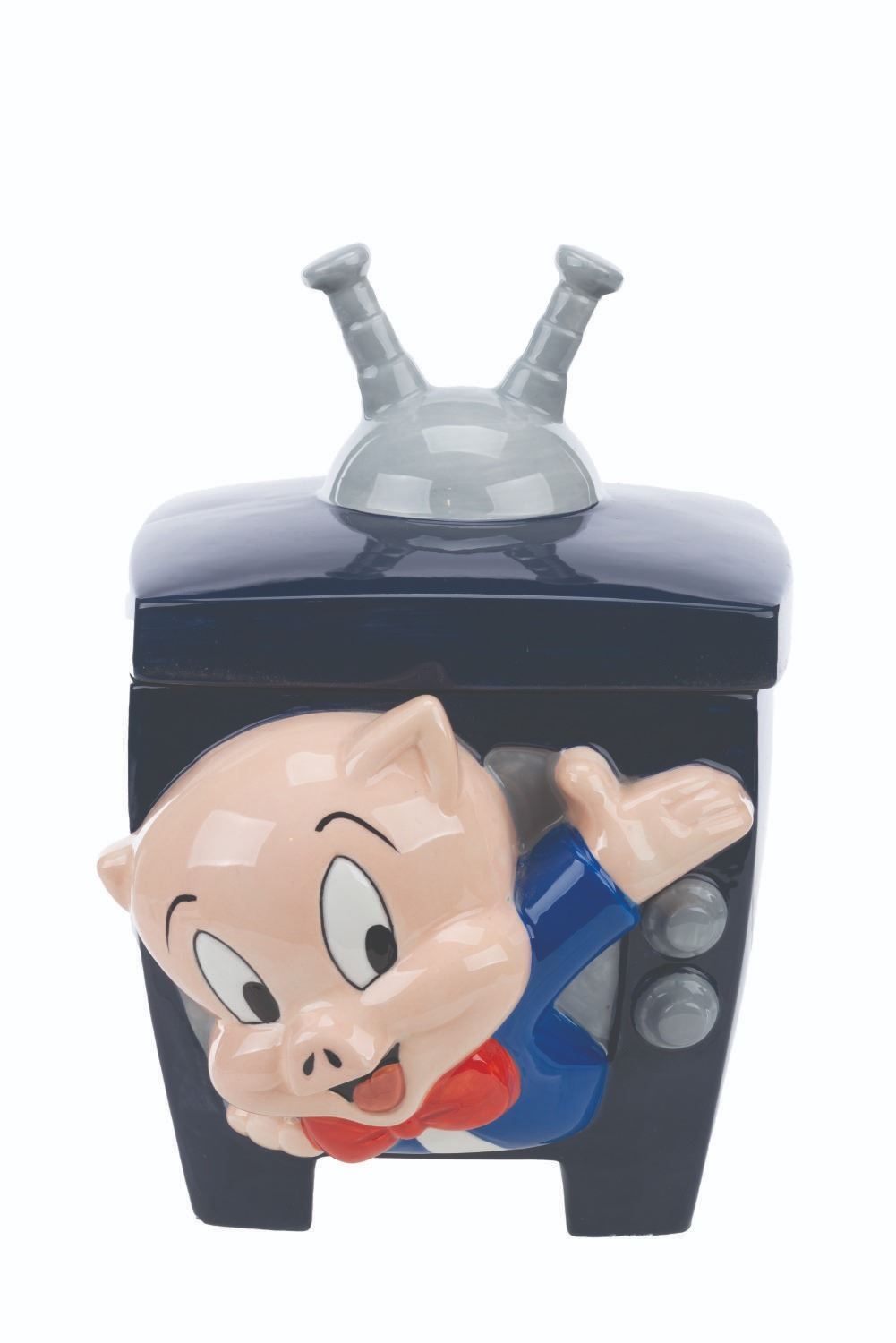 (Warner Bros., 1995) A ceramic cookie jar of Porky Pig popping out of a television set. Measuring 7" x 8" x 10.5" tall, the cookie jar is in very good condition with light wear.