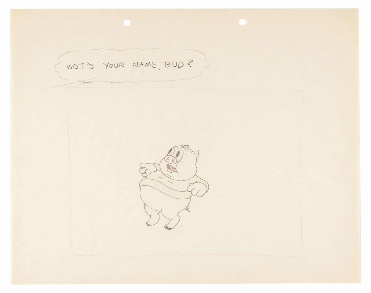 (Schlesinger, 1936) An original storyboard drawing from the Looney Tunes short “Plane Dippy.” Accomplished in graphite and colored pencil with a 3” x 2.5” character image size, the 9.5” x 12” drawing is in fine condition with light discoloration from age.