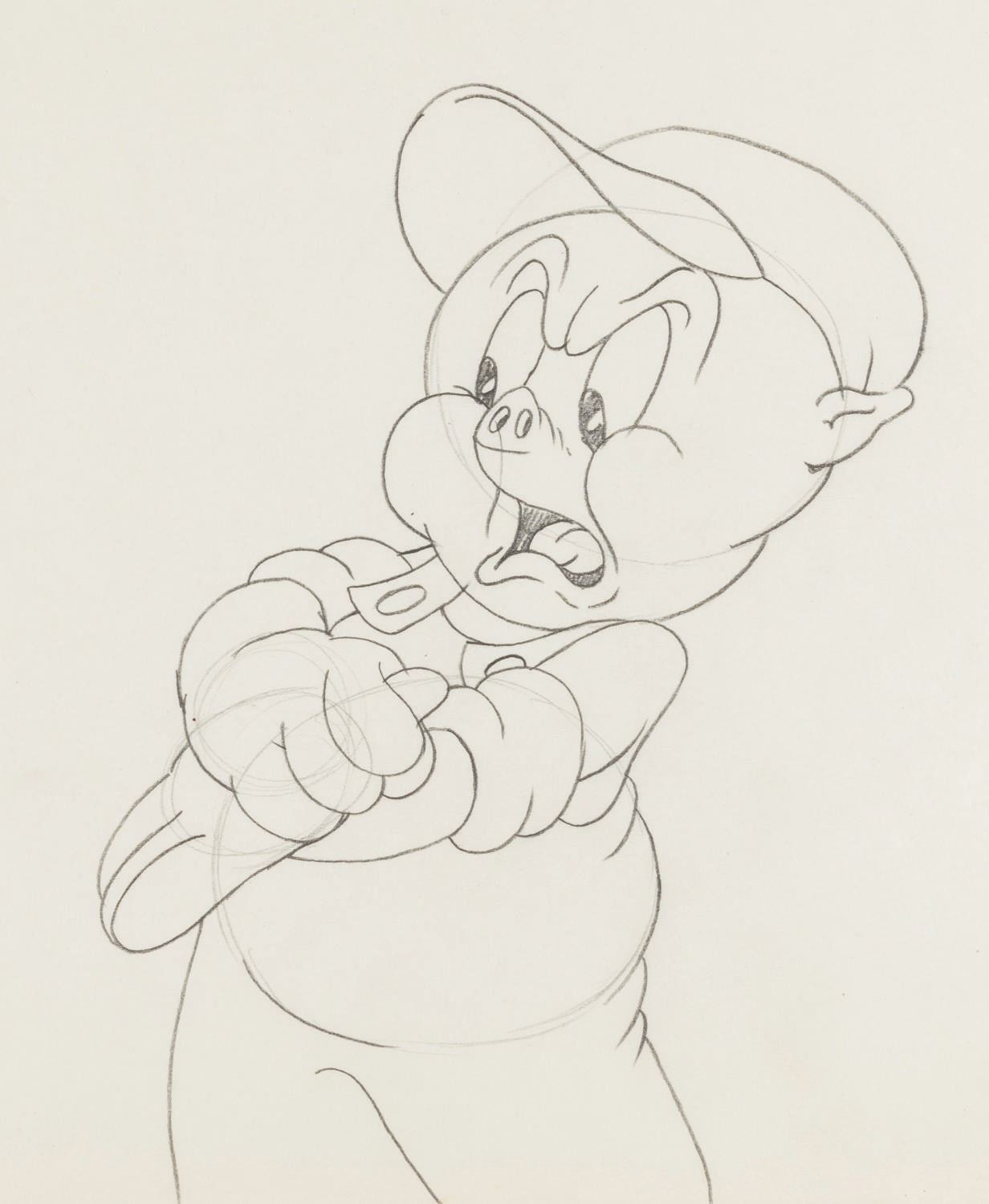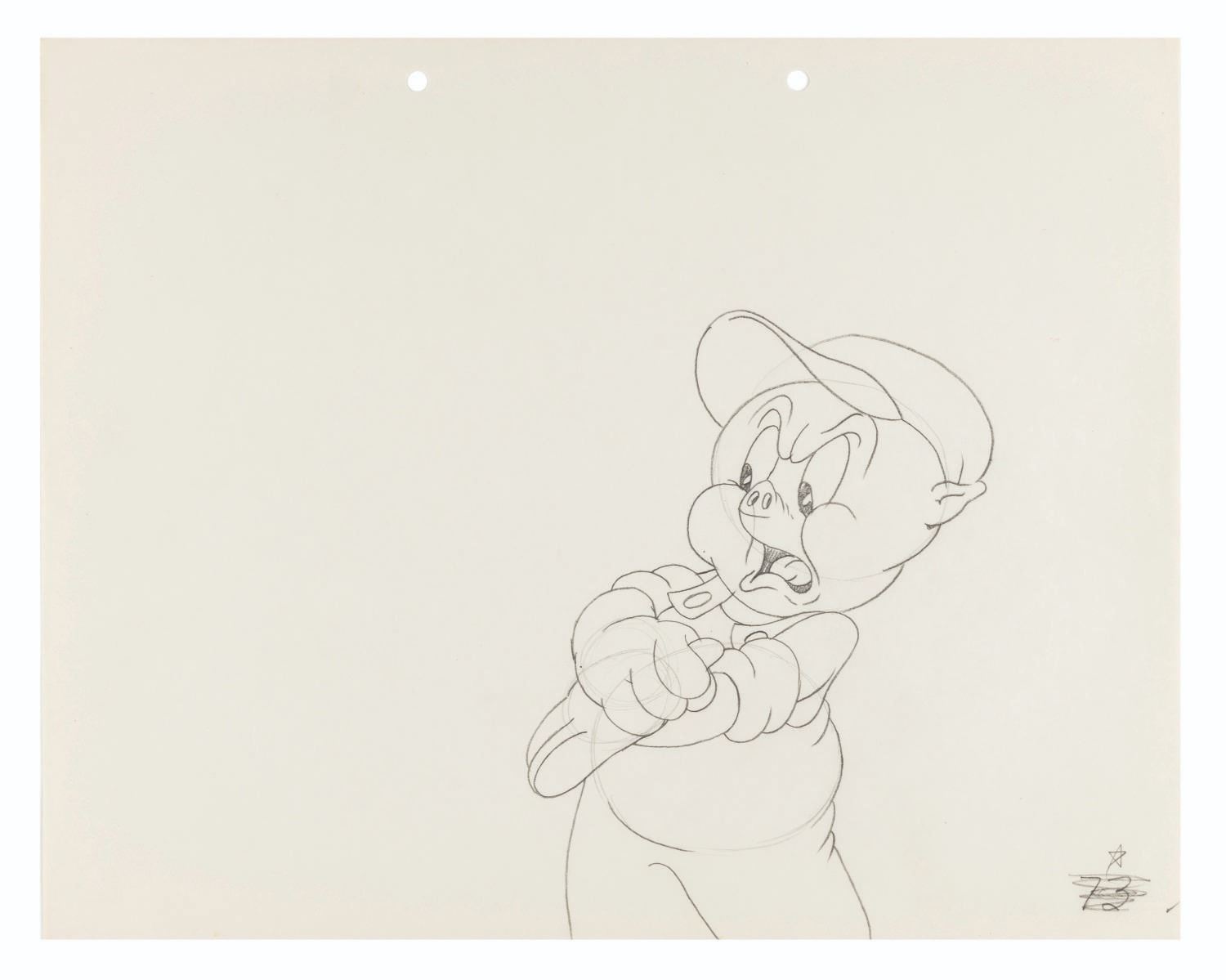 (Warner Bros, 1938) An original production drawing of Porky Pig from the infamous short in which he swears. The short, created for a Warner Brothers’ blooper reel, features Porky hitting his hand with a hammer, stammering and saying “son of a gun,” then laughing as he says the viewer probably thought he was going to say “son of a b****.” Animated by the legendary Rod Scribner, the short was not publicly available until it appeared on several DVD releases as a special feature in 2006. With an image size of 4.75” x 6.75” on a 9.5” x 12” piece of drawing paper, this pencil drawing of Porky Pig is in very good condition with light creases and typical production notations.