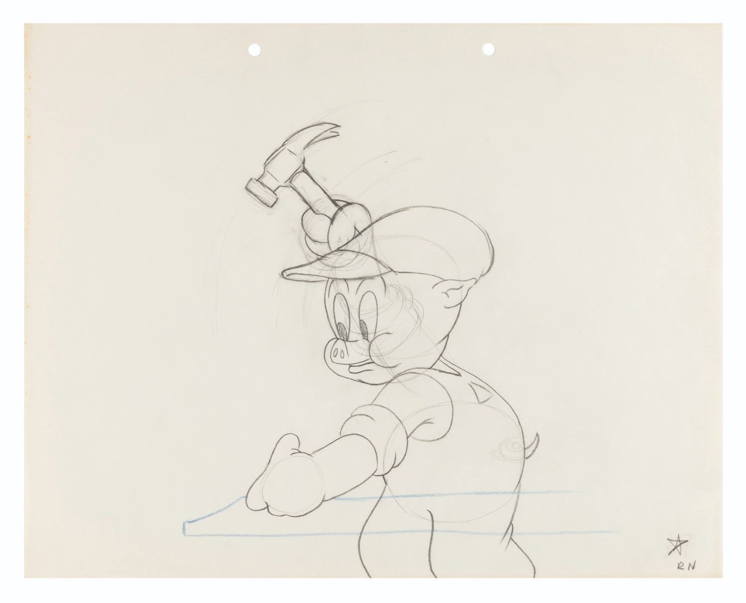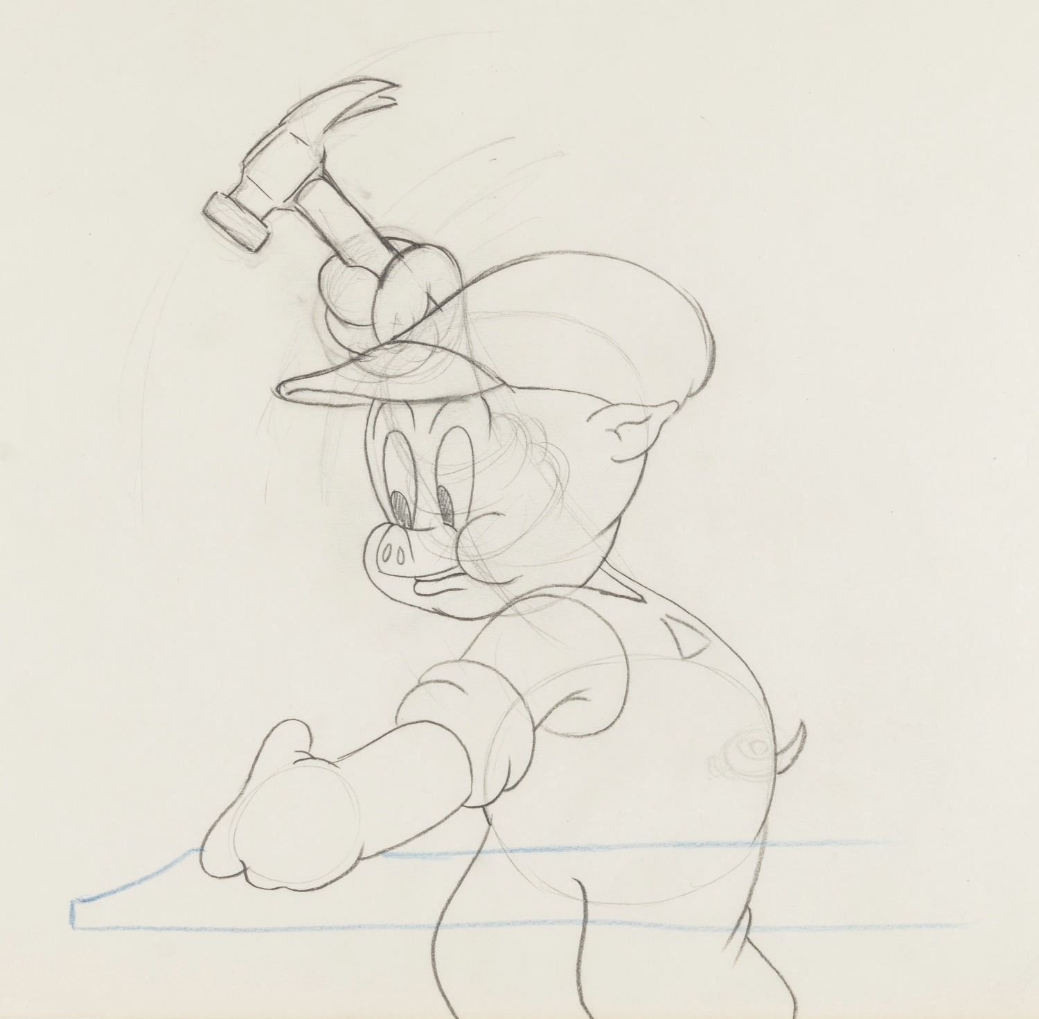 (Schlesinger, 1938) An original production drawing of Porky Pig from the infamous short in which he swears. The short, created for a Warner Brothers’ blooper reel, features Porky hitting his hand with a hammer, stammering and saying "son of a gun,” then laughing as he says the viewer probably thought he was going to say "son of a b****.” Animated by the legendary Rod Scribner, the short was not publicly available until it appeared on several DVD releases as a special feature in 2006. With a character image size of 7.5” x 7.75” on 9.5” x 12” paper, the colored pencil and graphite drawing is in very good condition with light spotting, creases, discoloration from age, and typical production notations.