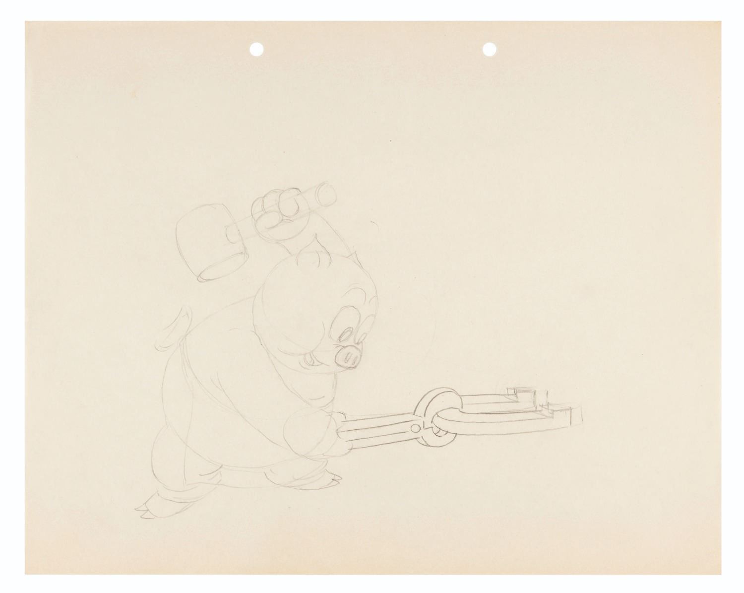 (Schlesinger, 1936) An original production drawing of Porky Pig working as a blacksmith’s assistant in “The Village Smithy.” With a character image size of 6” x 7.5” on 9.5” x 12” animation paper, the drawing is in fine condition.