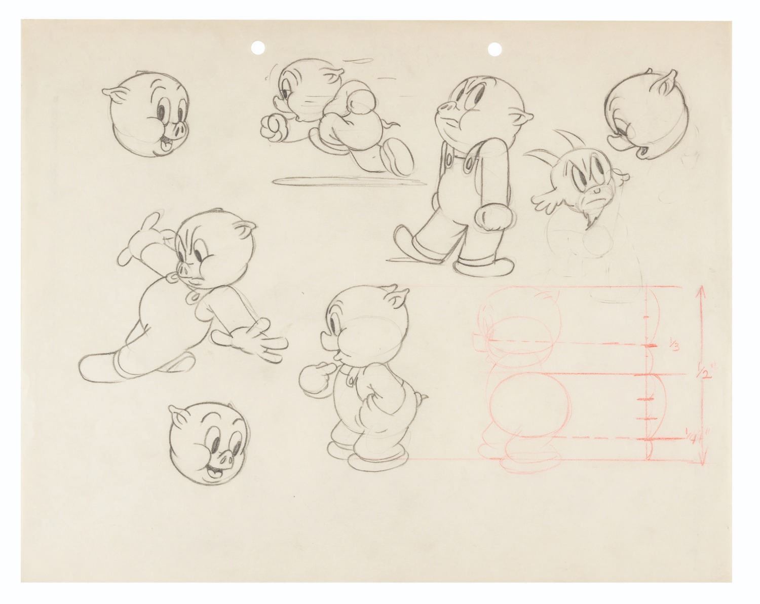 (Schlesinger, 1937) A hand-drawn model of Porky Pig from “Porky and Gabby” directed by Ub Iwerks. The page includes eight drawings of Porky and a single image of Gabby Goat, who made his debut in this film. With an overall image size of 7” x 10.5” on 9.5” x 12” animation paper, the drawing is in very good condition with light wear typical of production use and age.