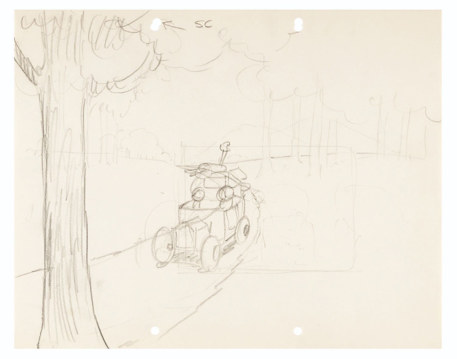 (Schlesinger, 1937) A rough layout drawing for the Looney Tunes cartoon “Porky and Gabby.” With a full-page image on 9.5" x 12" animation paper, the drawing is in very good condition, with light wear from production use, and slight discoloration from age.