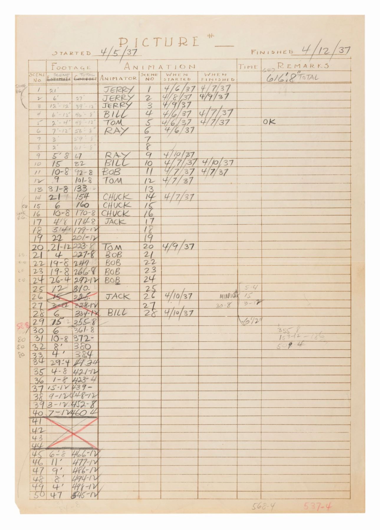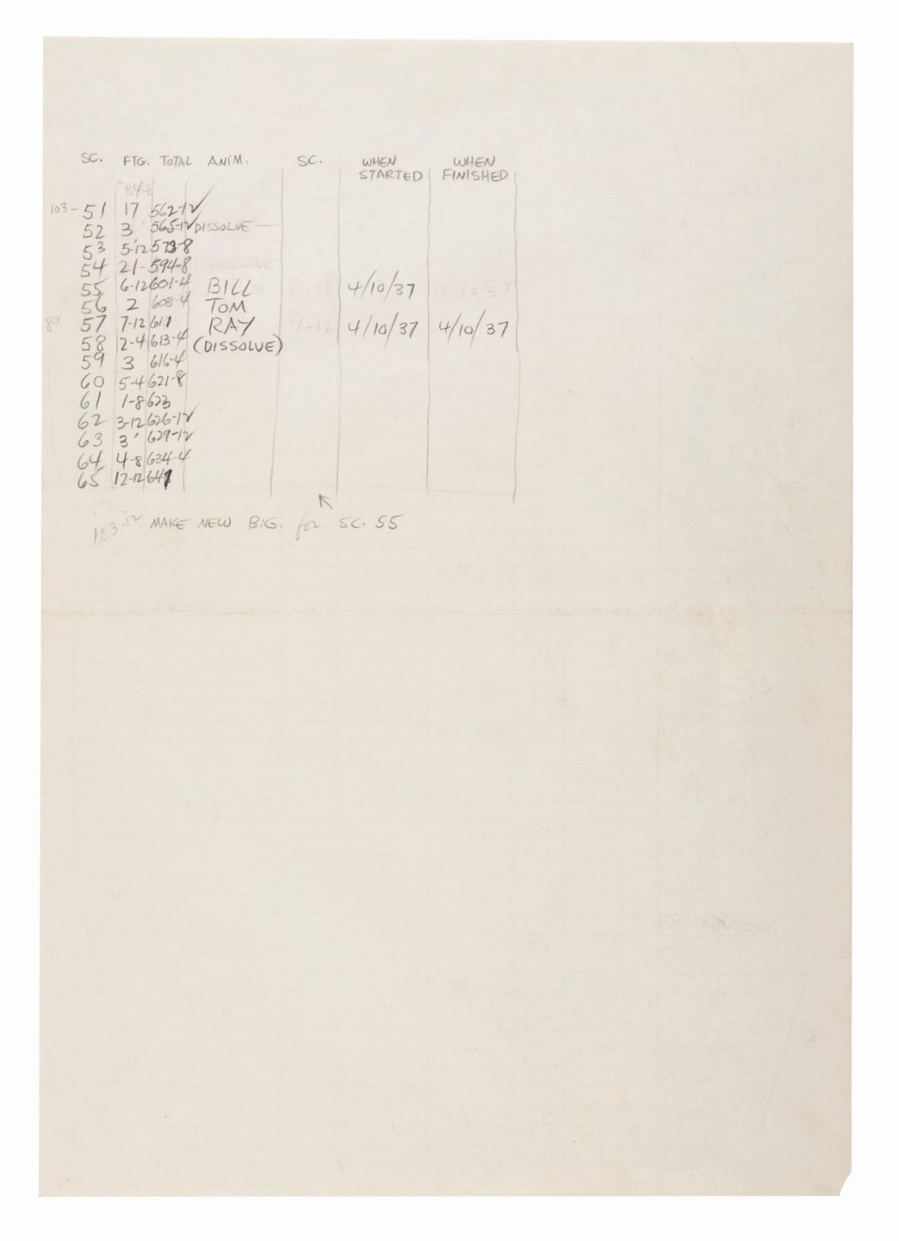 (Schlesinger, 1937) A Studio animation draft for the Looney Tunes short “Porky’s Badtime Story.” The draft details each sequence and scene of the cartoon, identifying lead animators, length of film footage, and other production specifics. This draft marks Bob Clampett’s promotion to a full director after the original supervisor, Ub Iwerks, left mid-production. Measuring 15” x 10.5”, the draft is in good condition with a horizontal fold through the center, edge wear from production use, a small 0.25” rip to the bottom left corner, and light discoloration from age.
