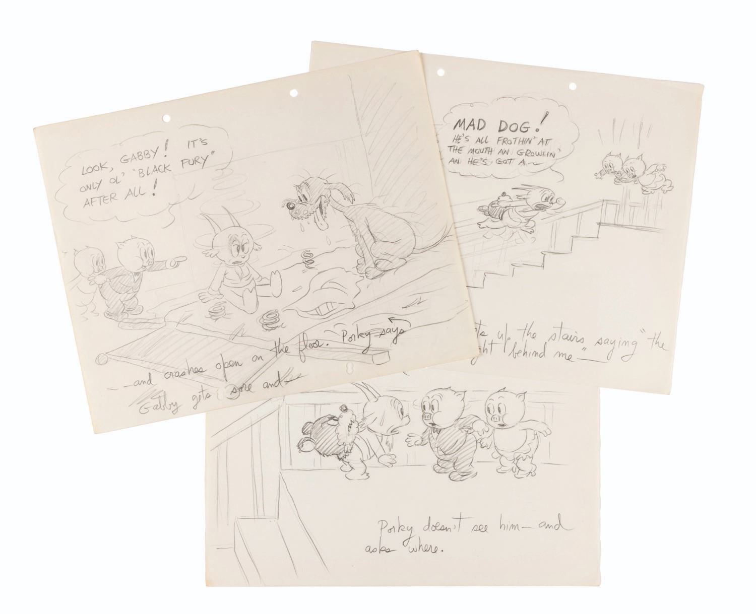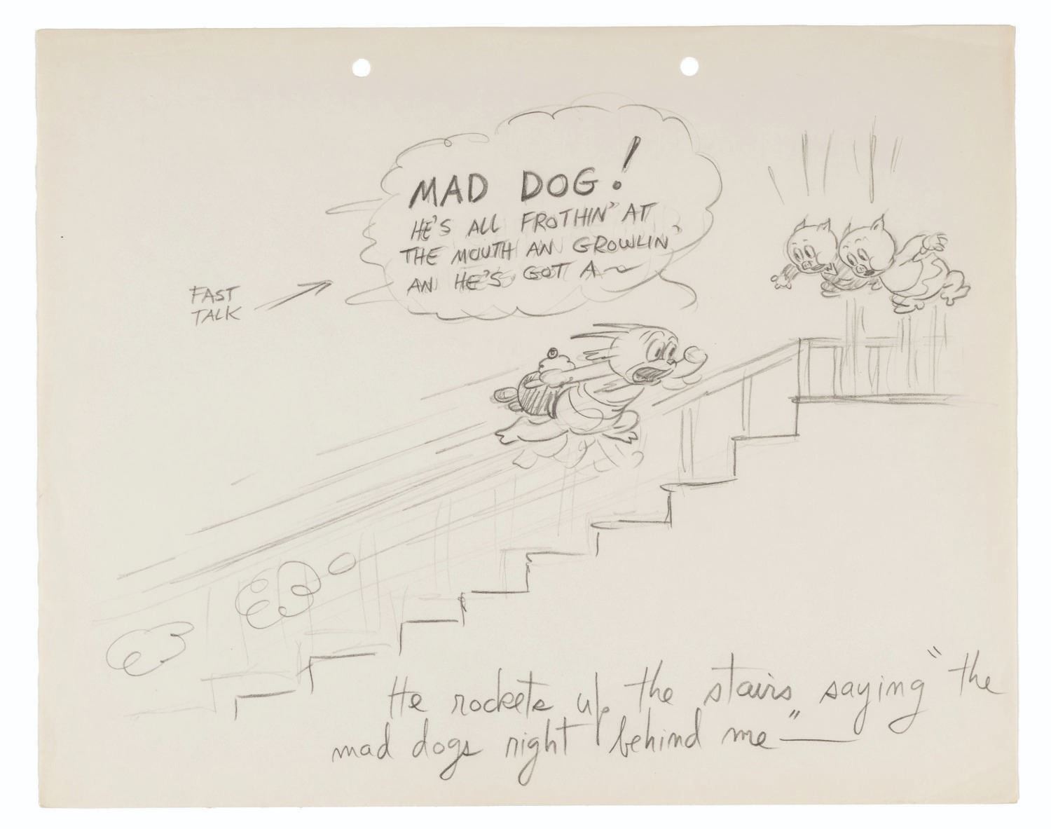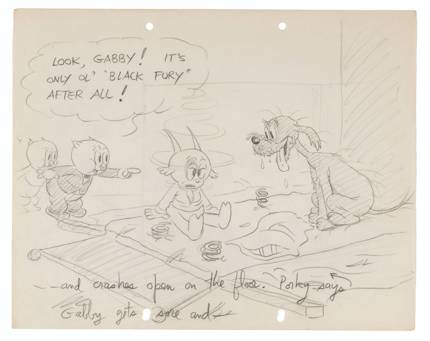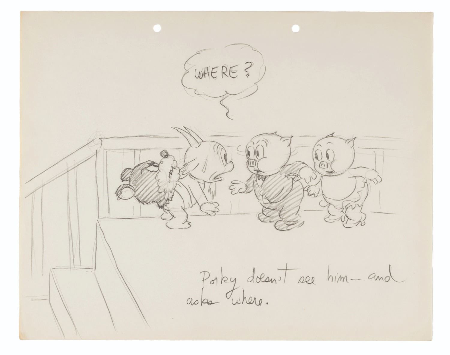 (Schlesinger, 1938) An early story drawing for the Looney Tunes short “Porky’s Party,” directed by Bob Clampett. Though he does not appear in the film, this drawing shows that Gabby Goat was originally planned to co-star alongside Porky. Accomplished in graphite and measuring 9.5” x 12”, the drawings is in very good production-used condition with light edge wear, creases, and discoloration from age.