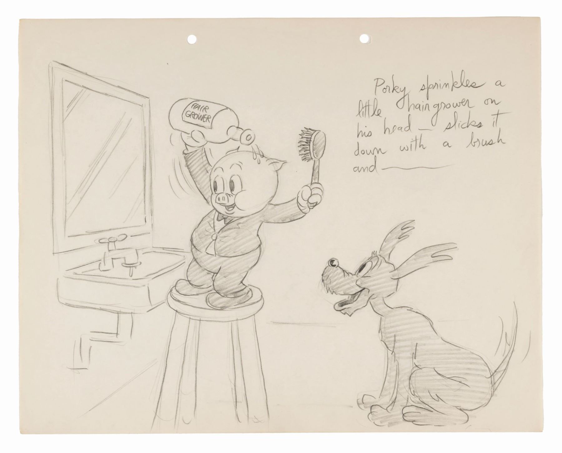 (Schlesinger, 1938) A story drawing of Porky Pig from “Porky’s Party,” directed by Bob Clampett. Accomplished in graphite on 9.5” x 12” animation paper, the drawing is by Clampett, and the notes are in his handwriting. The artwork is in fine condition with light discoloration from age.