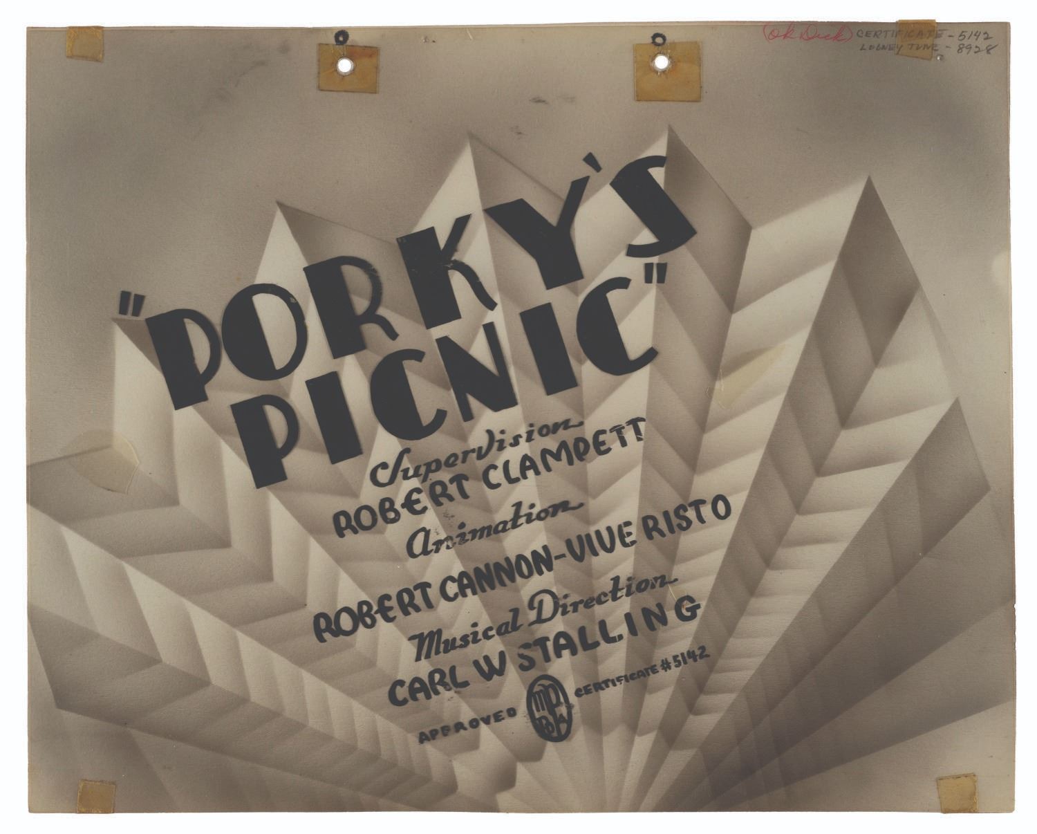 (Schlesinger, 1939) The original hand-painted title card and background from the Looney Tunes short “Porky’s Picnic,” directed by Bob Clampett. With an image size of 7.25” x 7.5” on a 10” x 12.5” cel with the original 10” x 12.5” background, the piece displays in very good condition with light edge tears, spots of paint loss, scratches, scuffs, and tape from production use.