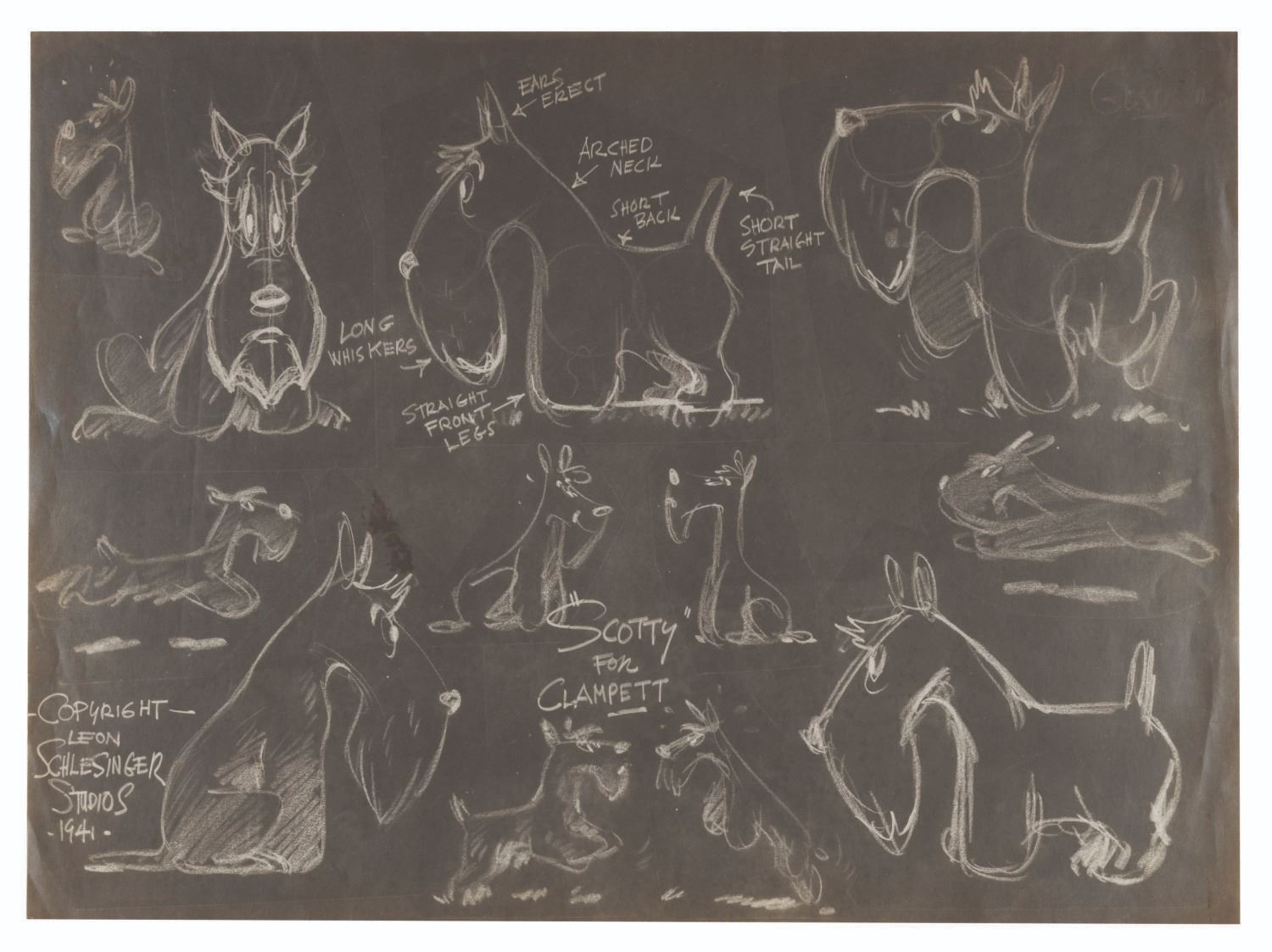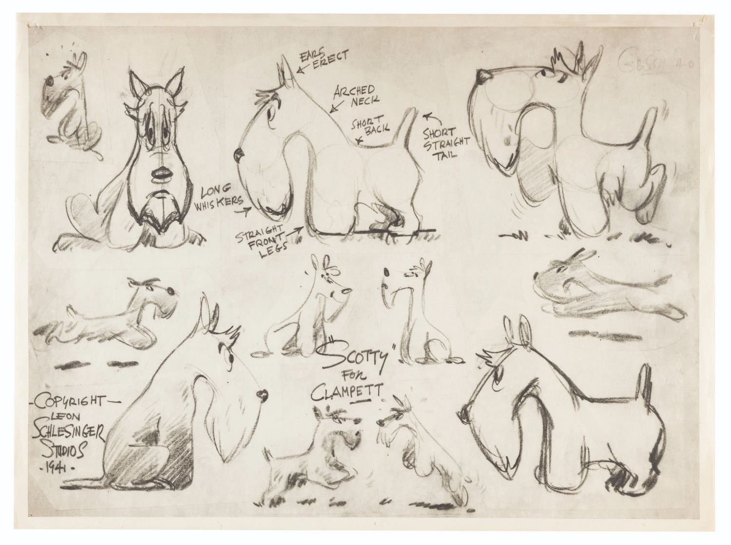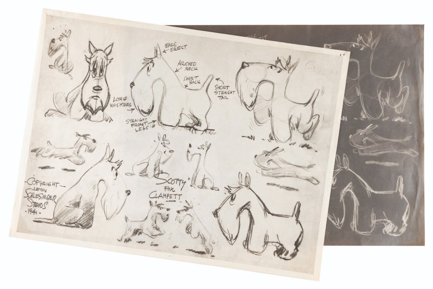 (Schlesinger, 1941) An original photostat model sheet and negative print from “Porky’s Pooch” of the homeless Scotty dog in the cartoon’s opening. Model sheets such as this were distributed to animators and crew working on the film to ensure character design continuity. The negative was used to create the positive prints. Measuring 11” x 14” and 10.5” x 14.25”, the model sheets are in very good condition with pinholes in the positive, and light wear from production use.