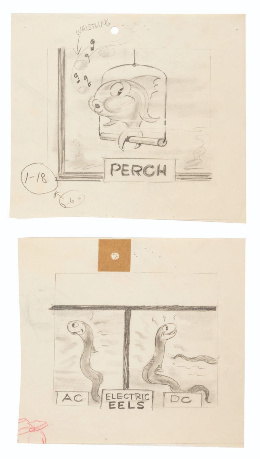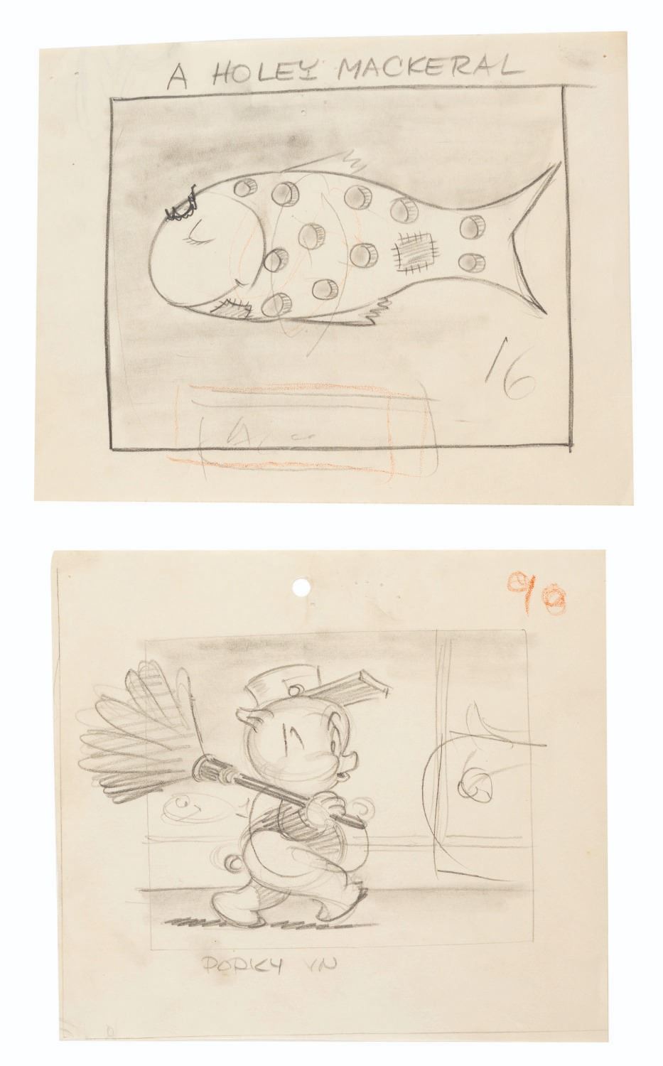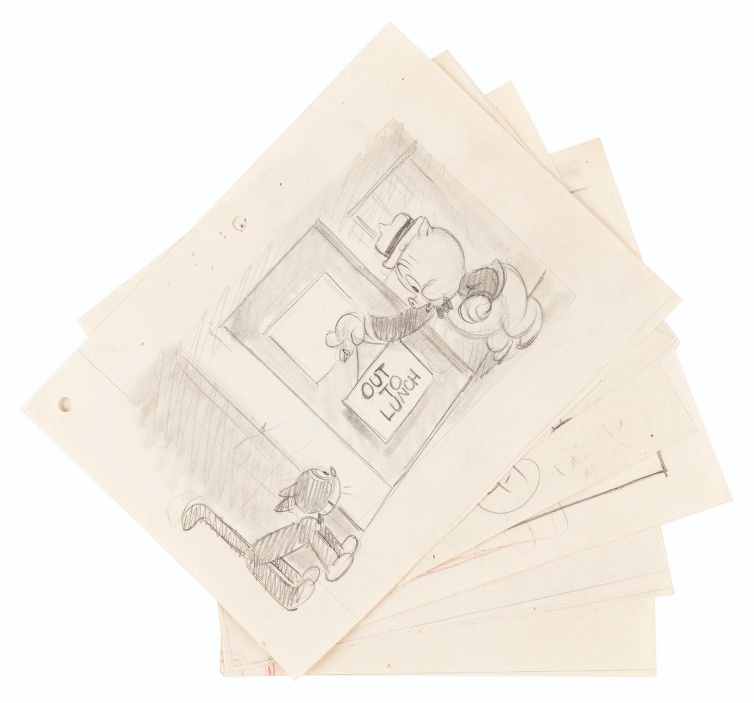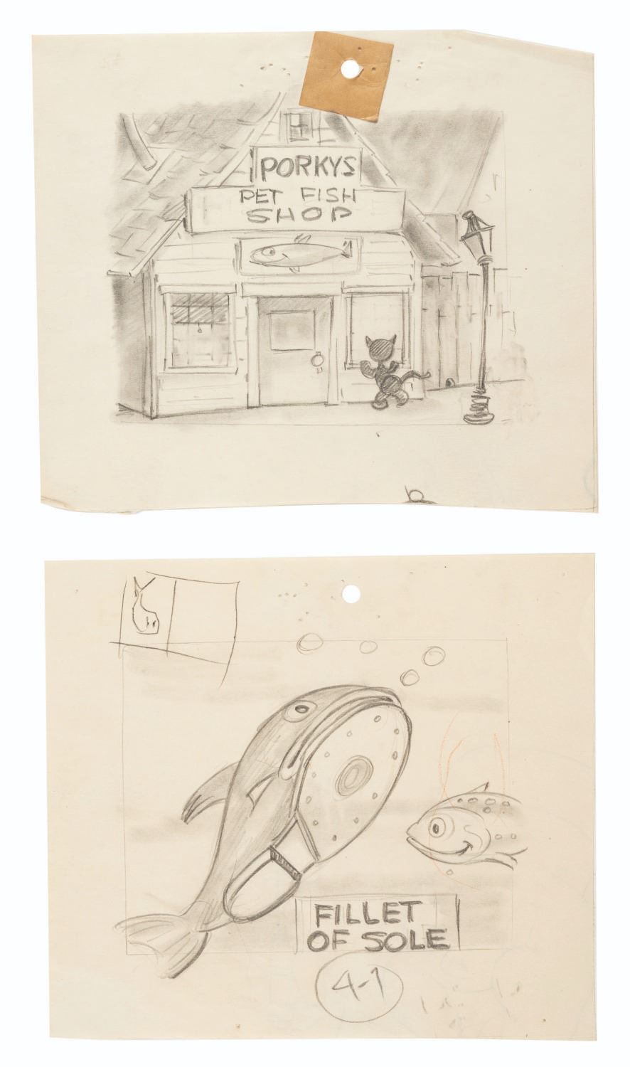 (Schlesinger, 1940) A collection of seven storyboard panels from the Looney Tunes short “Porky’s Poor Fish,” directed by Bob Clampett. Accomplished in graphite, the panels feature Porky, the cat, several fish, and a production drawing from the Looney Tunes short, “Porky’s Last Stand” on the reverse side of one of the pages. This was not uncommon, as Warner Bros. would save money by cutting old production drawings into quarters for the backs to be used as storyboard paper. Ranging in size from 6.25” x 7” to 6.5” x 8.5”, the panels display in very good production-used condition with creases, pinholes with some corner tears, and light discoloration from age.