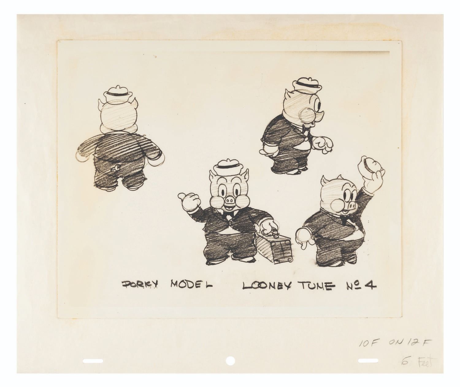 (Schlesinger, 1937 A photo print model sheet of Porky Pig from the Looney Tunes cartoon “Porky the Wrestler.” The print measuring 8” x 10” is affixed to 10.5” x 12.5” animation paper, and is in good condition with light toning.