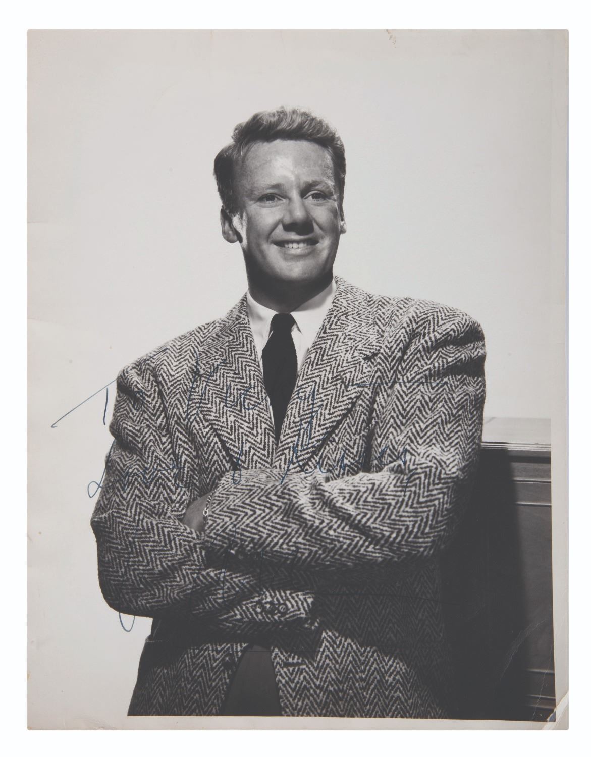 (Van Johnson, 1940's) A portrait photo of actor Van Johnson, signed with dedication to MGM Costume and Wardrobe Matron Vicky Nichols. The original gelatin silver matte print measures 10"x13" and is in fair condition, with wear from age and handling including small creases & smudges, light toning, and scrapbook page residue on the back.