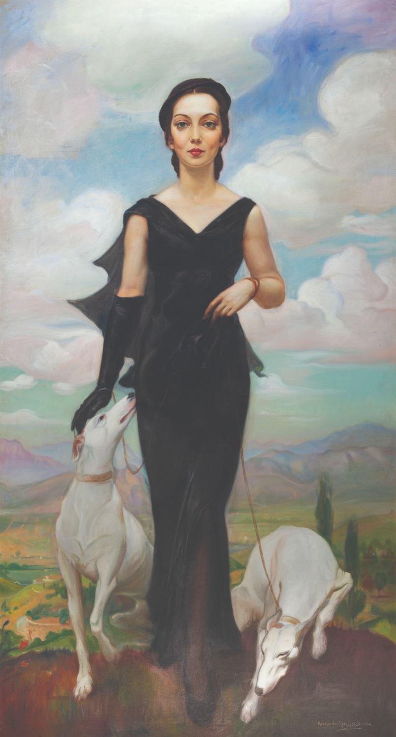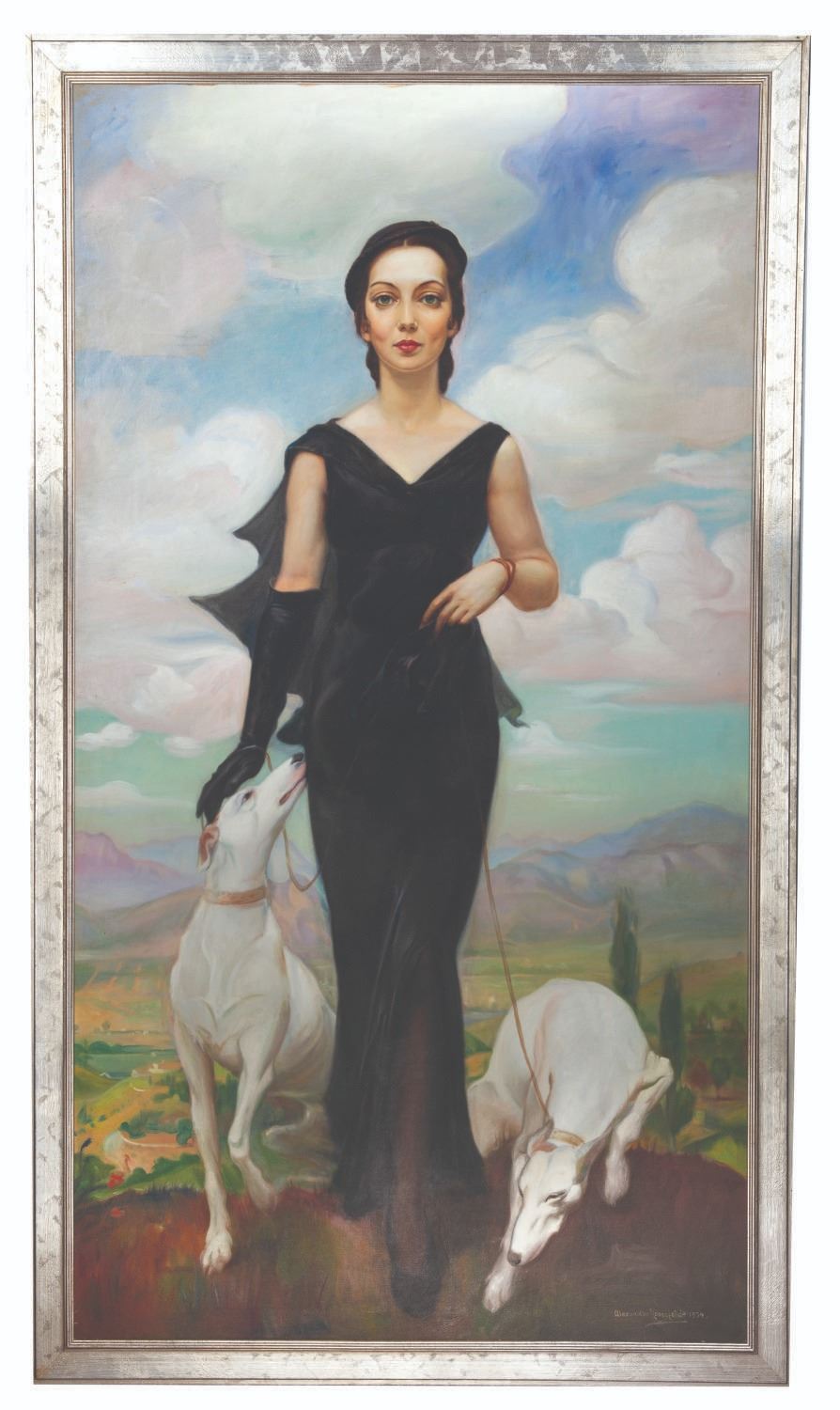 (Rosenfeld, 1934) A portrait of a Lady with greyhounds, by Alexander Rosenfeld. Rosenfeld rose to prominence in the 1920s, painting the elite of Boston and New York. After moving to Los Angeles in 1929, his work included art for the motion picture industry and private portrait commissions. Signed and dated 1934, this dramatic portrait piece is one of the largest on record. On a 40" x 72" canvas, the subject is presented at nearly life size and holds the viewer in her gaze as she crests a hilltop. This unique portrait is in fine condition, showing slight wear from display. Due to size and weight, special shipping arrangements are required. Please inquire before bidding.