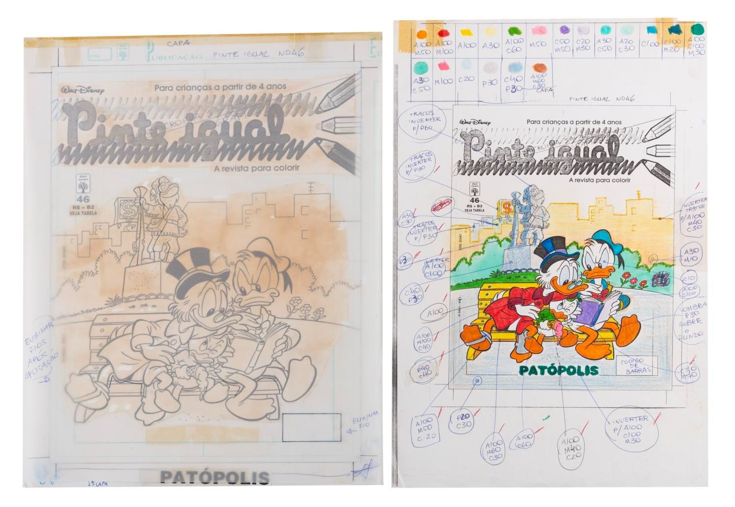 (Disney, 1970s-80s) A color model sheet and production layout for the cover of a Portuguese coloring book featuring Donald Duck and Uncle Scrooge. Measuring 8.5” x 12.5”, the color model accomplished in markers and colored pencils on a photocopy is in good production-used condition with spots of discoloration along the top from tape. The 10” x 12.5” layout is in good condition with discoloration from age.