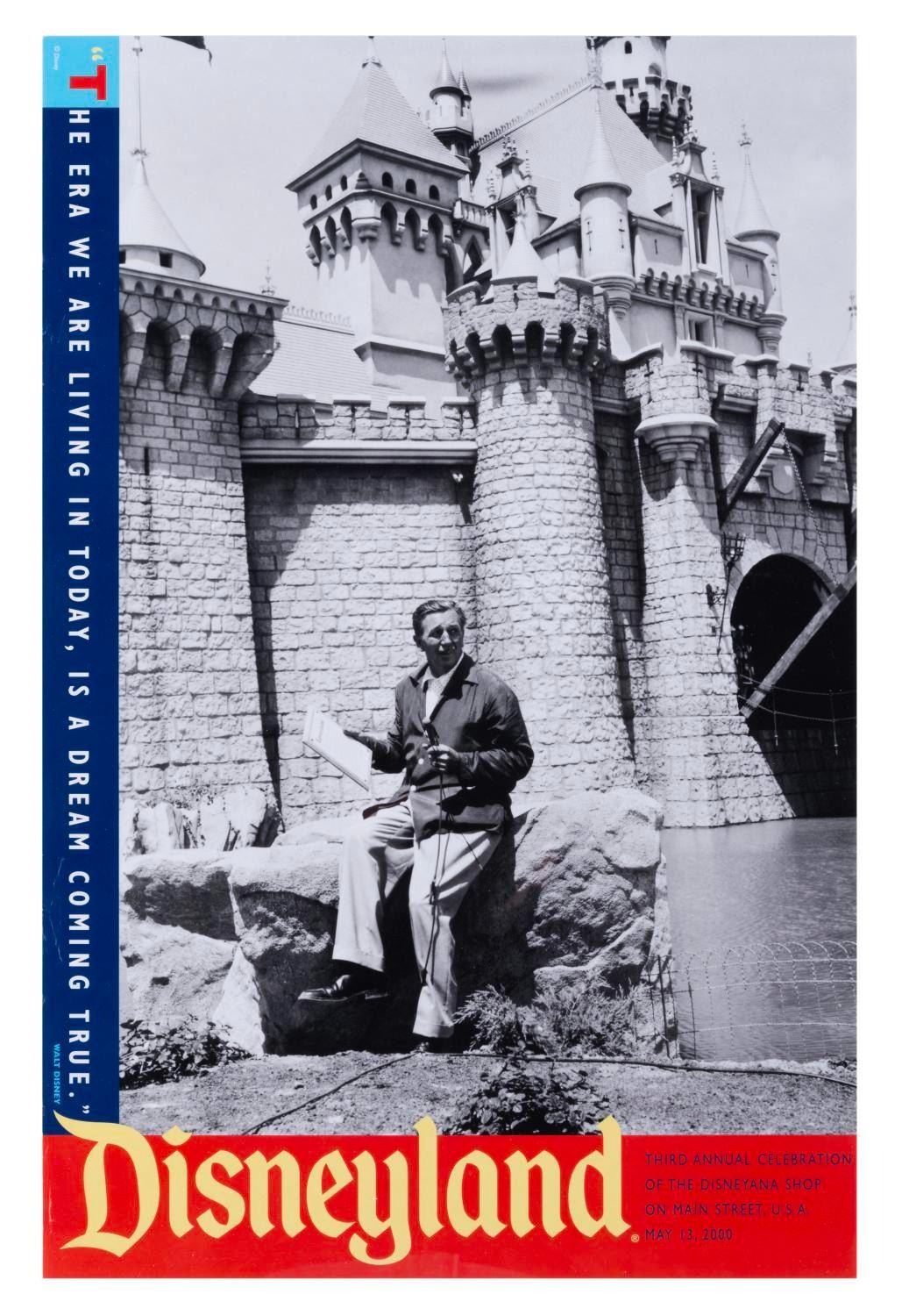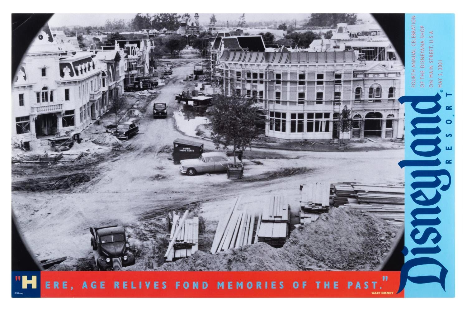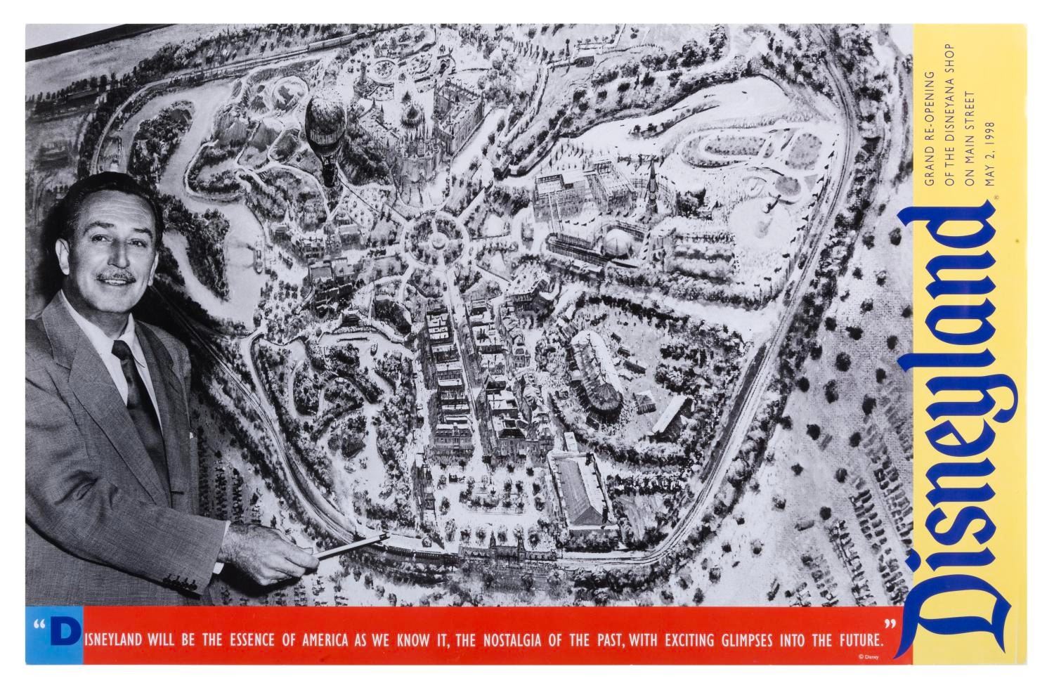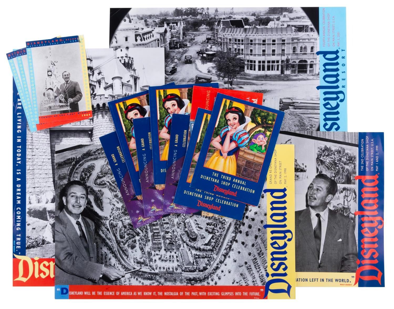 (Disneyland, 1998-2001) A set of four posters celebrating the Disneyana Shop for its reopening at a new Main Street location on May 2, 1998, and in three annual celebrations that followed. The posters each feature a quote from Walt Disney with images of him developing Disneyland, on Opening Day, or of Disneyland construction. Also included are 11 copies of four different postcards, mailers, and brochures from the Shop for these events. Measuring 11" x 17", the posters are in very good condition with some light edge wear. The cards and mailers measure 4.25" x 6" and 5" x 7", in good condition, several with scuffs and handling wear.
