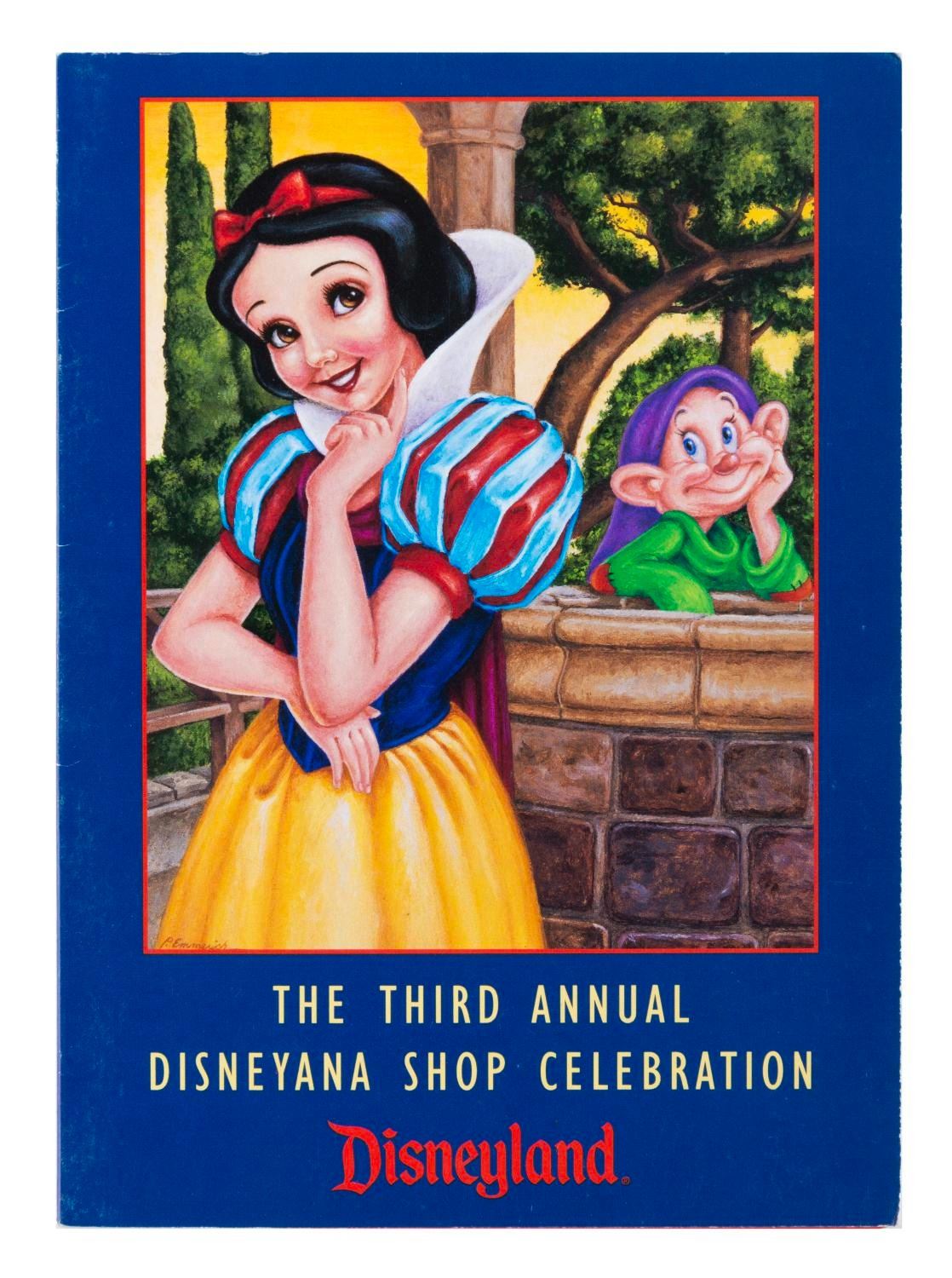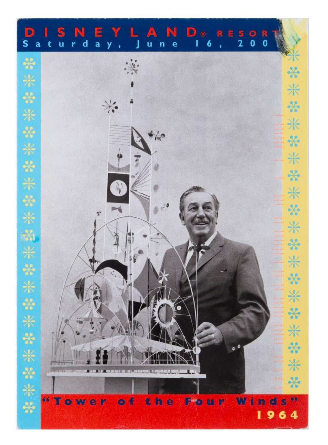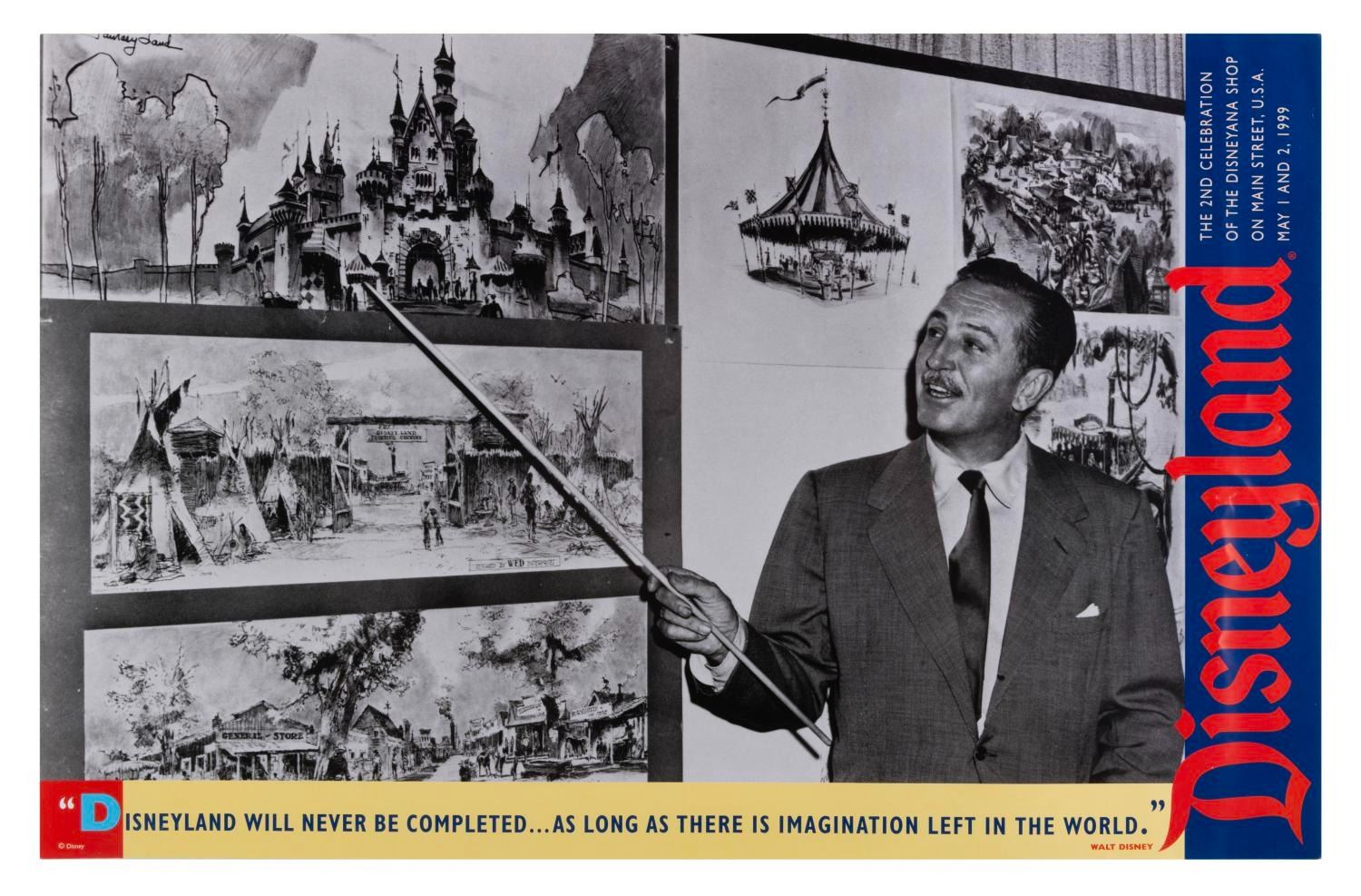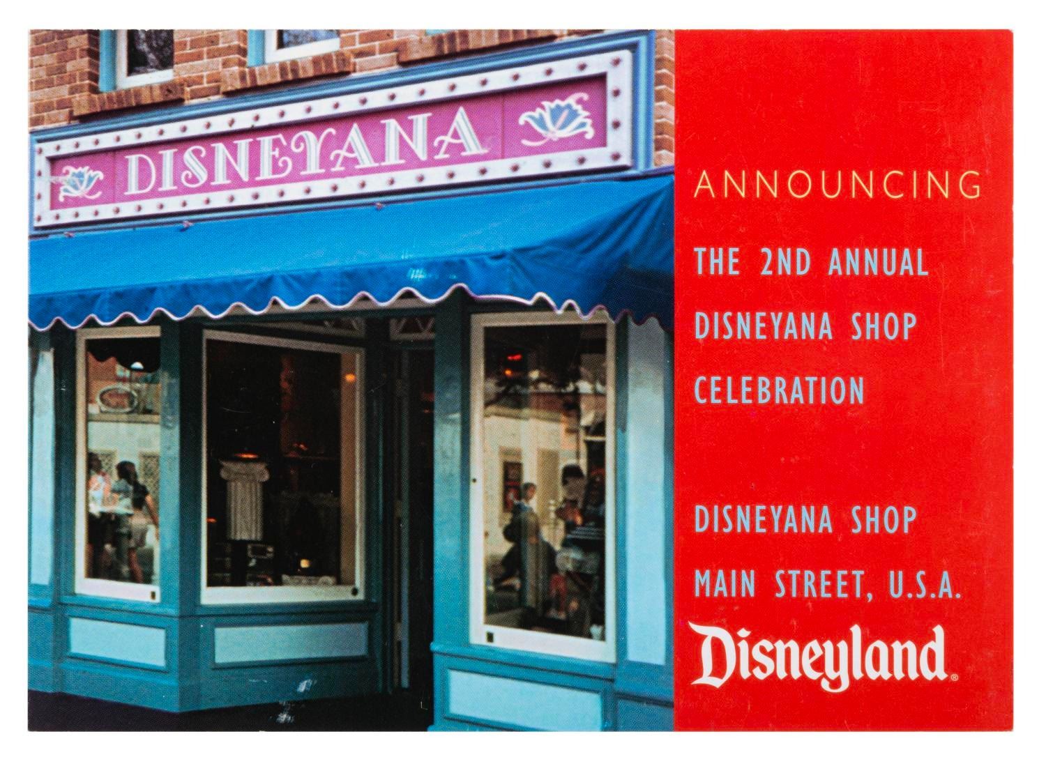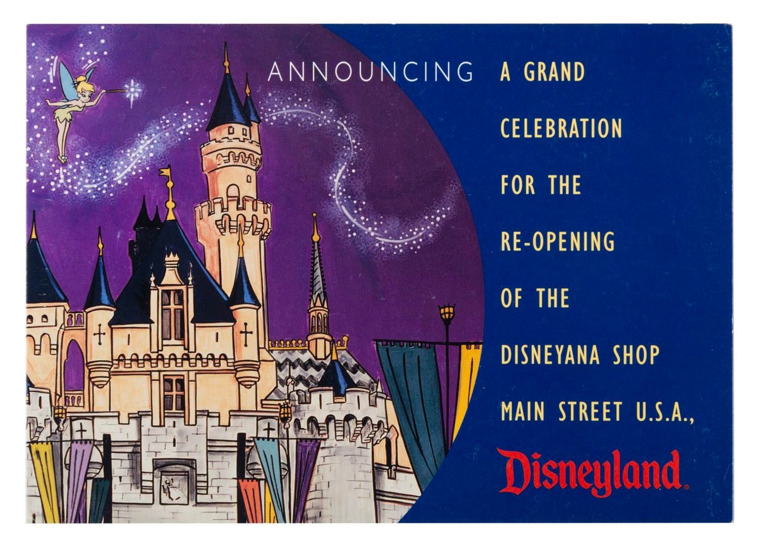 (Disneyland, 1998-2001) A set of four posters celebrating the Disneyana Shop for its reopening at a new Main Street location on May 2, 1998, and in three annual celebrations that followed. The posters each feature a quote from Walt Disney with images of him developing Disneyland, on Opening Day, or of Disneyland construction. Also included are 11 copies of four different postcards, mailers, and brochures from the Shop for these events. Measuring 11" x 17", the posters are in very good condition with some light edge wear. The cards and mailers measure 4.25" x 6" and 5" x 7", in good condition, several with scuffs and handling wear.