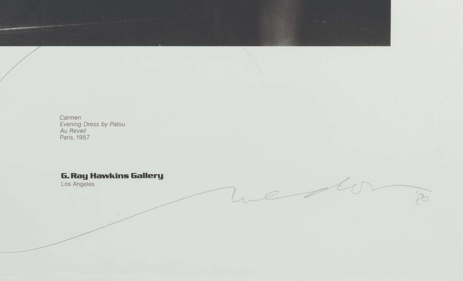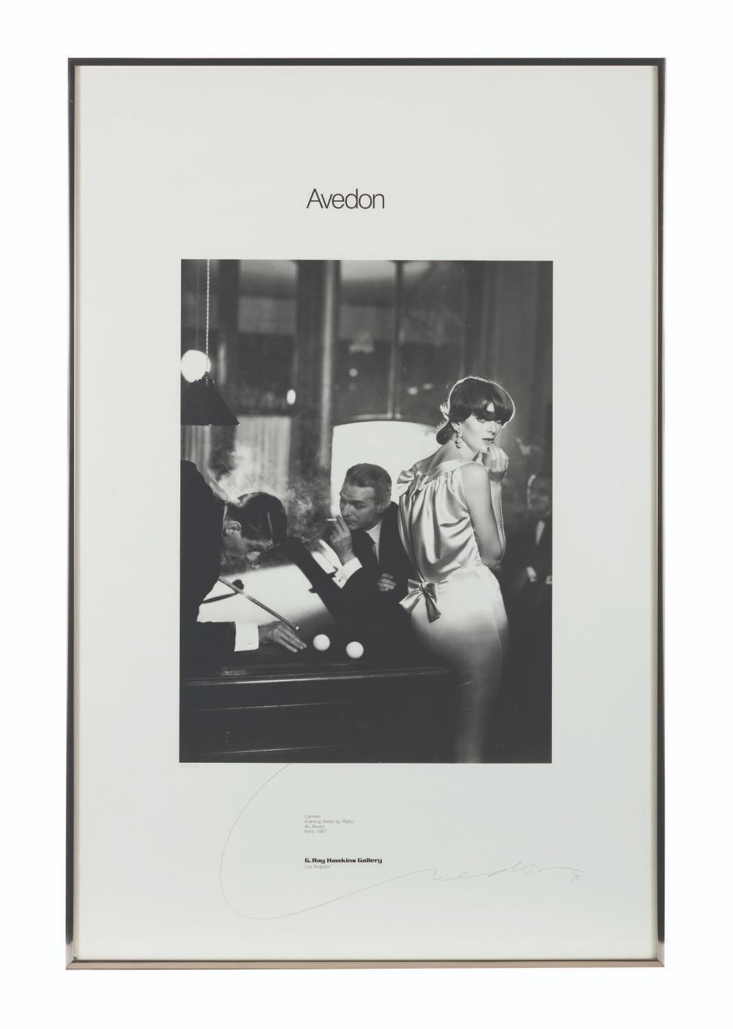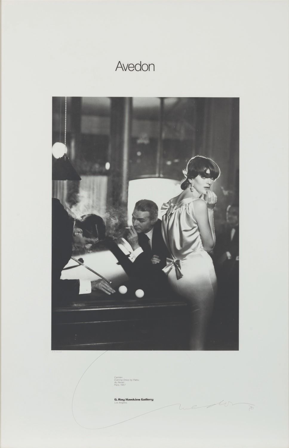(G. Ray Hawkins Gallery, 1980) An exhibition poster from a showing of Richard Avedon's work at the G. Ray Hawkins Gallery in 1980. Avedon (1923-2004) was a noted American fashion and portrait photographer who the New York Times said"helped define America's image of style, beauty and culture for the last half-century." This print of a photo entitled"Au Reveil" (In the Morning) is numbered 53 of 250 and signed broadly in pencil by Avedon. With image size 15.5"x19.5" on 23"x35" paper, the poster is in fine condition.