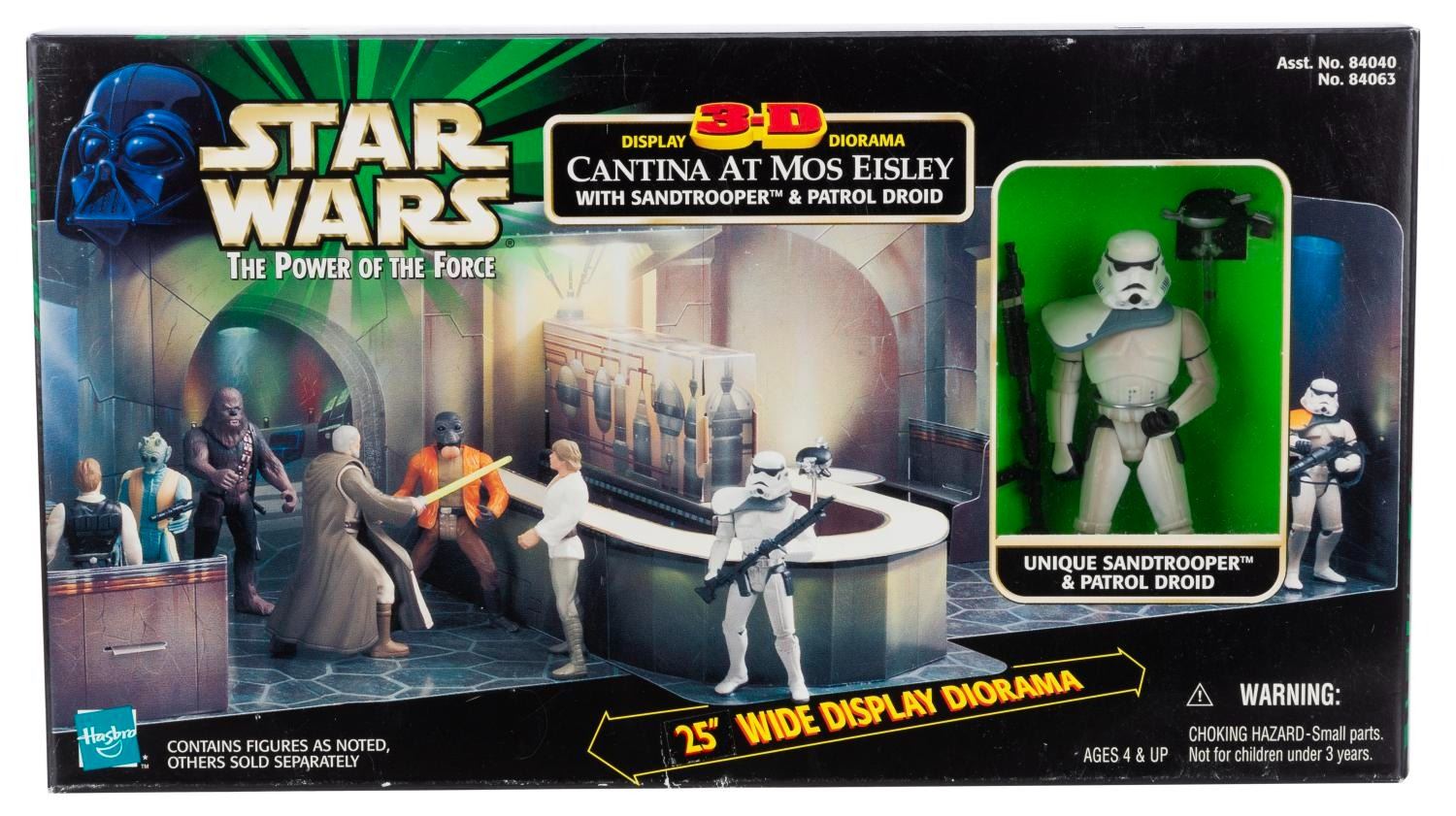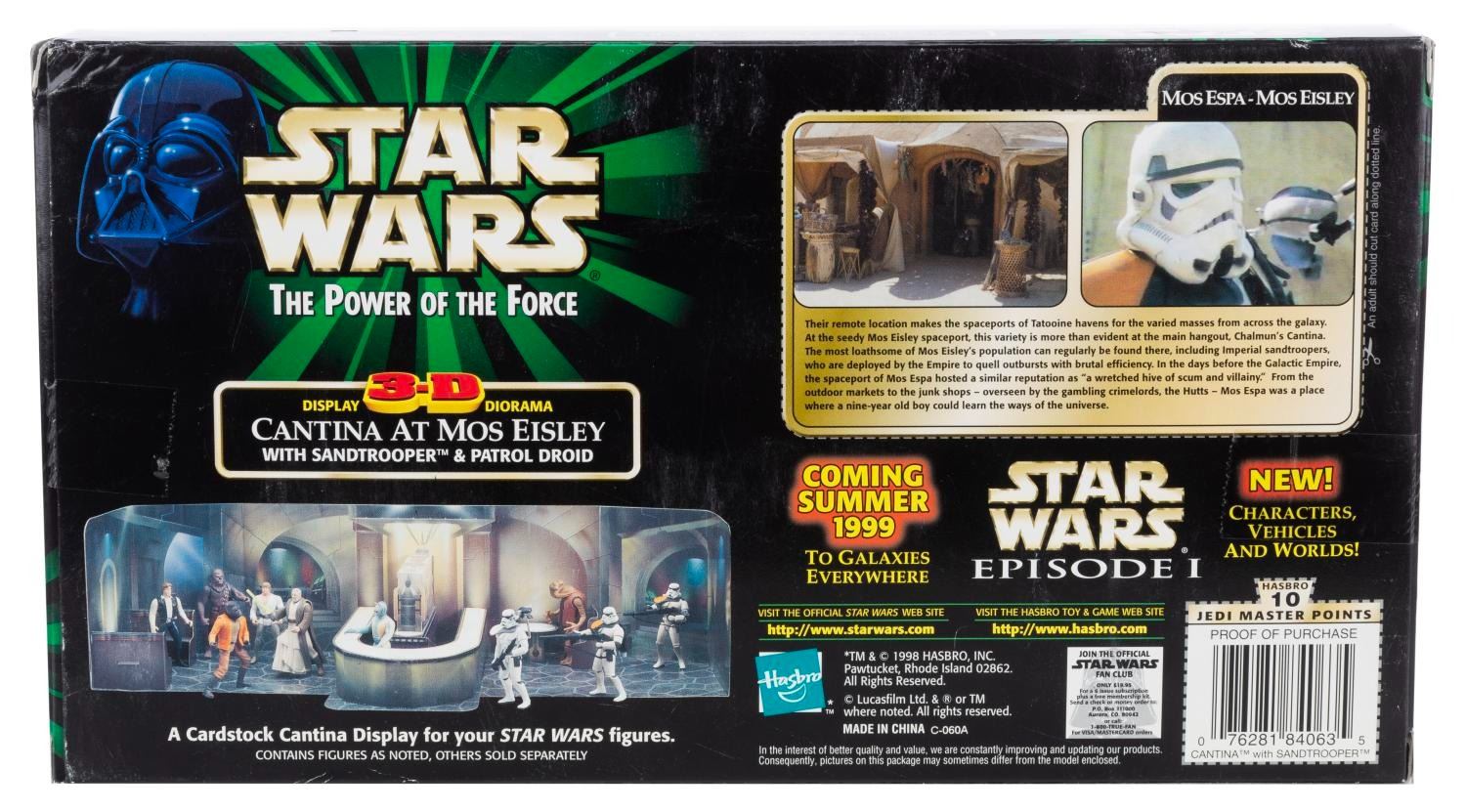 (Hasbro, 1998) A Power of the Force cardboard display diorama of the Cantina from “Star Wars,” with a unique sandtrooper figure and patrol droid. The set is in fine condition in the 12” x 6.5” x 1.75” good condition box with typical handling wear.