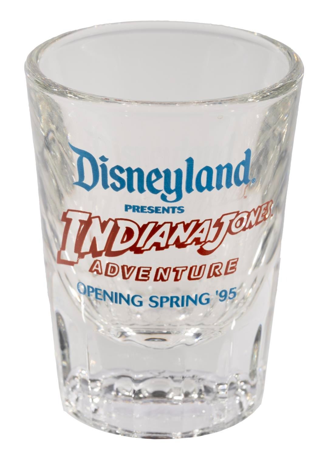 (Disneyland, 1995) A Pre-Opening "Disneyland Presents Indiana Jones Adventure" shot glass. Measuring 3" tall and 2.25" in diameter, this 2 Oz. shot glass is in fine condition.