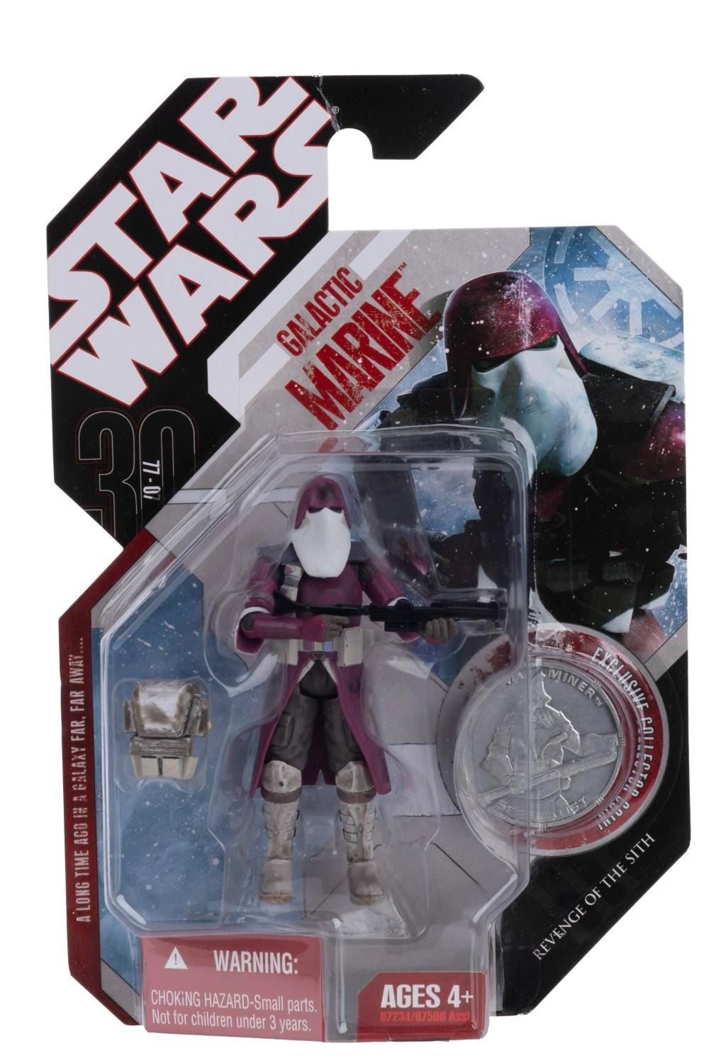 (Hasbro, 2006) A pre-production Star Wars 30th anniversary Galactic Marine action figure sealed on the original card. The figure is packaged with a non-matching Lava Miner coin. Measuring 2.25” x 4” in the original 6” x 9” packaging, the unopened toy is in fine condition.