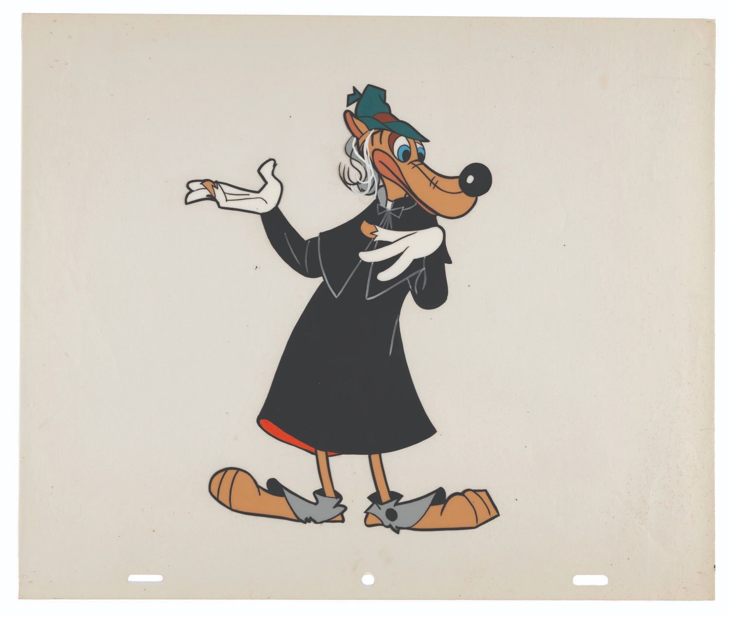 (Clampett, 1970s-80s) An original hand-painted presentation cel of William Shakespeare Wolf, used by Bob Clampett for events and presentations. With an image size of 6” x 8” on a 10.5” x 12.5” cel, the piece displays in very good condition with scratches, wear, pinholes from presentation use, and paint adhered to the backing paper.